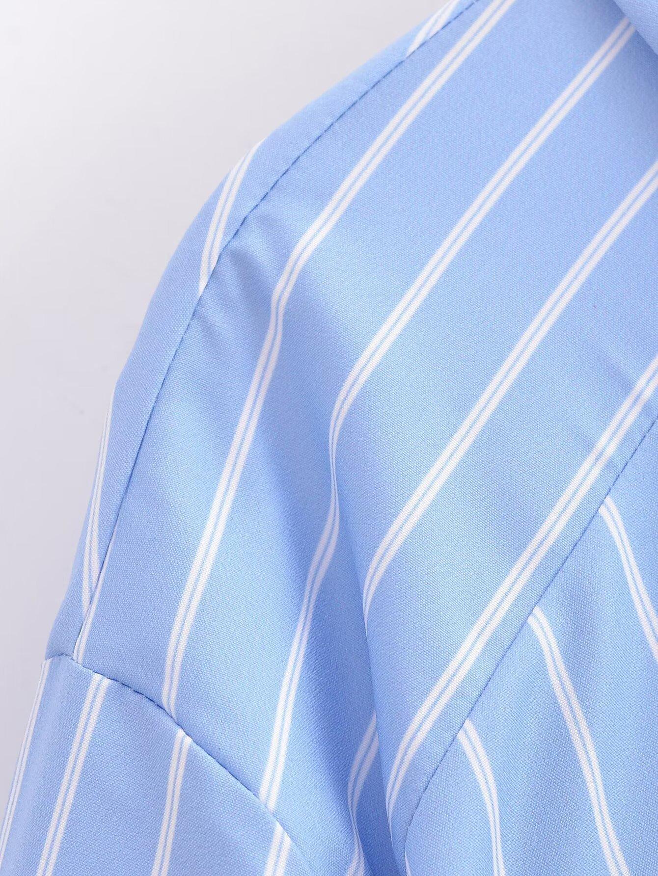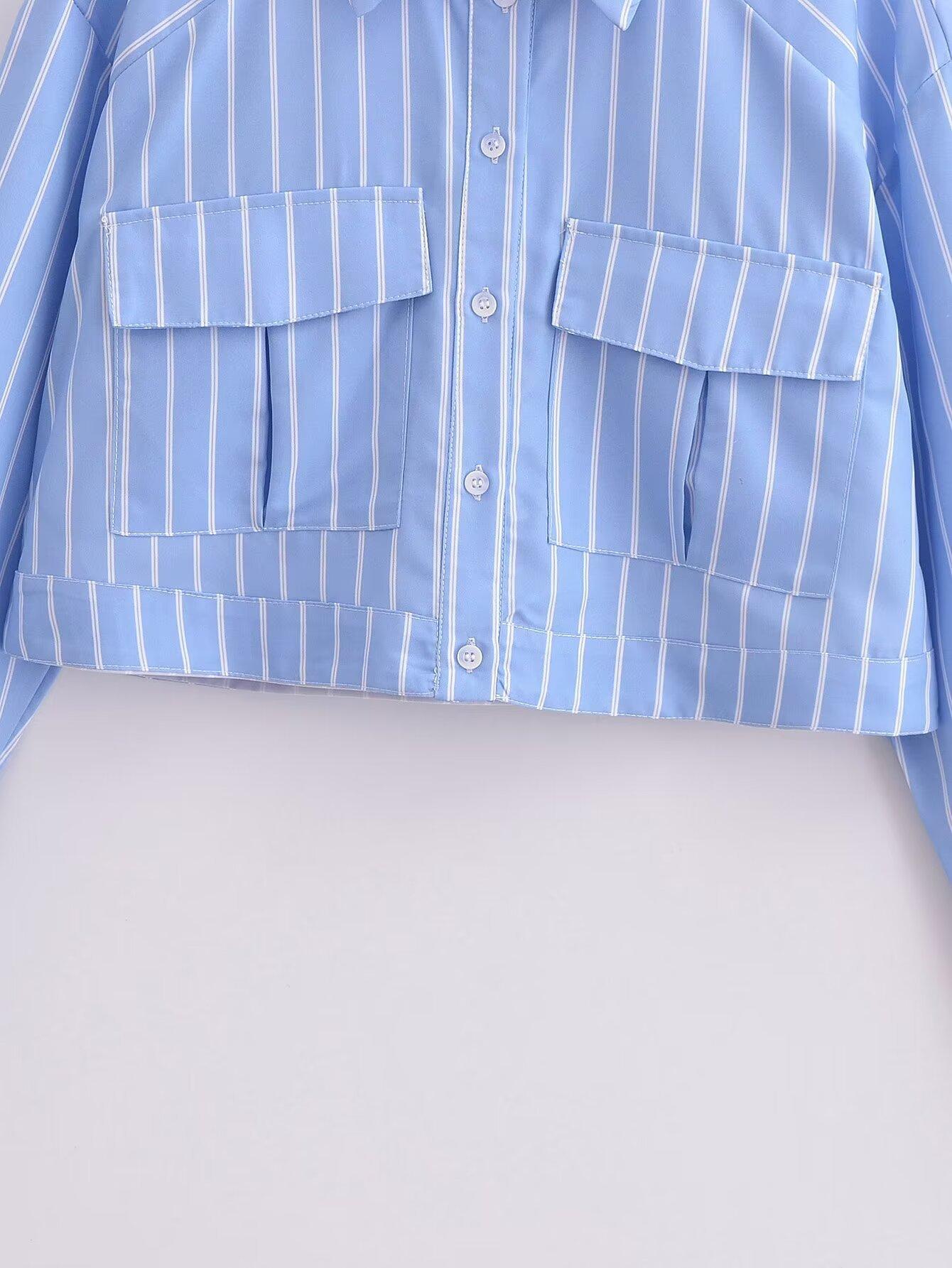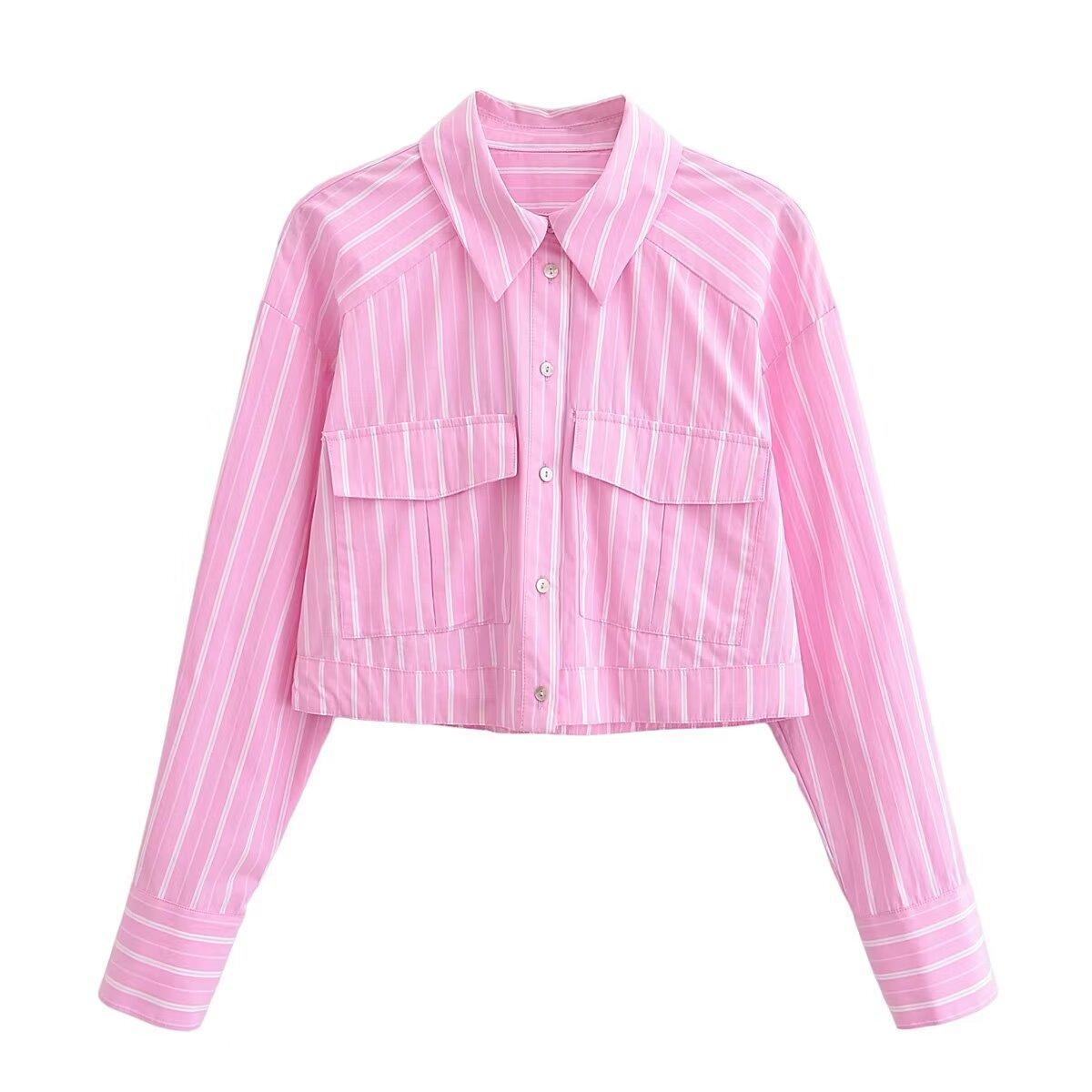 Camisa de manga larga de popelina corta a rayas con solapa personalizada para mujer, estilo transfronterizo europeo y americano, primavera y verano 2024