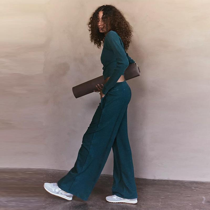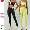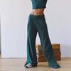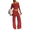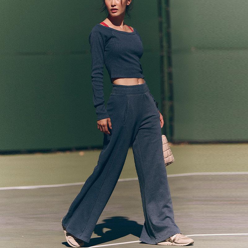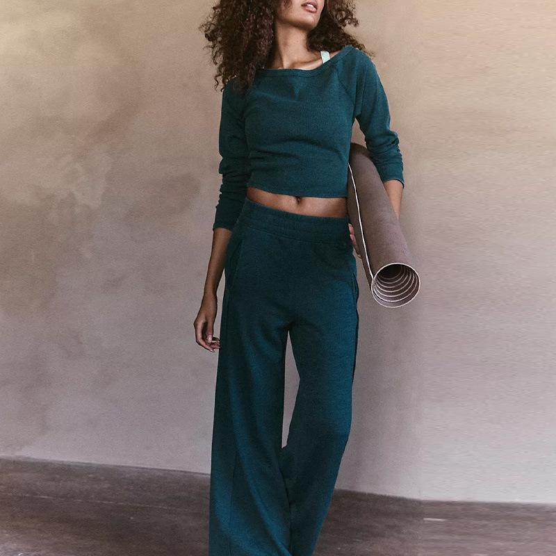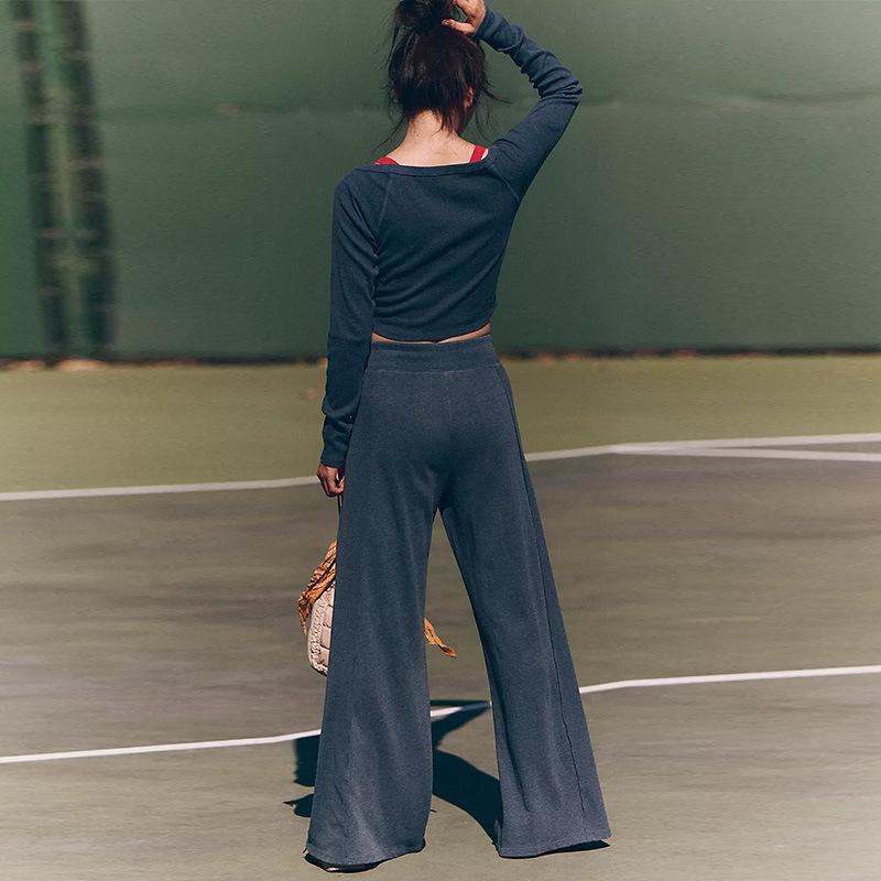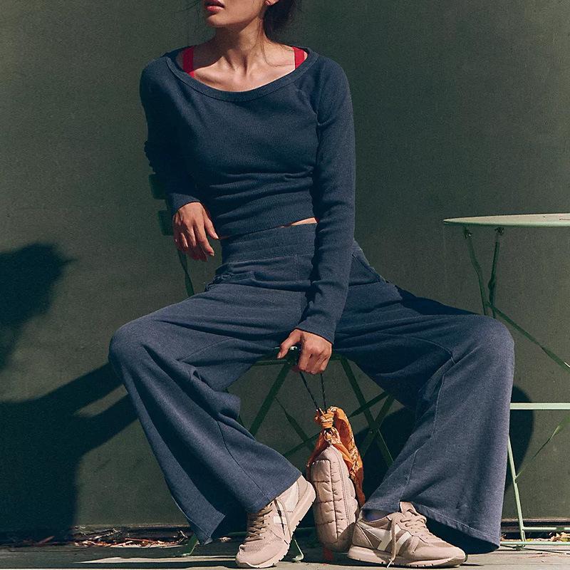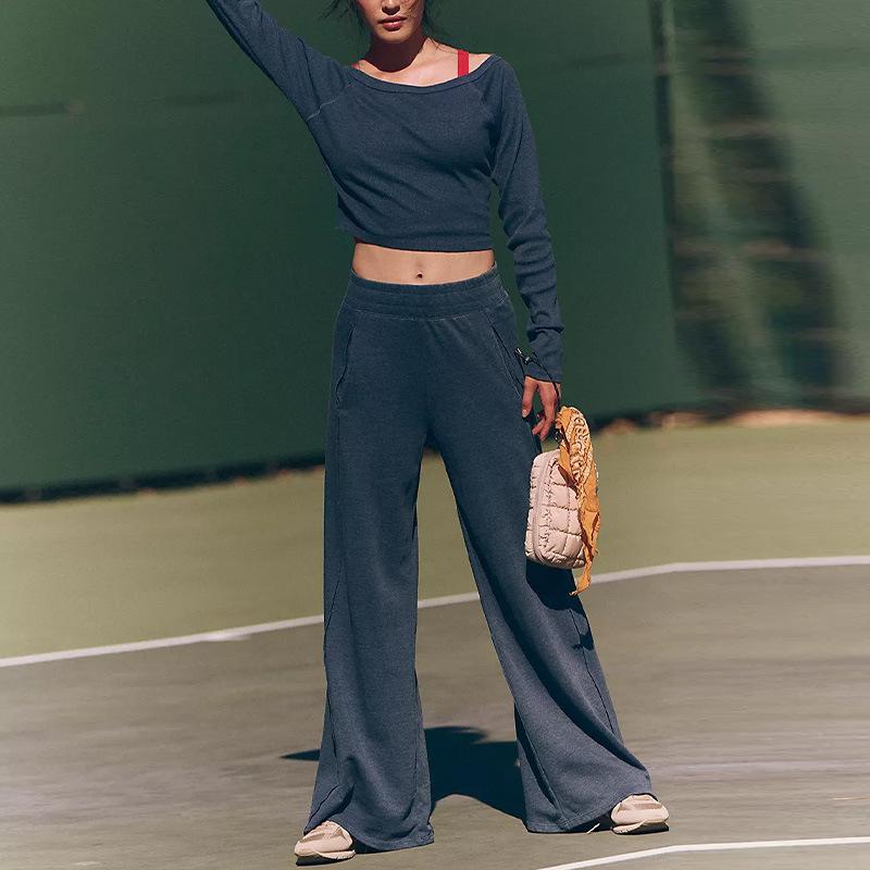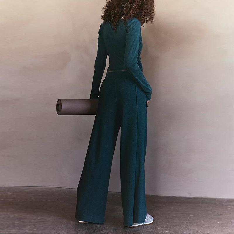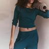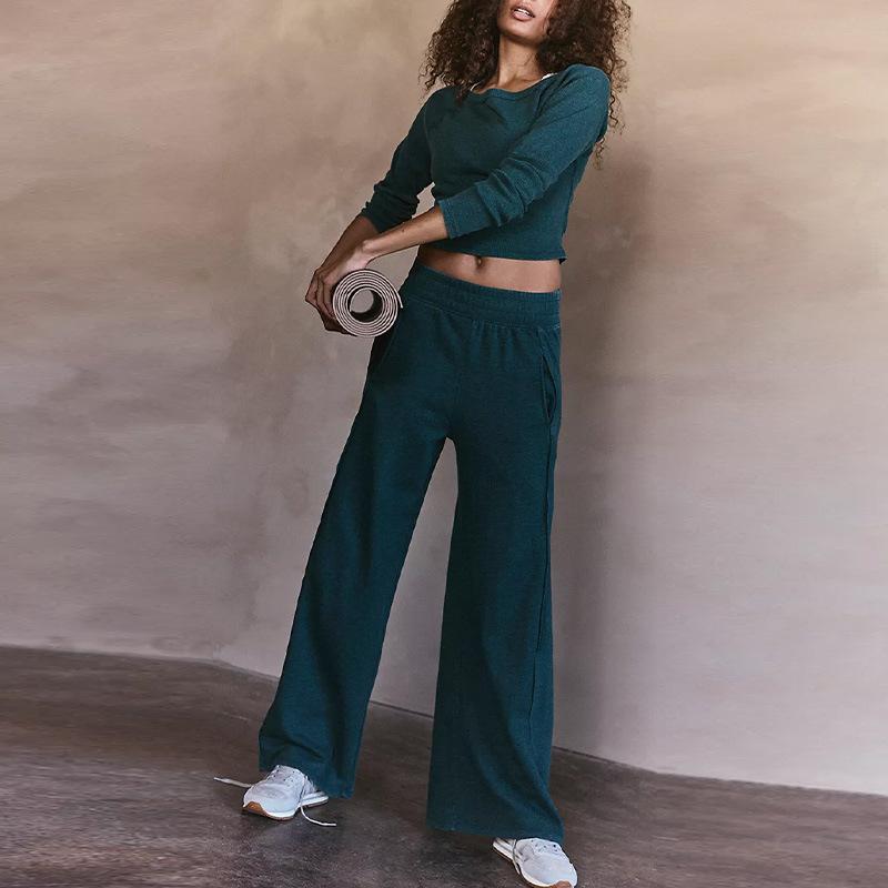 Top de yoga de manga larga europeo y americano transfronterizo, pantalones anchos deportivos de exterior de alta elasticidad, traje deportivo de fitness para mujer de color sólido con ombligo