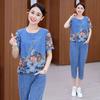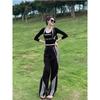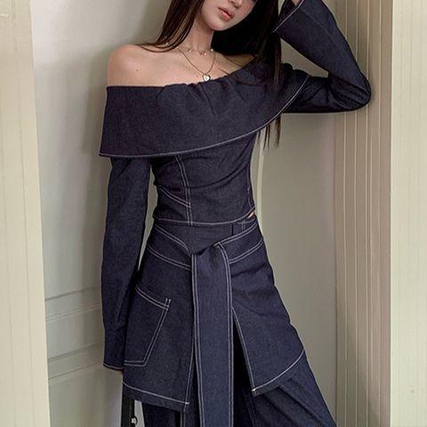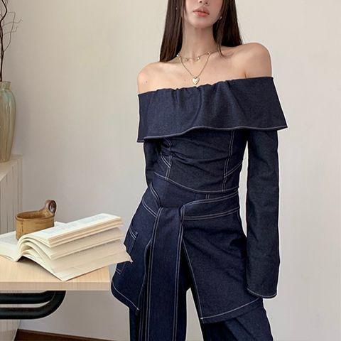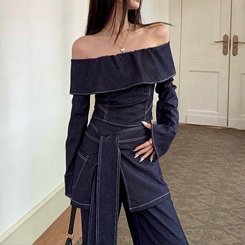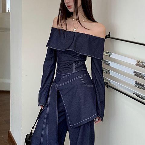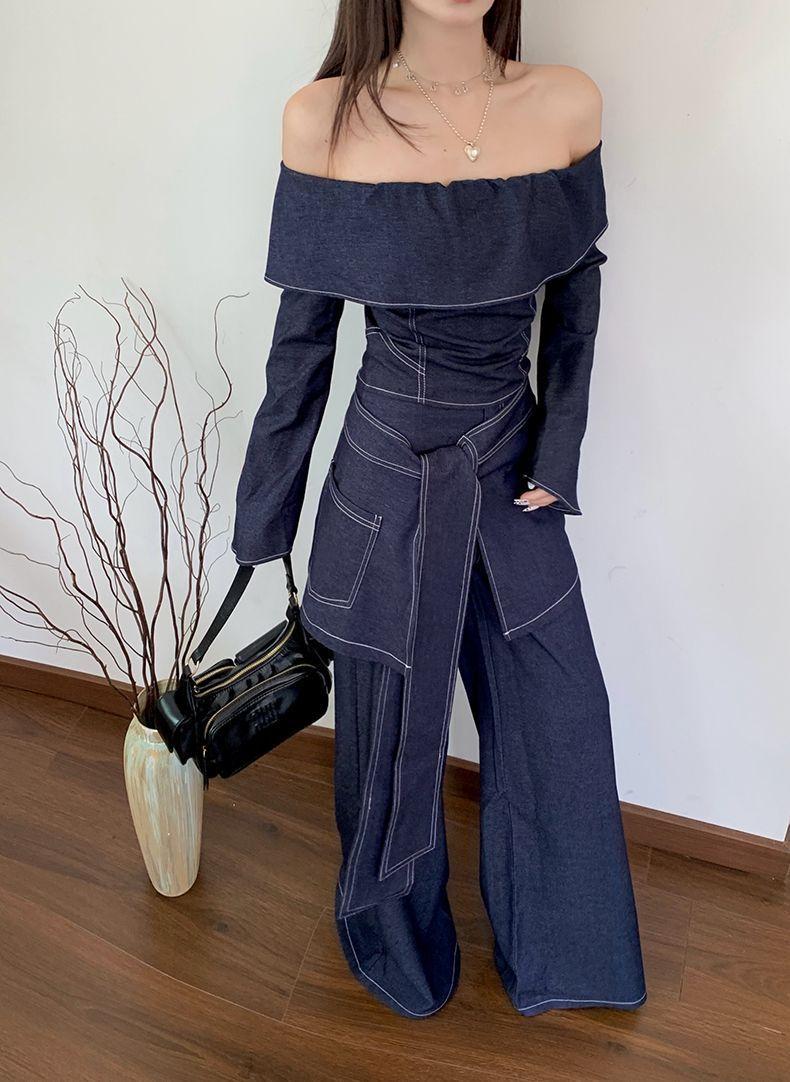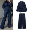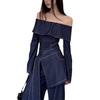 American Vintage Agua de Lavado Color Sólido Denim Top de Hombro para Mujer Otoño Cintura Alta Pantalones de Pierna Ancha Cortina de Pedos Conjunto de Moda de Tres Piezas