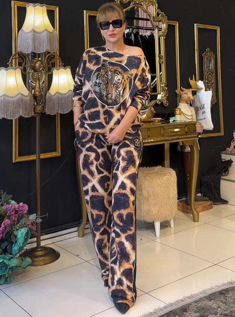 Otoño 2024, moda europea y americana transfronteriza de Amazon para mujer, top con estampado de leopardo, pantalones, traje holgado informal