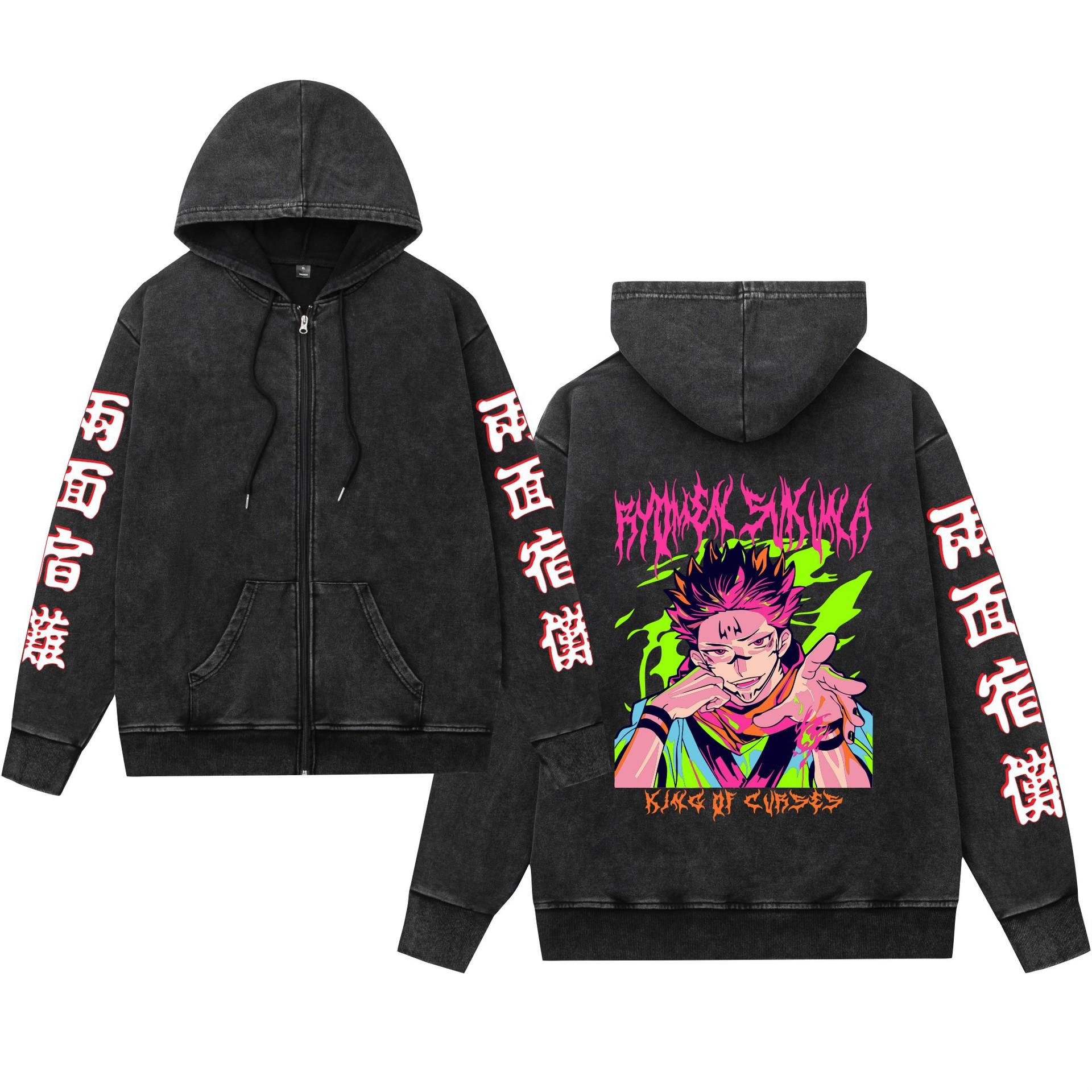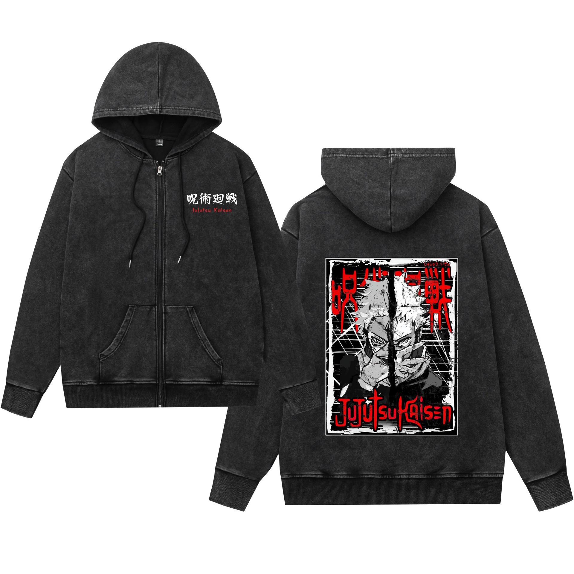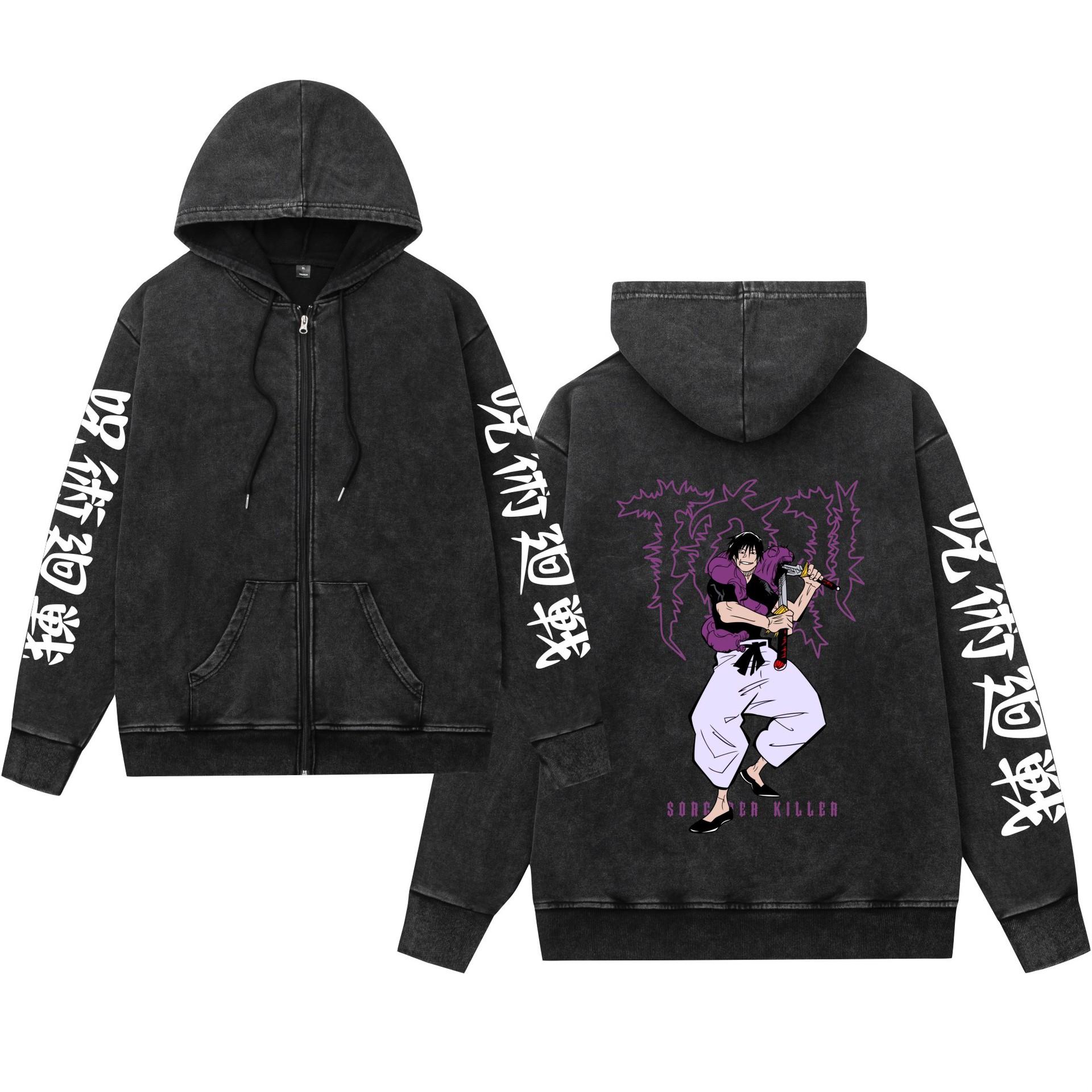 Sudadera Retro Lavada de Comercio Exterior Jujutsu Kaisen Batalla de Hechizos con Capucha y Cierre Impresa para Hombre y Mujer