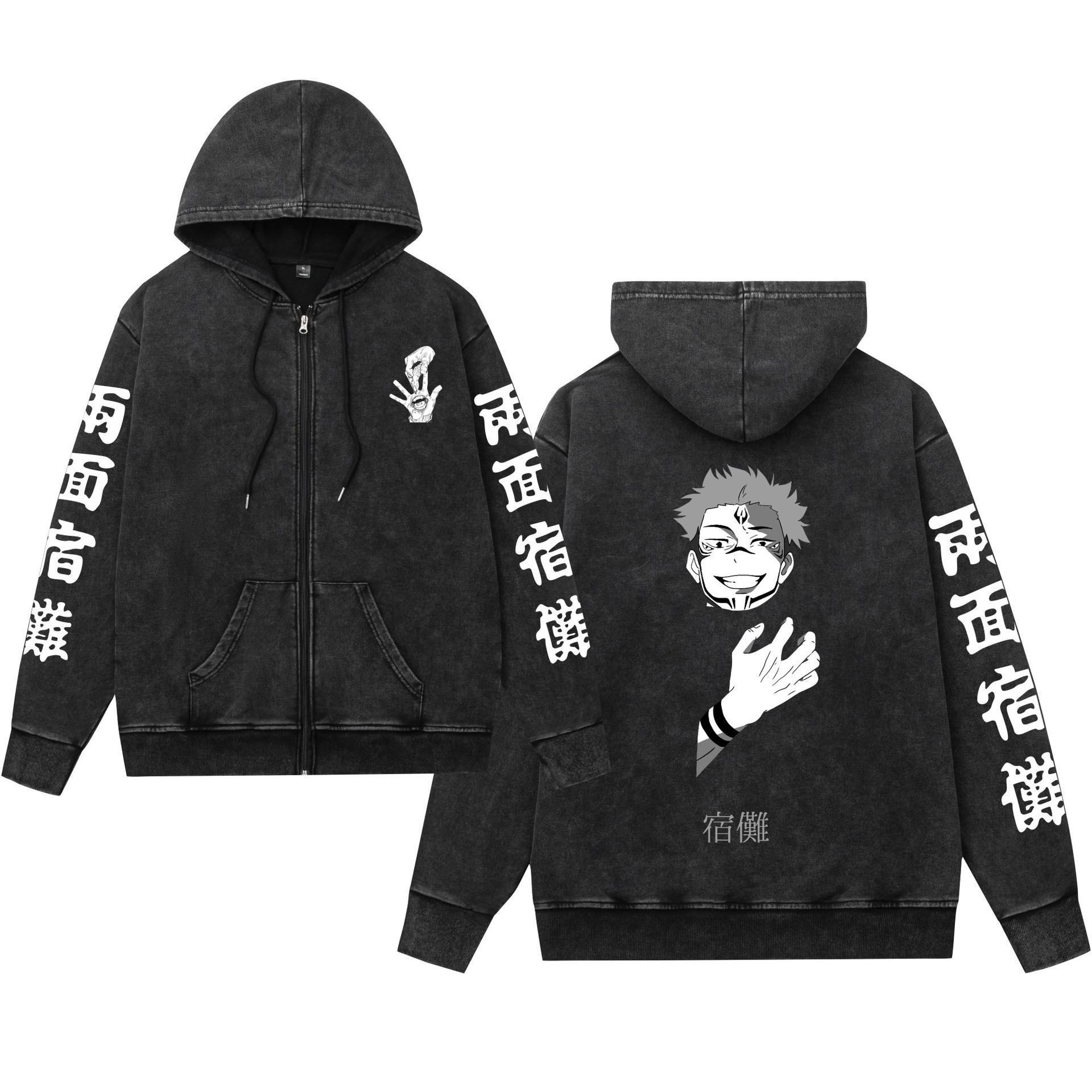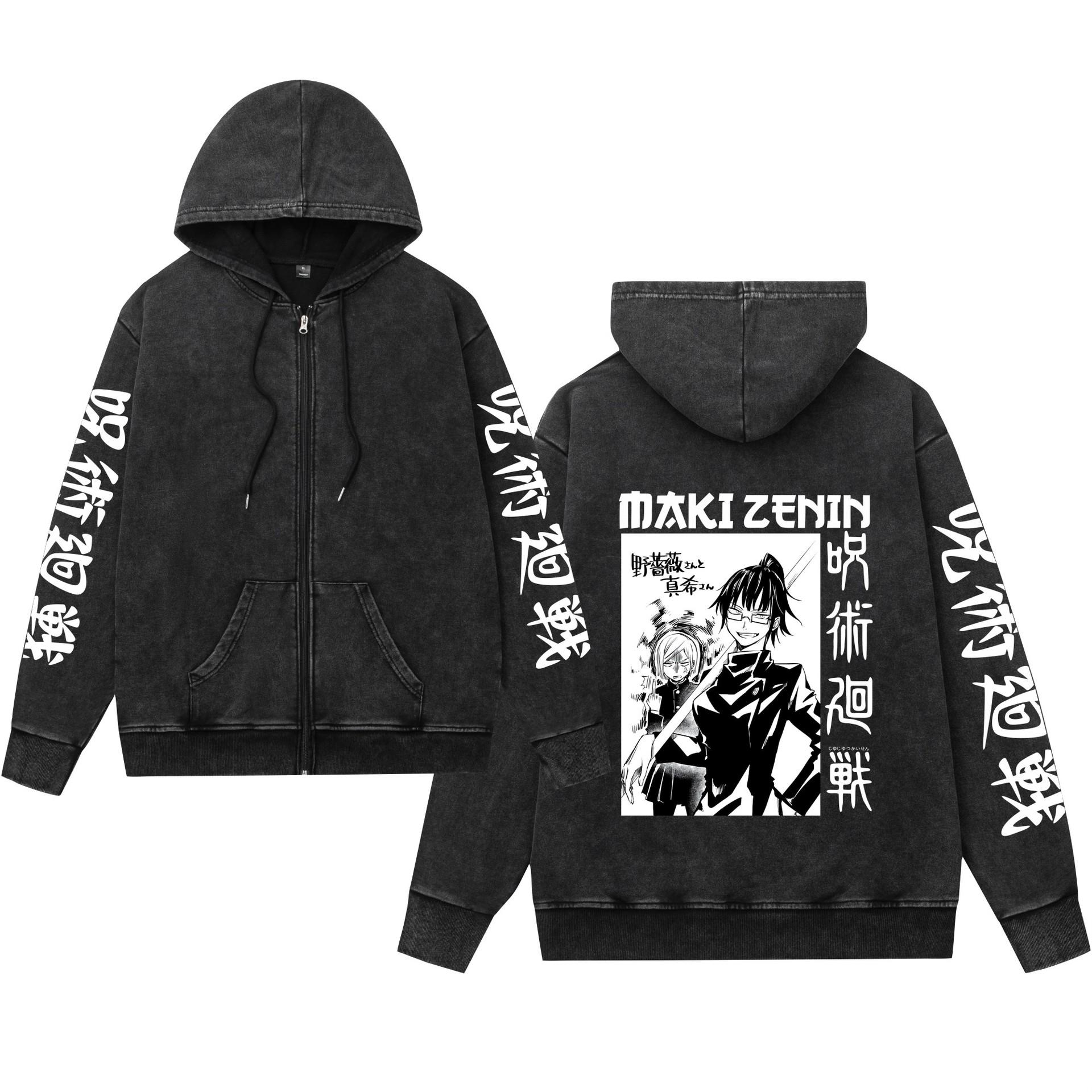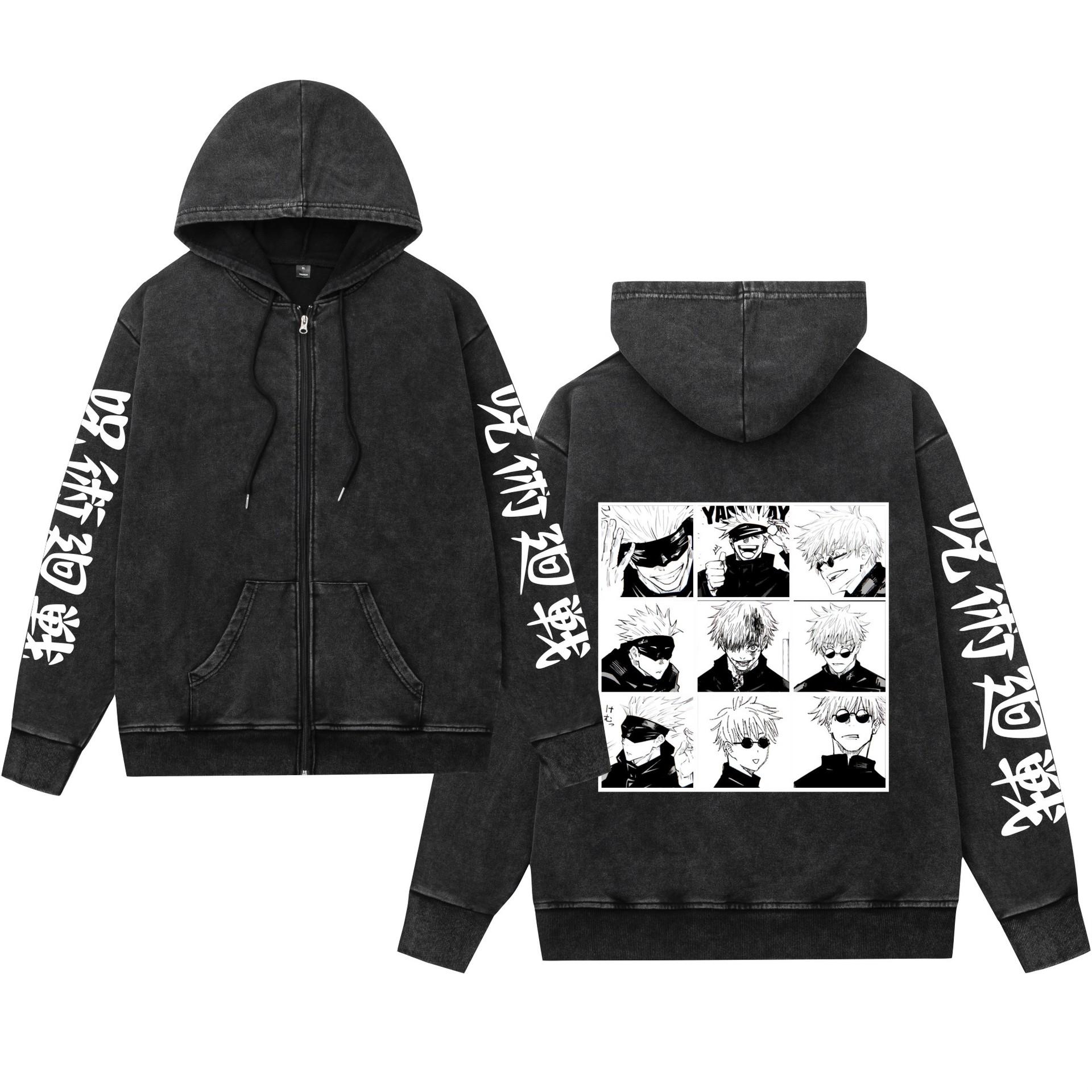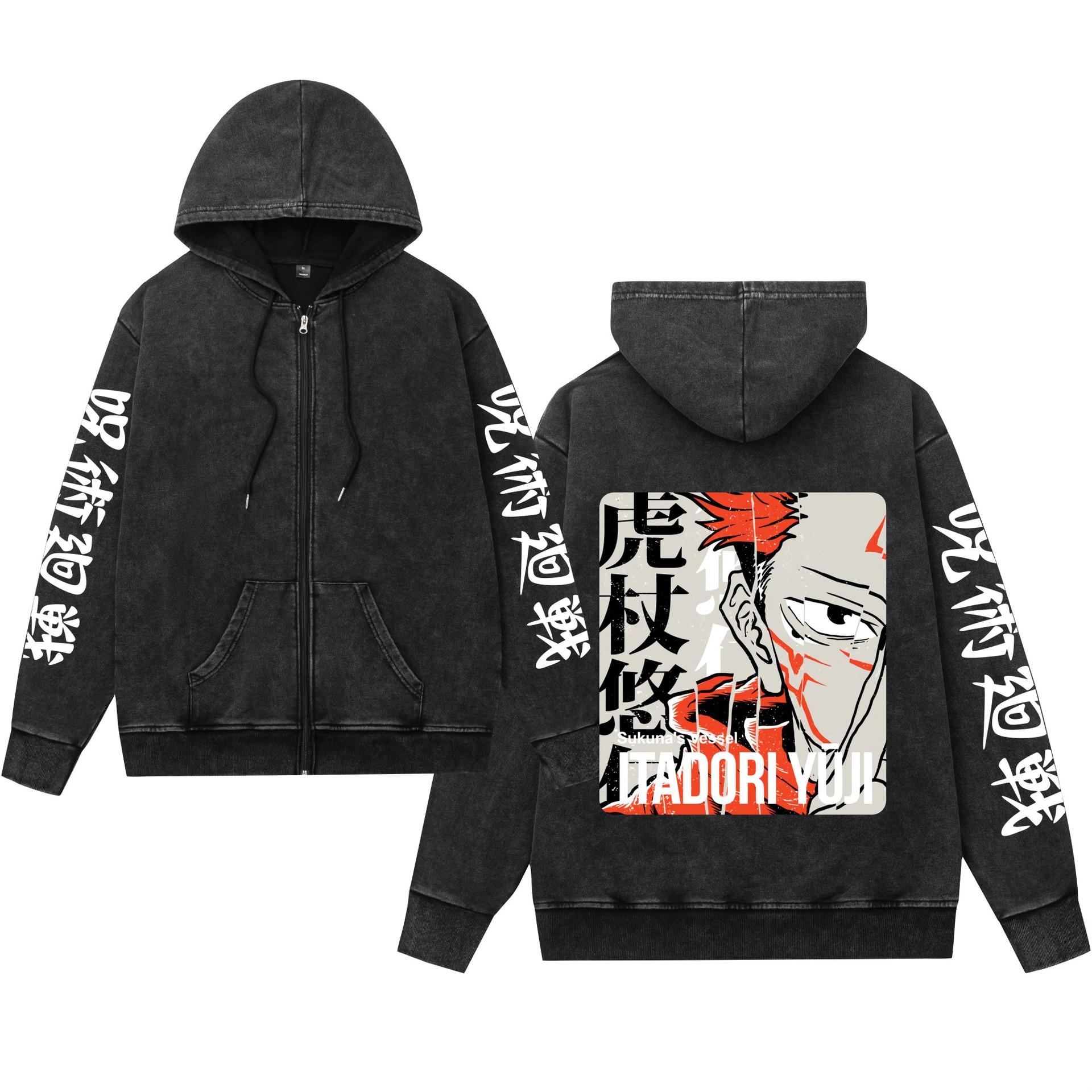 Sudadera Retro Lavada de Comercio Exterior Jujutsu Kaisen Batalla de Hechizos con Capucha y Cierre Impresa para Hombre y Mujer