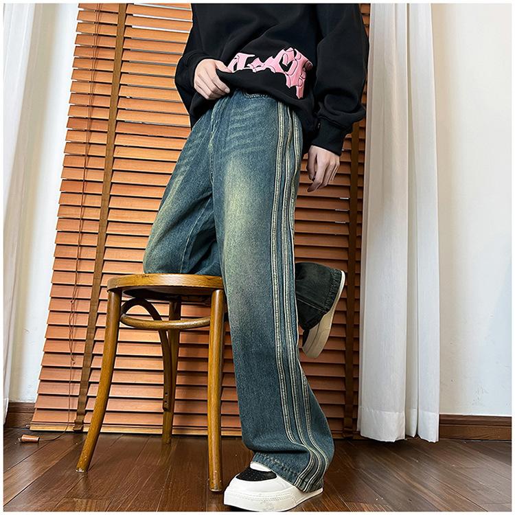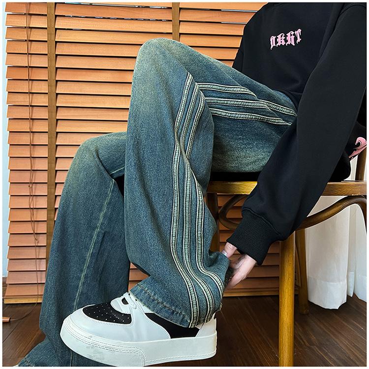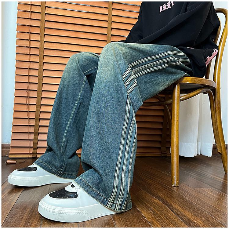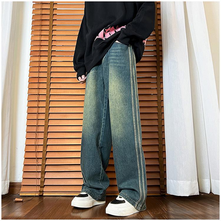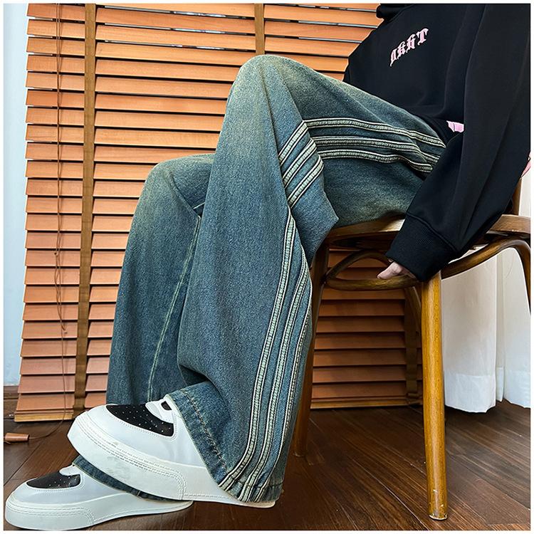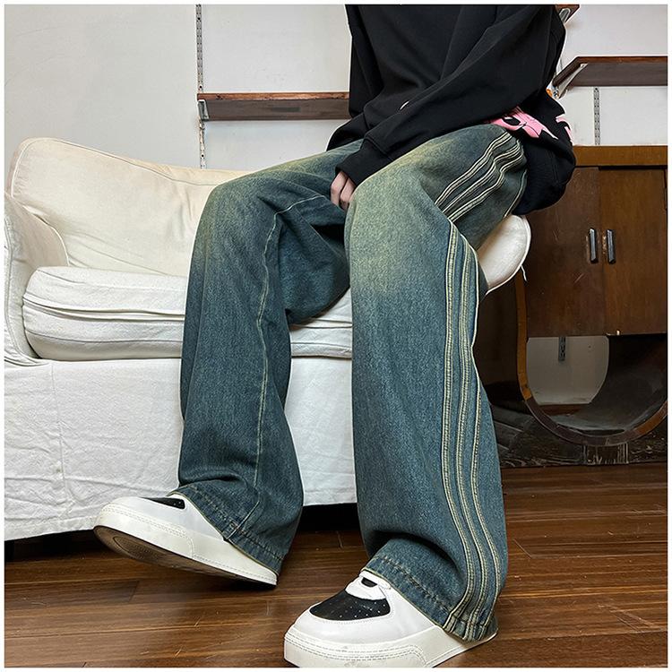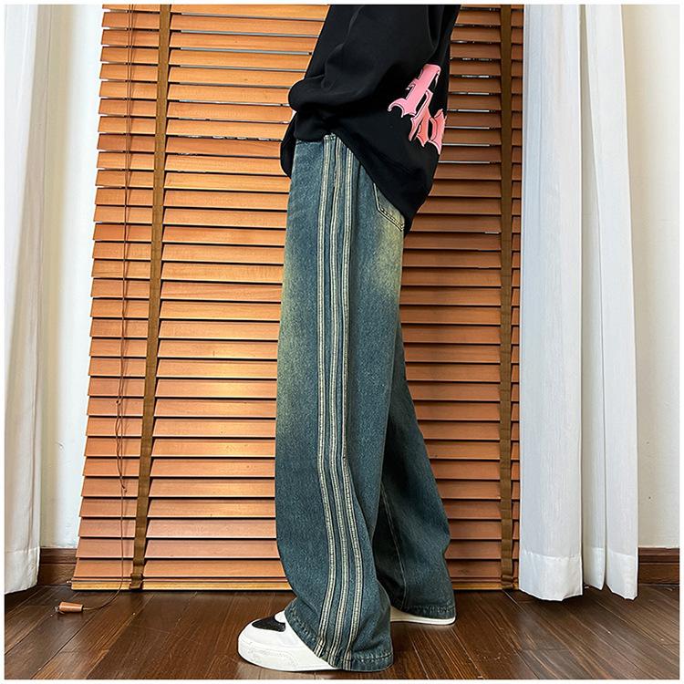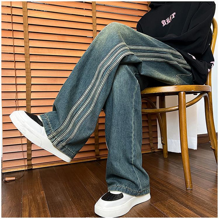Pantalones vaqueros retro de estilo americano para hombre, de marca de moda, de primavera y otoño, con rayas antiguas, holgados, rectos y de pierna ancha.