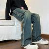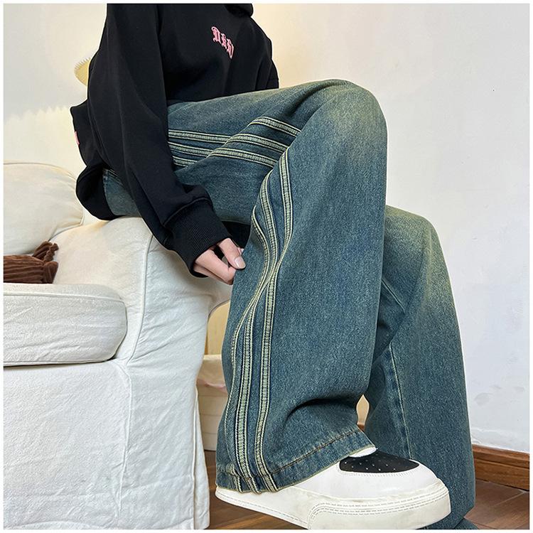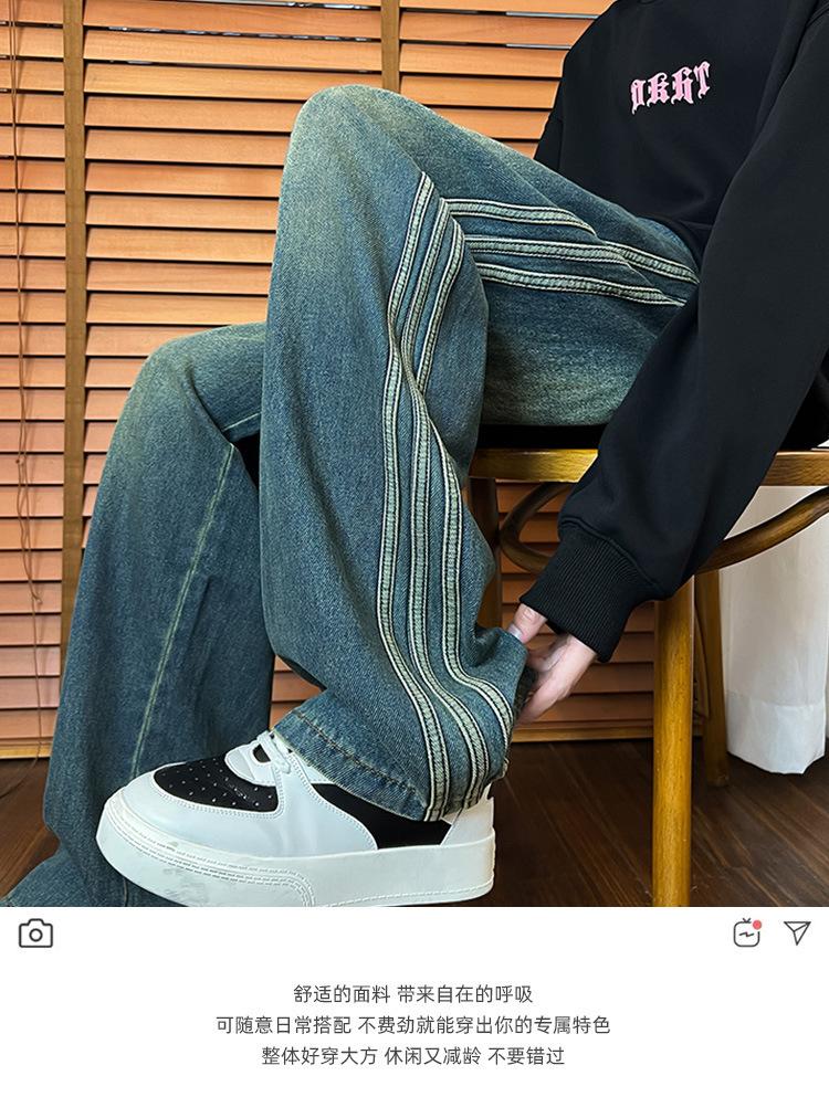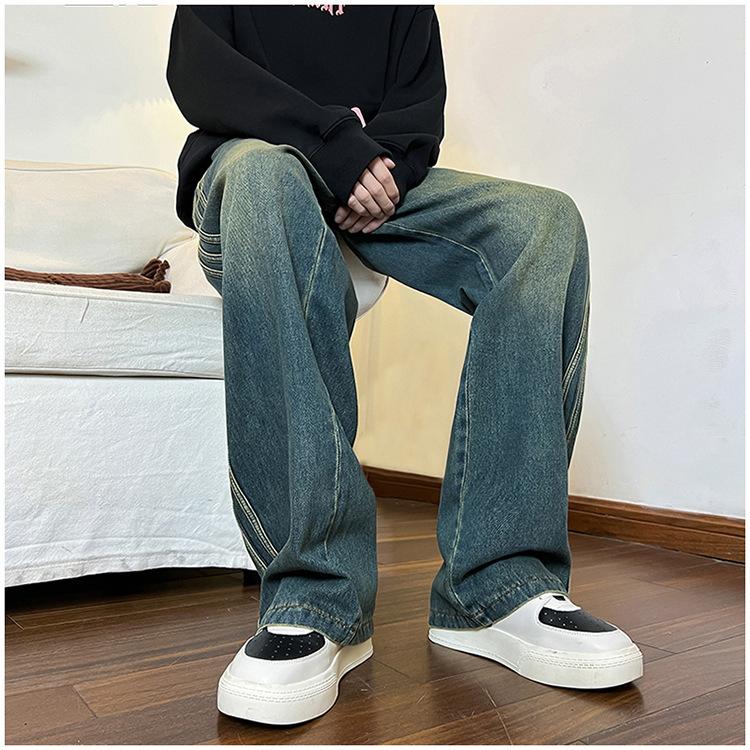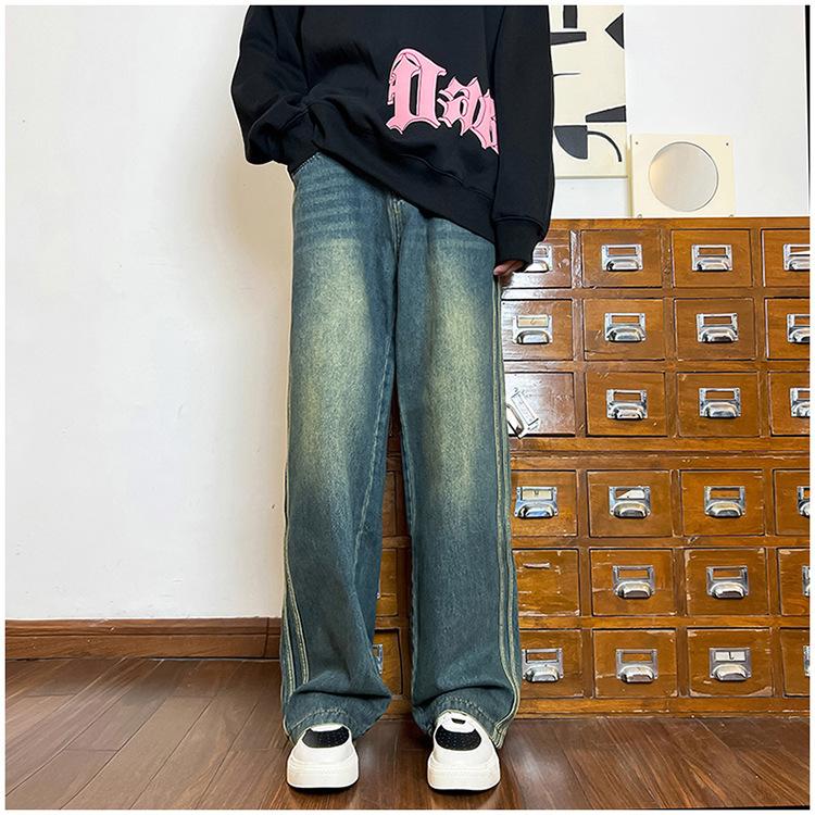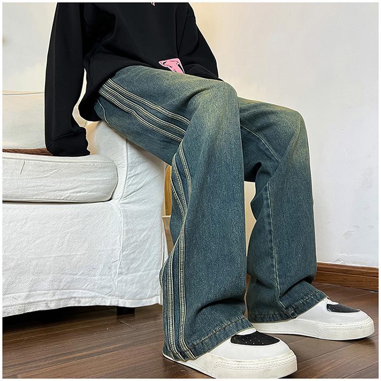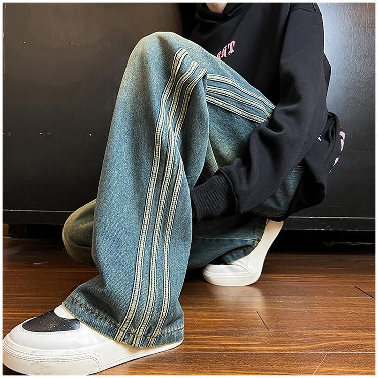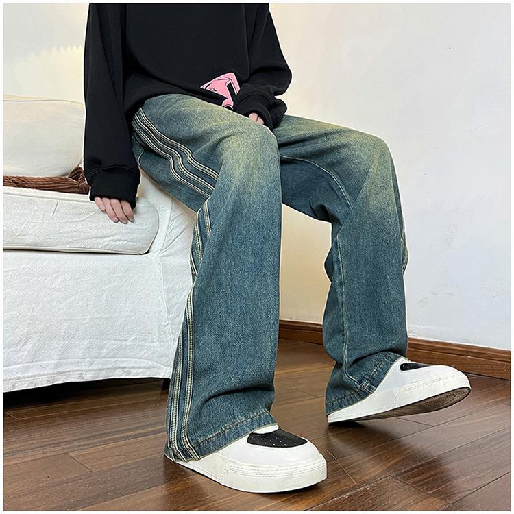 Pantalones vaqueros retro de estilo americano para hombre, de marca de moda, de primavera y otoño, con rayas antiguas, holgados, rectos y de pierna ancha.