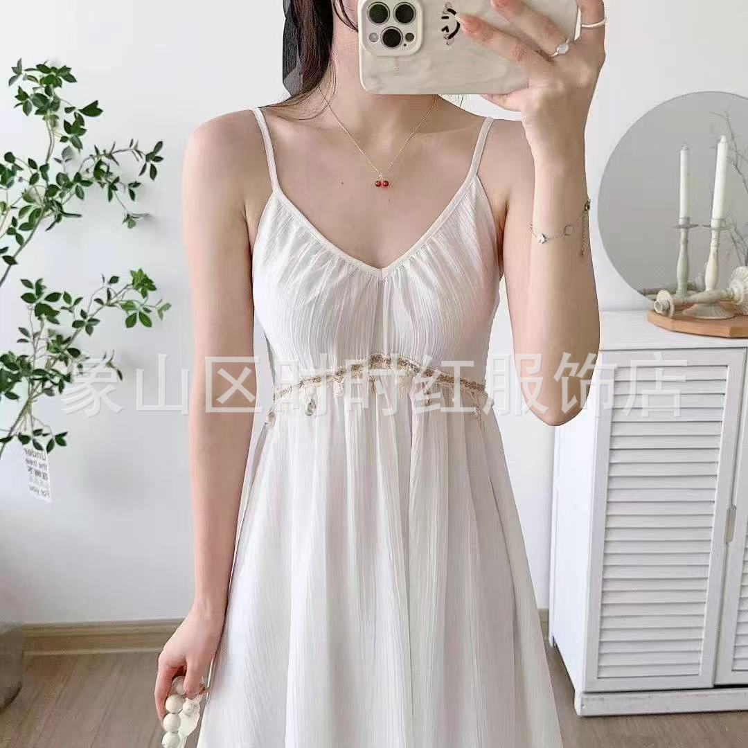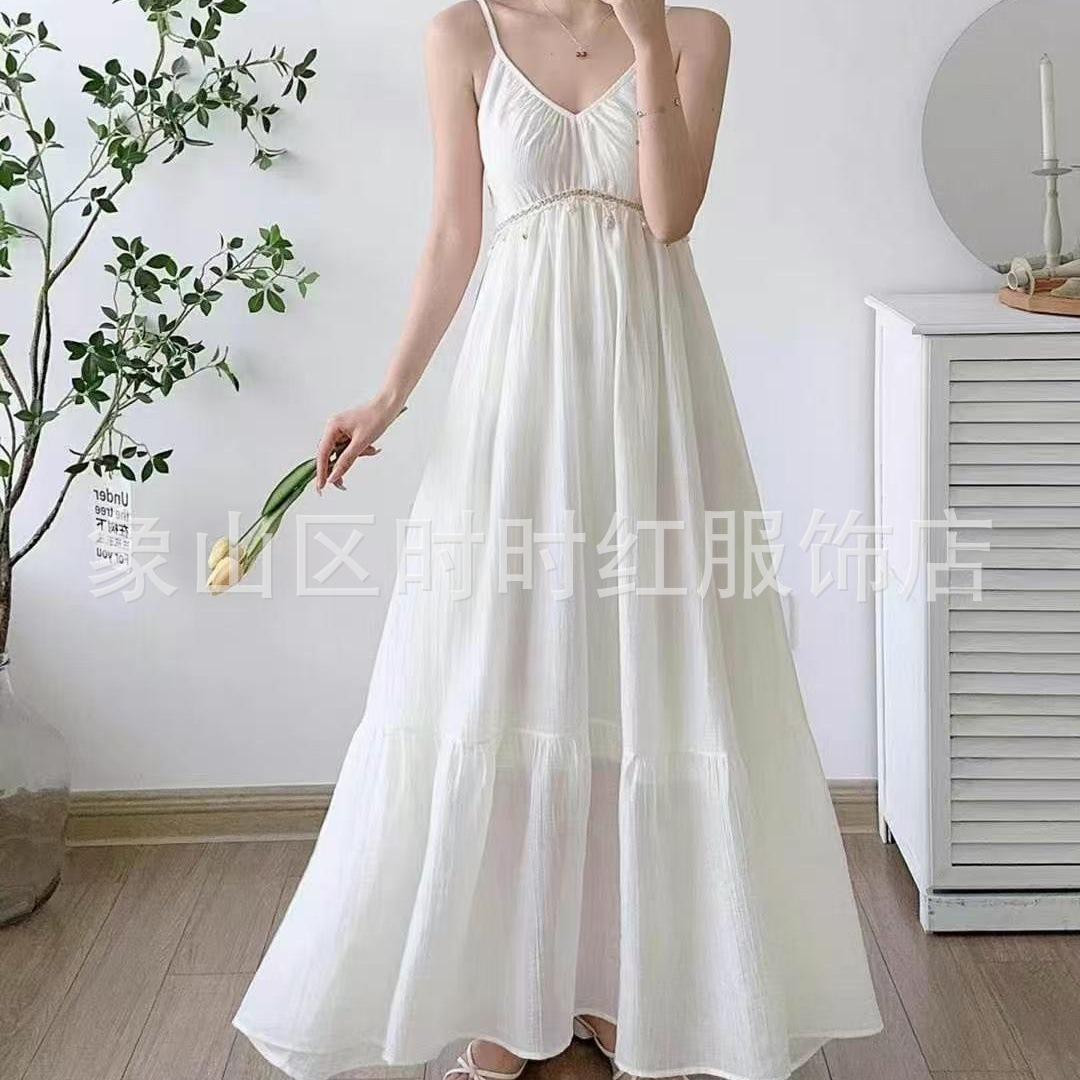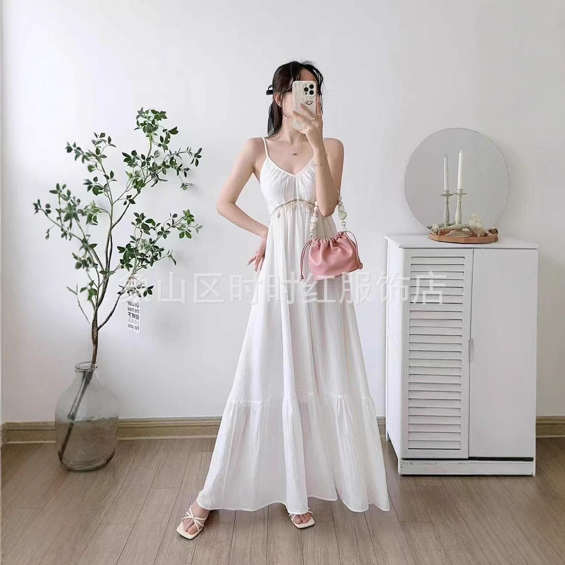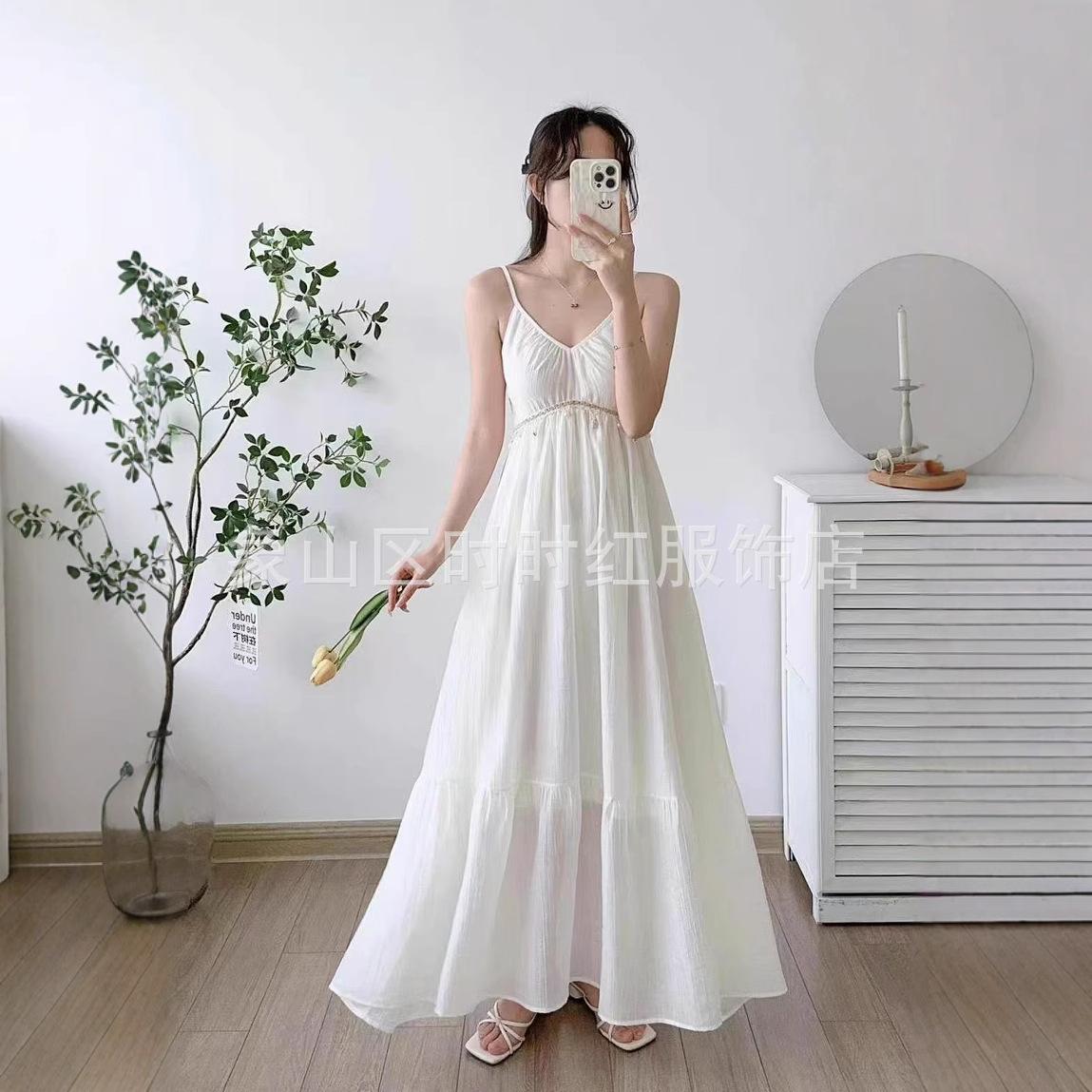 Vestido de vacaciones nuevo 2025, elegante, de diseño social, francés, con escote en V, sexy, sin espalda, con tirantes para mujer
