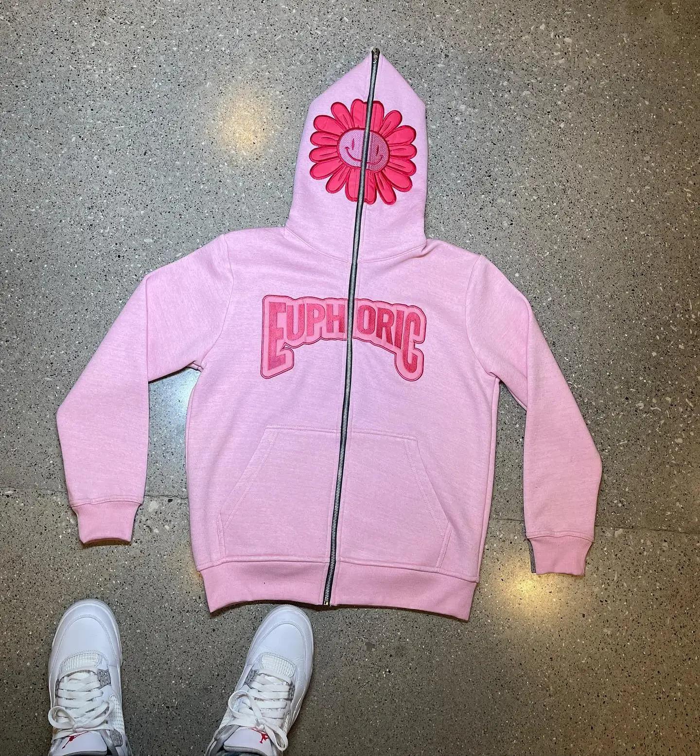 2025 Cárdigan con Capucha y Cremallera Larga EUPHORIC Estampado de Flor Smiley Otoño e Invierno Top Holgado para Pareja
