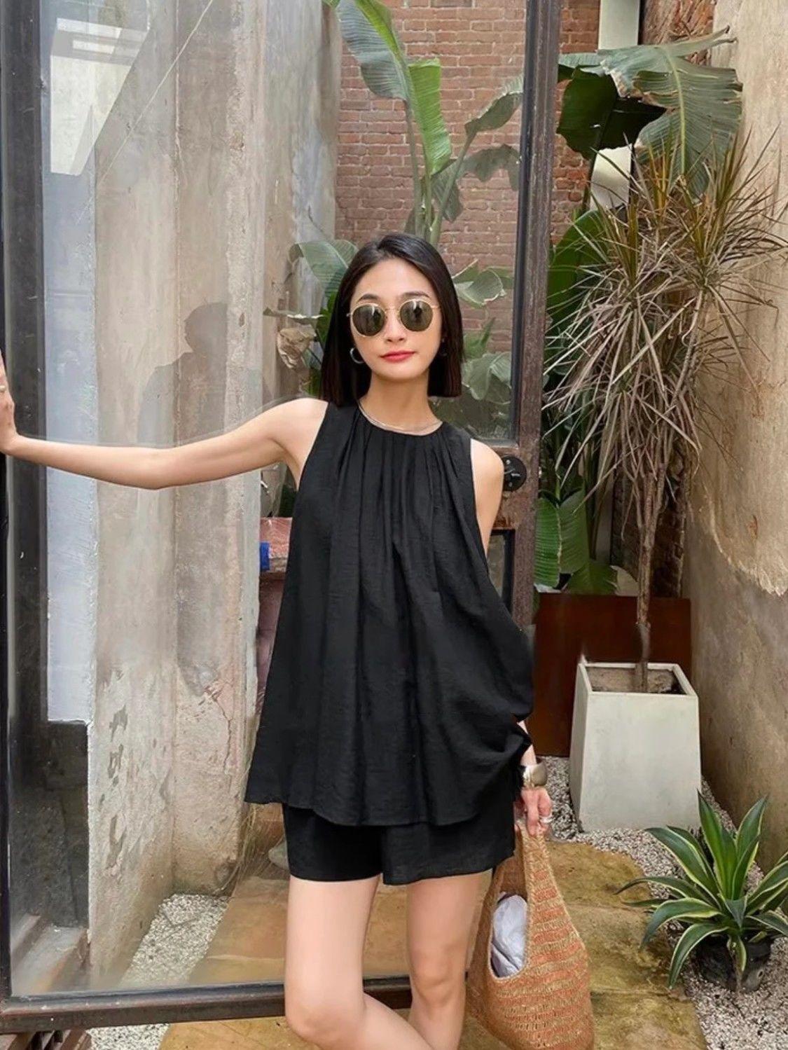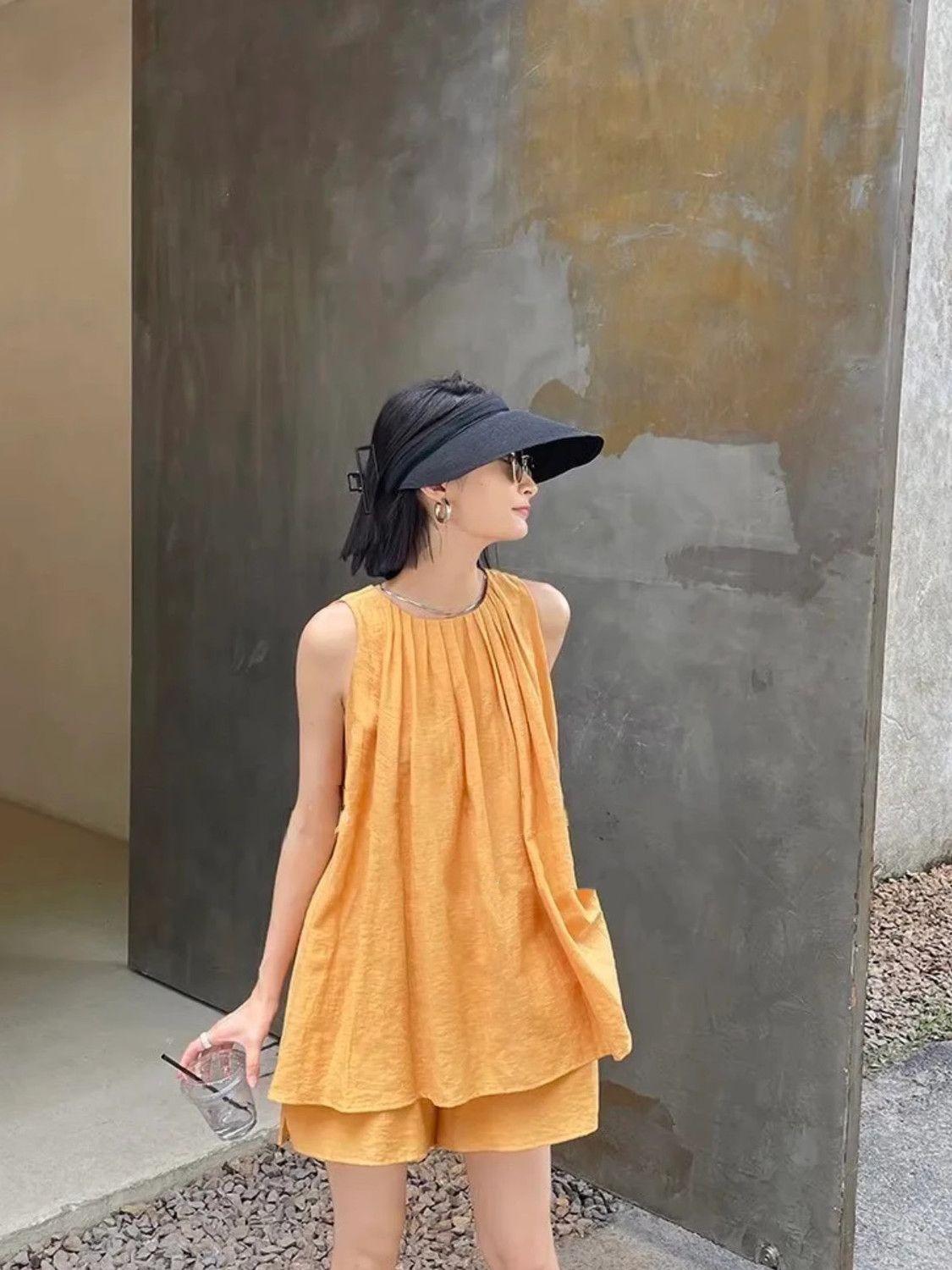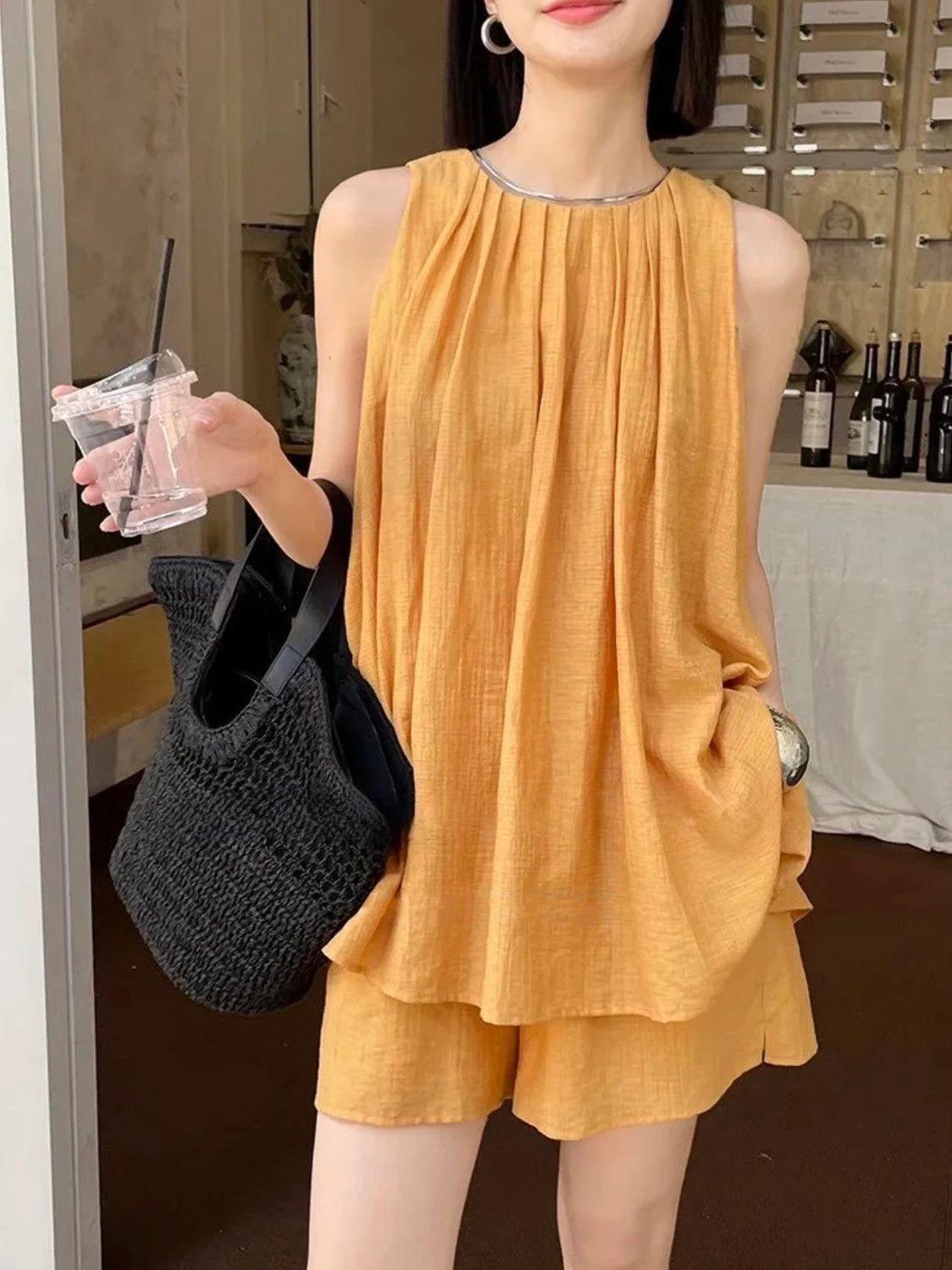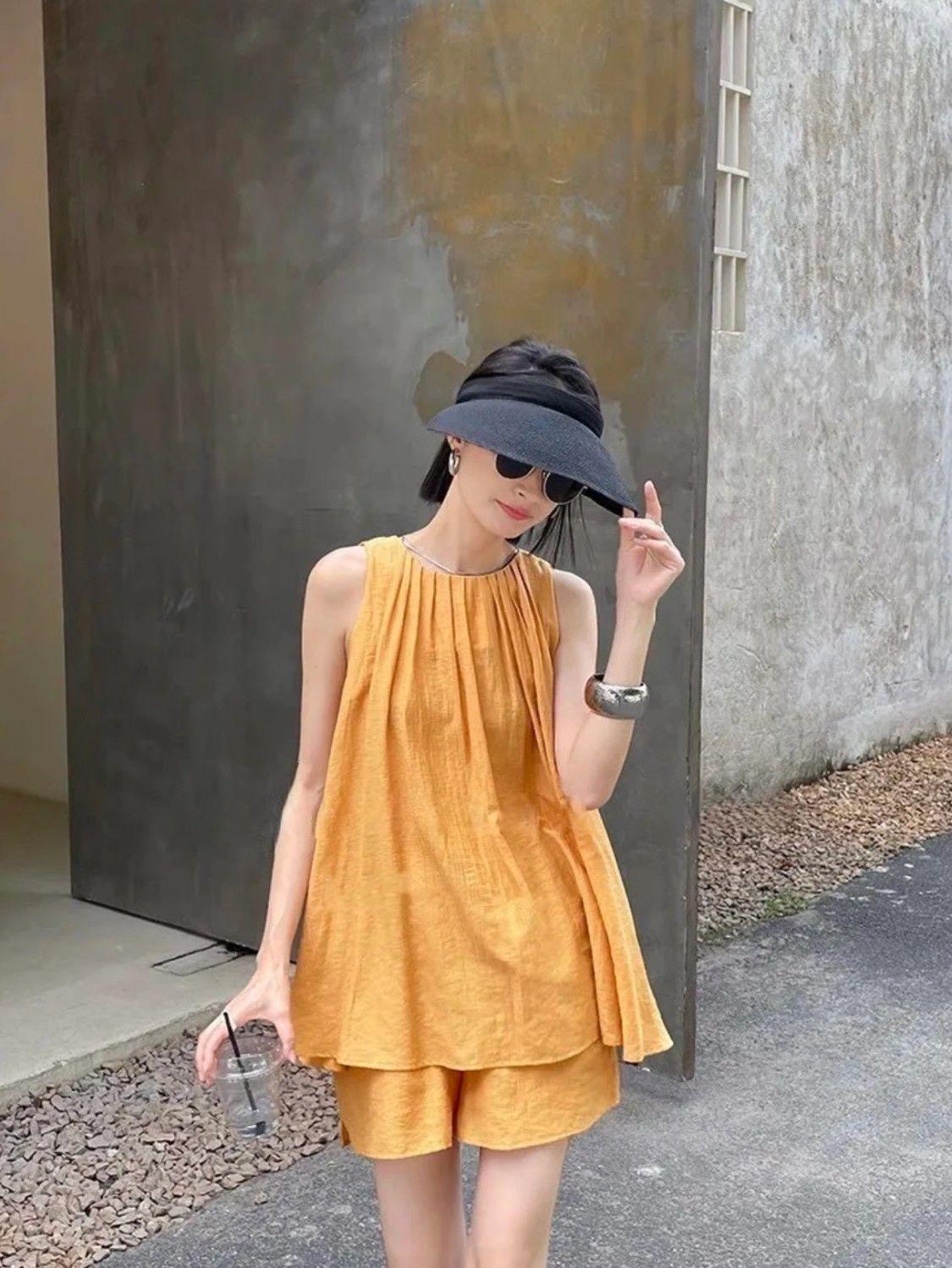 Traje de algodón y lino para mujer, elegante chaleco sin mangas, top y pantalones cortos finos y sueltos, conjunto de dos piezas de color sólido, novedad de verano de 2024
