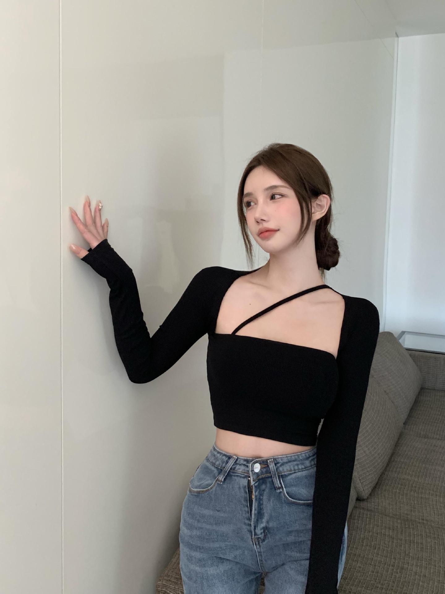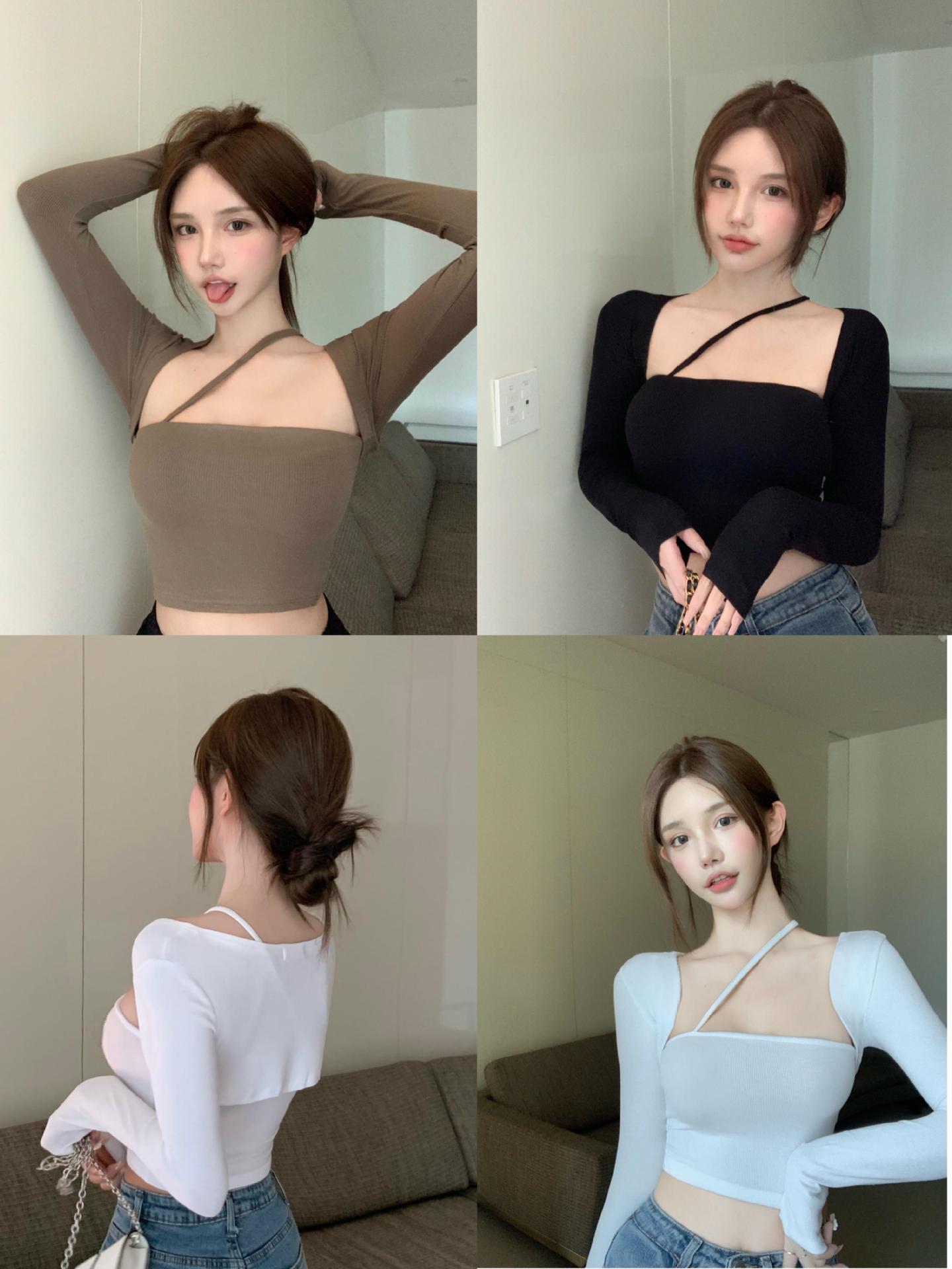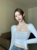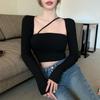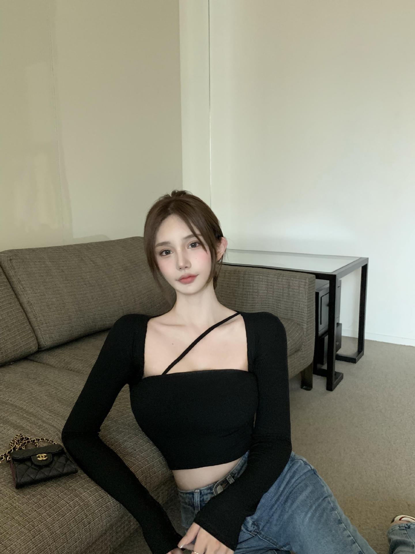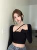 Camisa de cuello cuadrado estilo Spice Girl estilo americano Pure Desire, camisa pequeña estilo occidental, camiseta de manga larga con tirantes oblicuos para mujer.