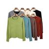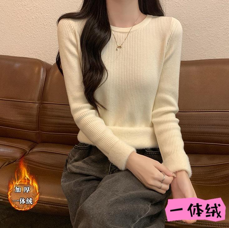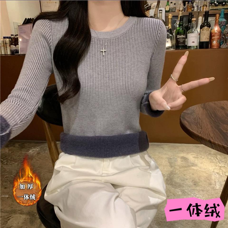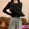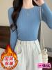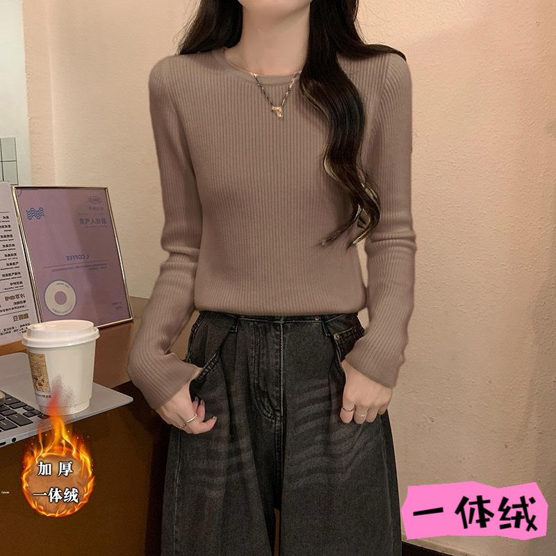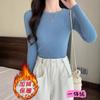 Suéter de punto para mujer, camiseta de manga larga ajustada de alta calidad con cuello redondo, base interior, gruesa y cálida, forrada de vellón para otoño e invierno