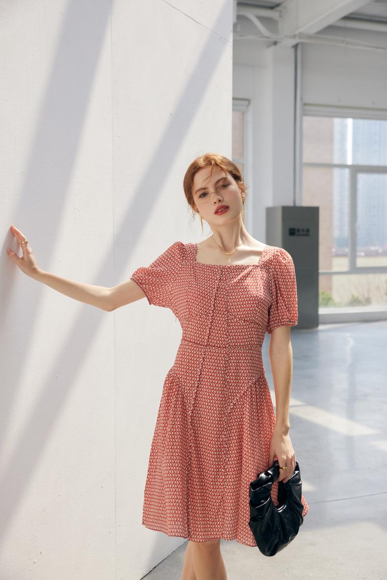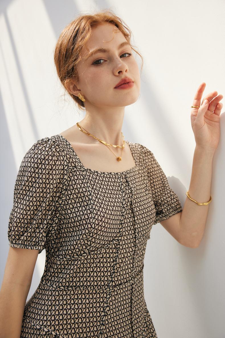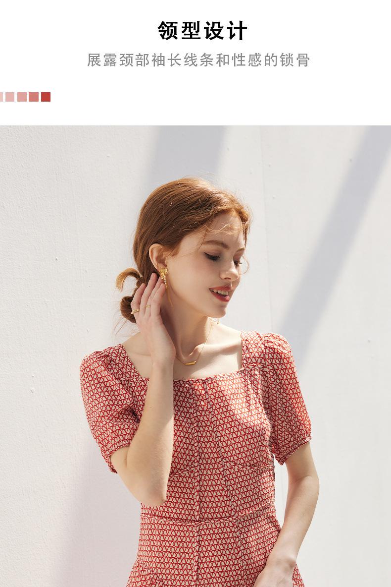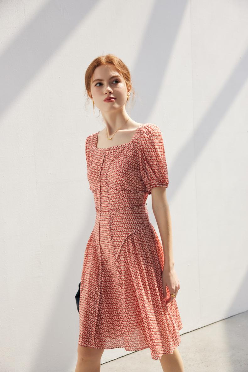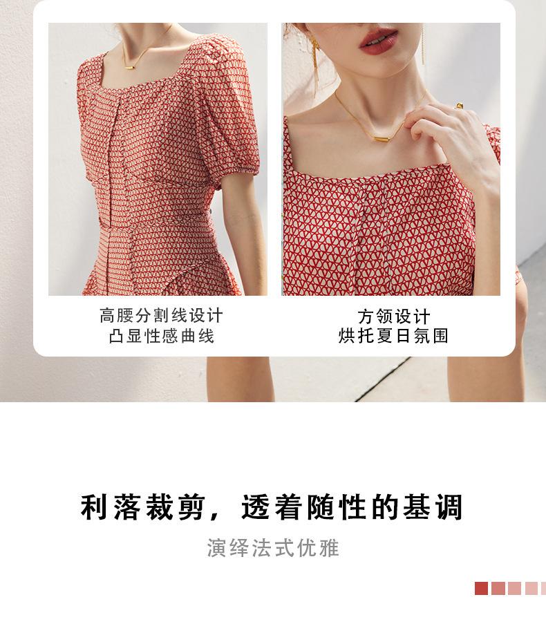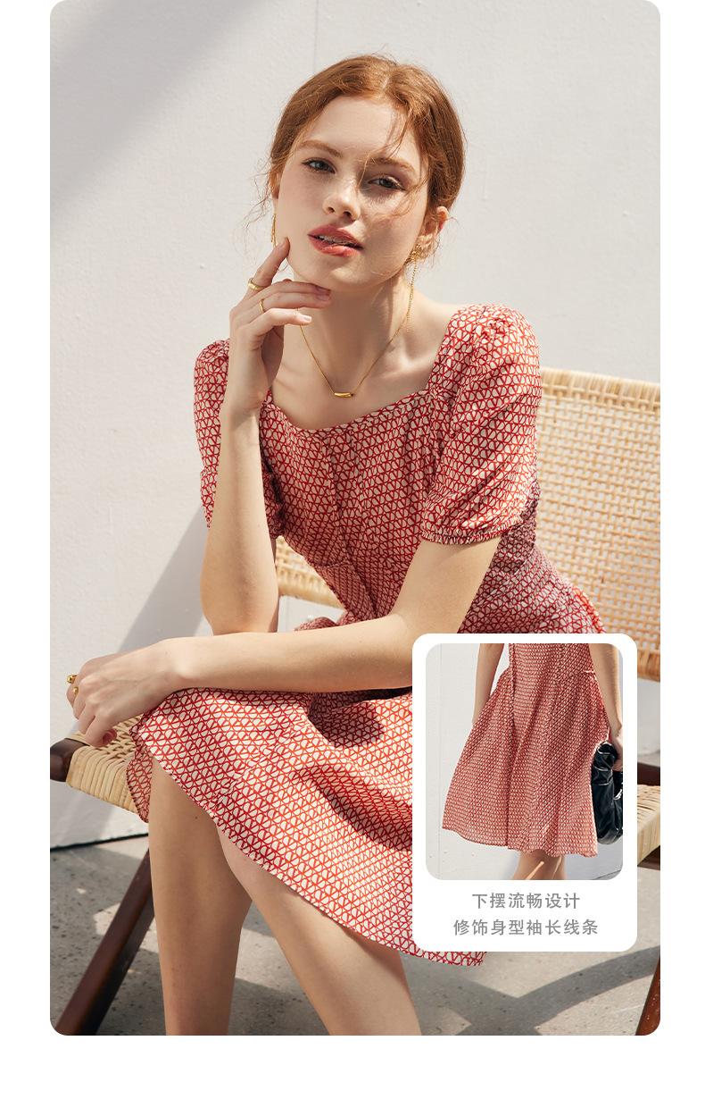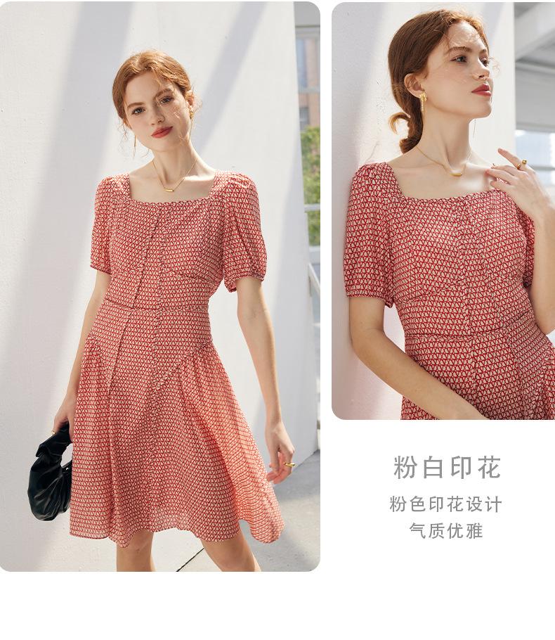 Vestido de seda de manga corta para mujer primavera y verano 2025 nuevo joven estampado cuello cuadrado 100% seda de morera falda