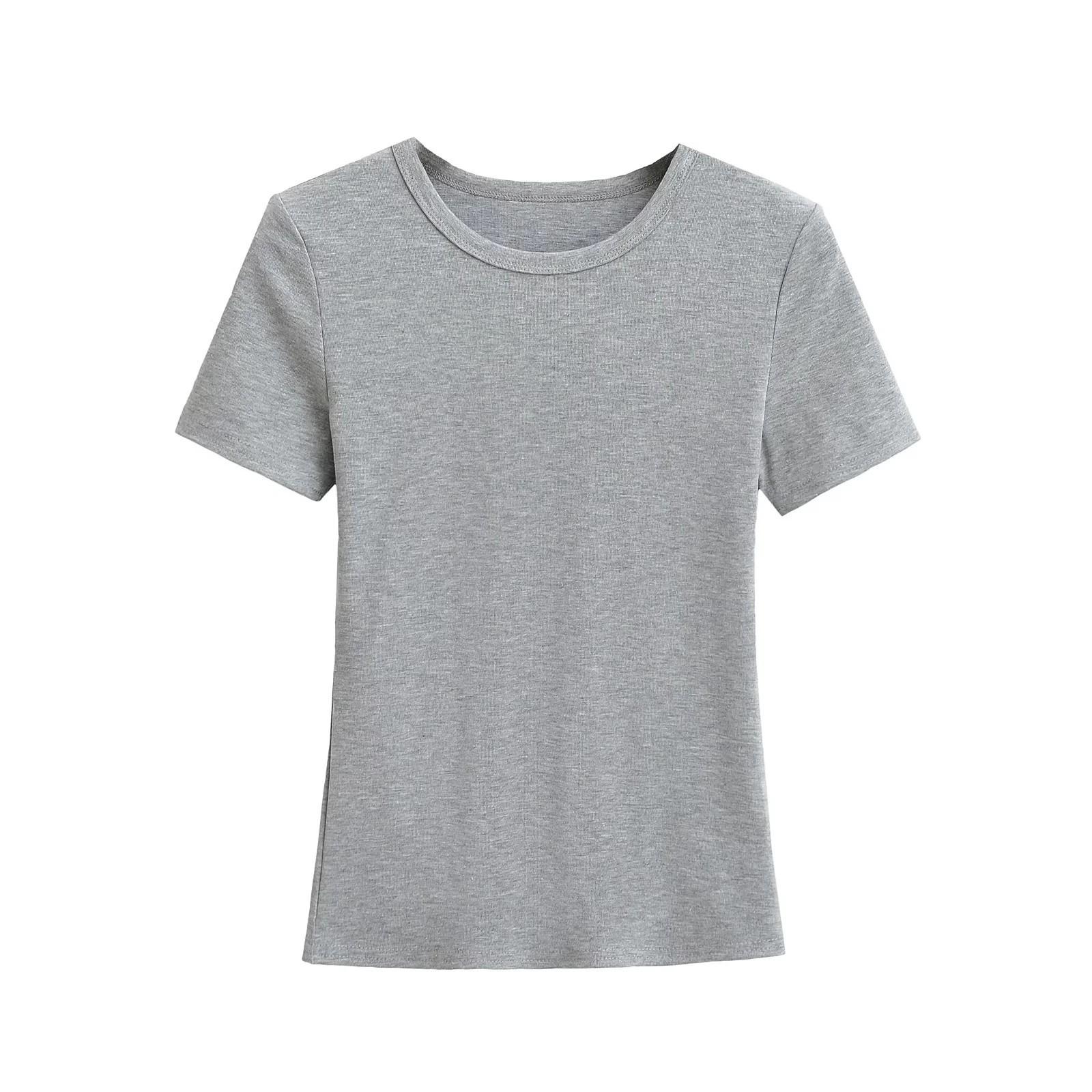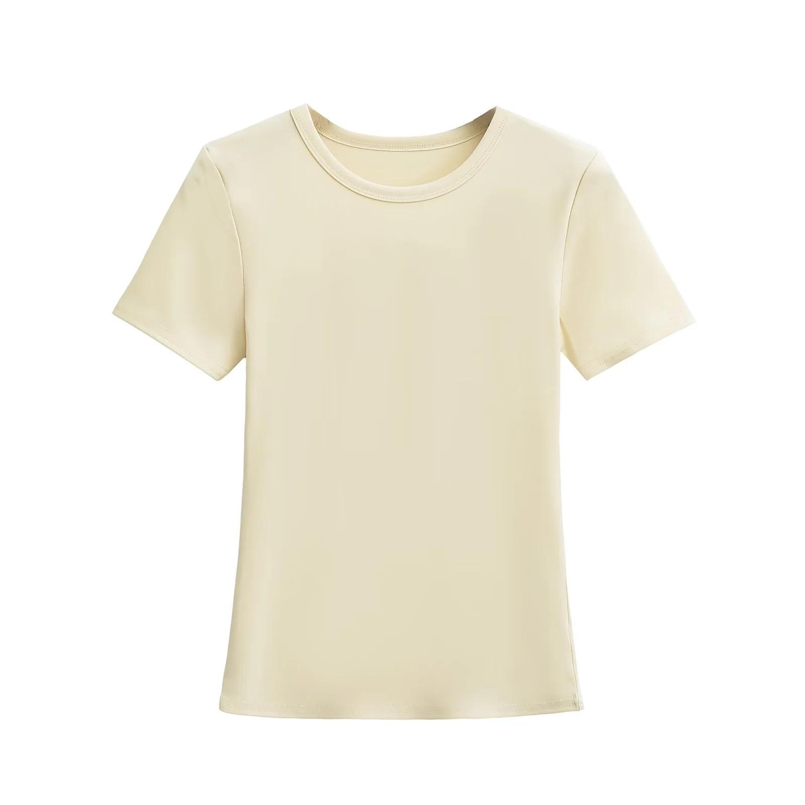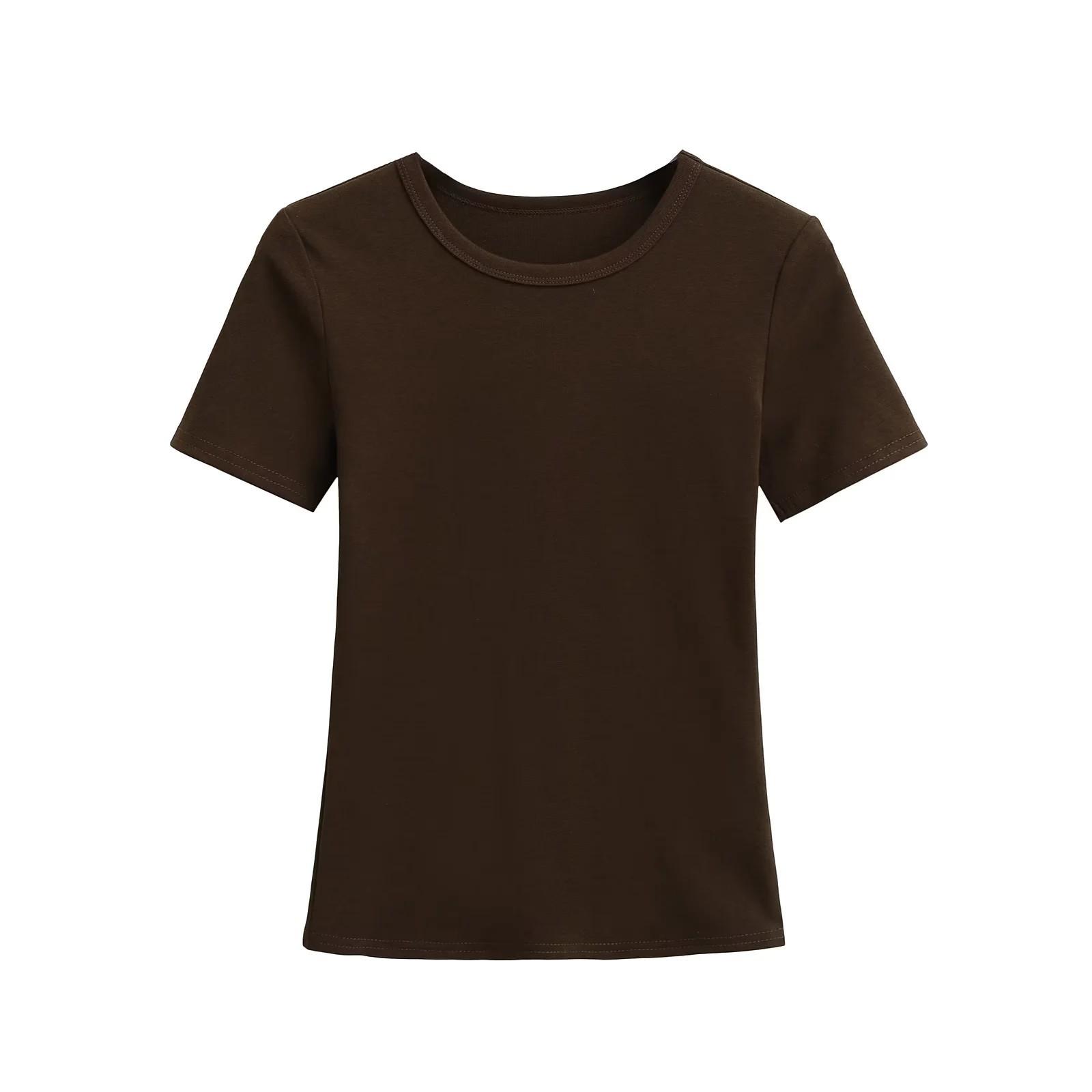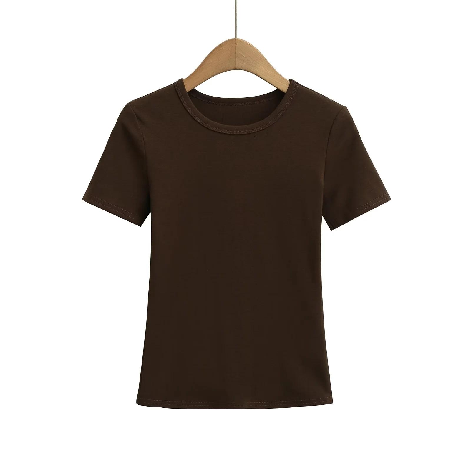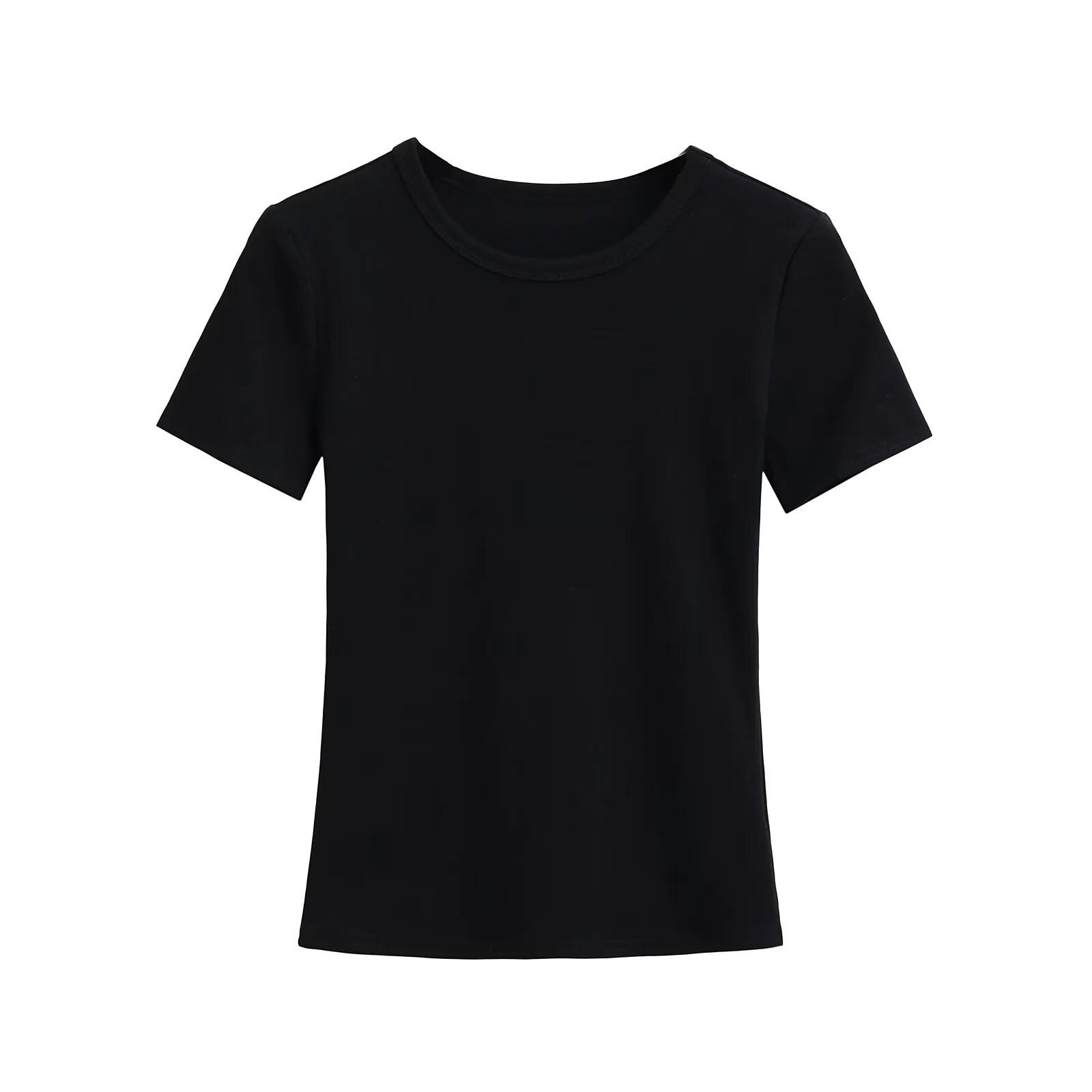 Camiseta básica americana de manga corta con cuello redondo pequeño, corte entallado, cintura ajustada y hombros descubiertos, primavera/verano 2025.
