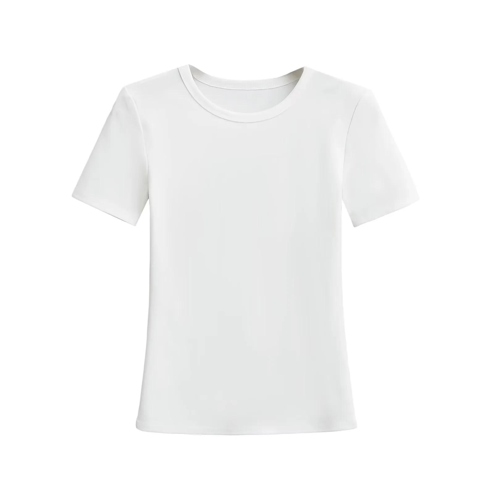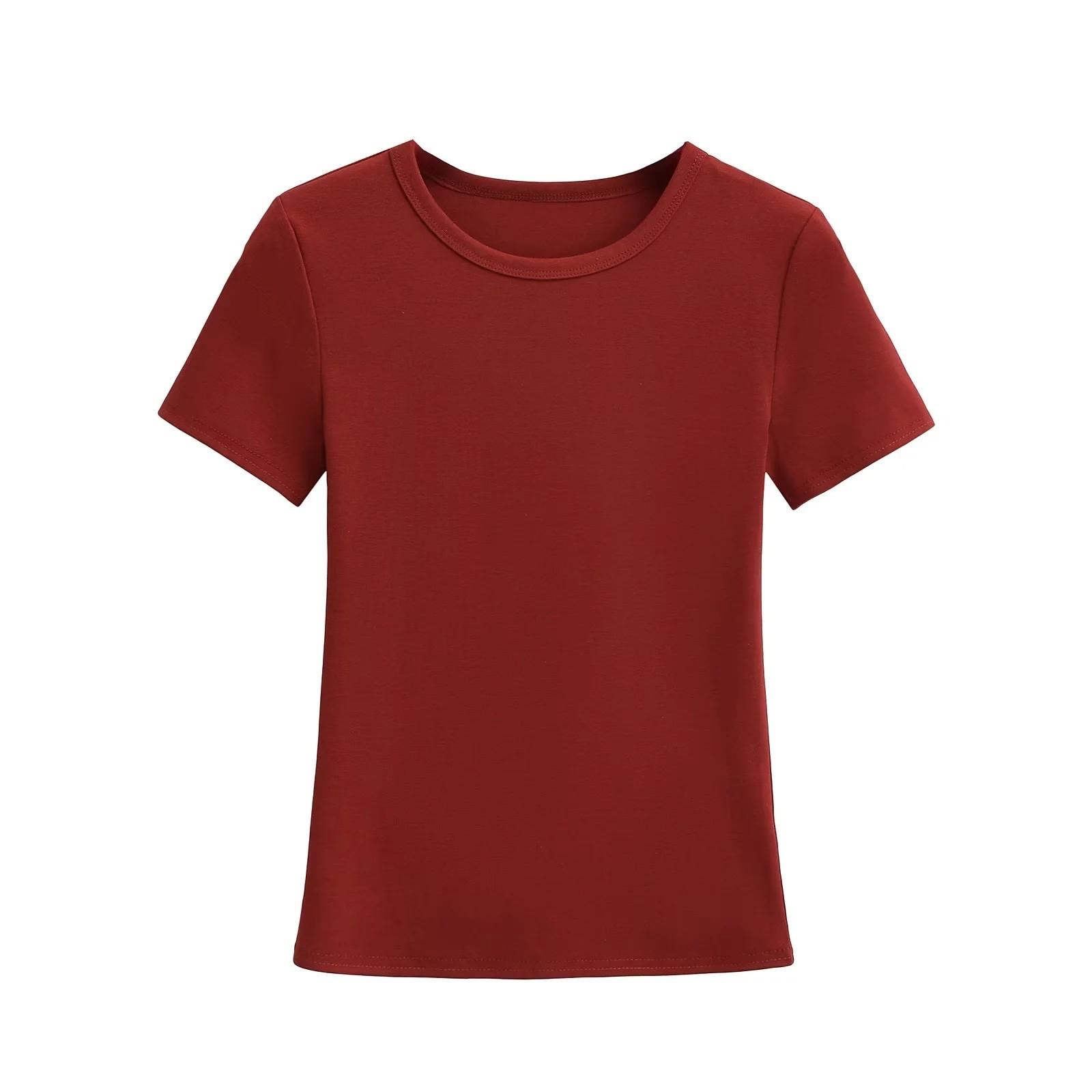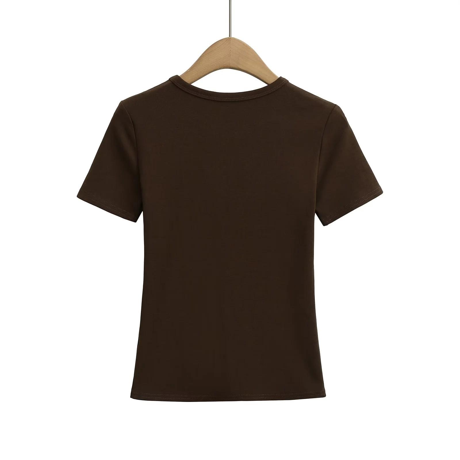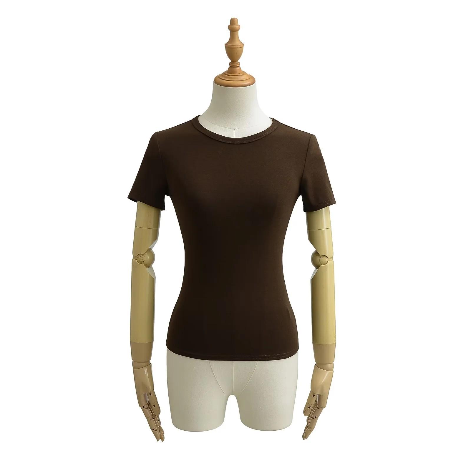 Camiseta básica americana de manga corta con cuello redondo pequeño, corte entallado, cintura ajustada y hombros descubiertos, primavera/verano 2025.