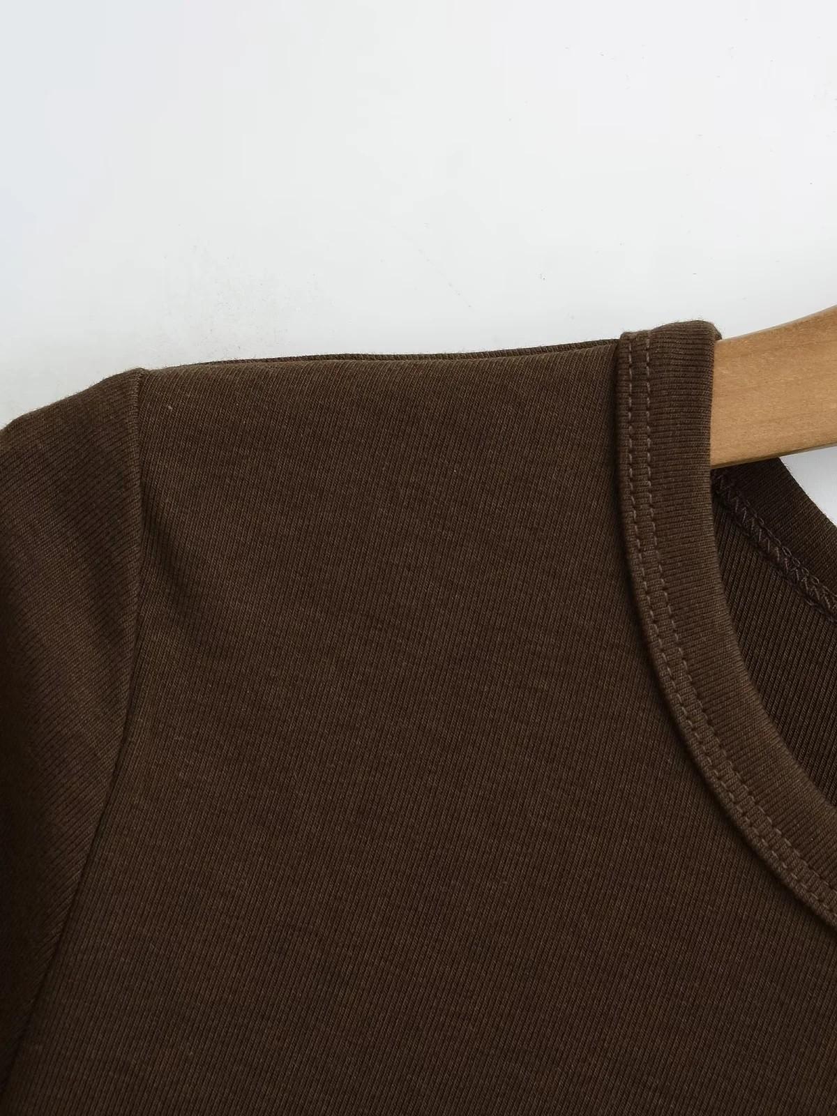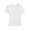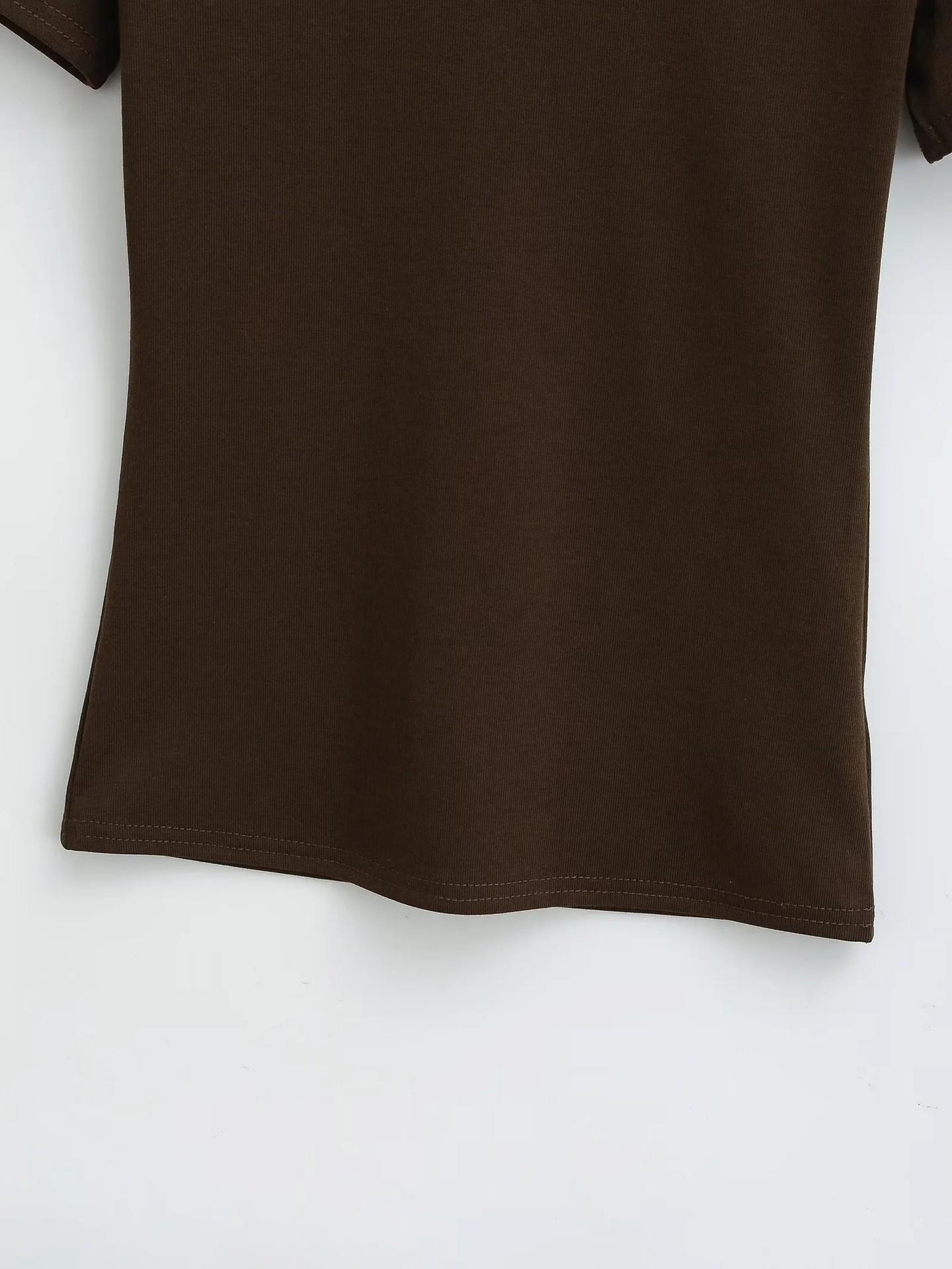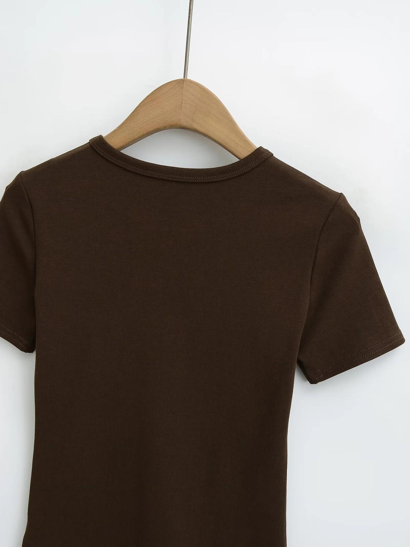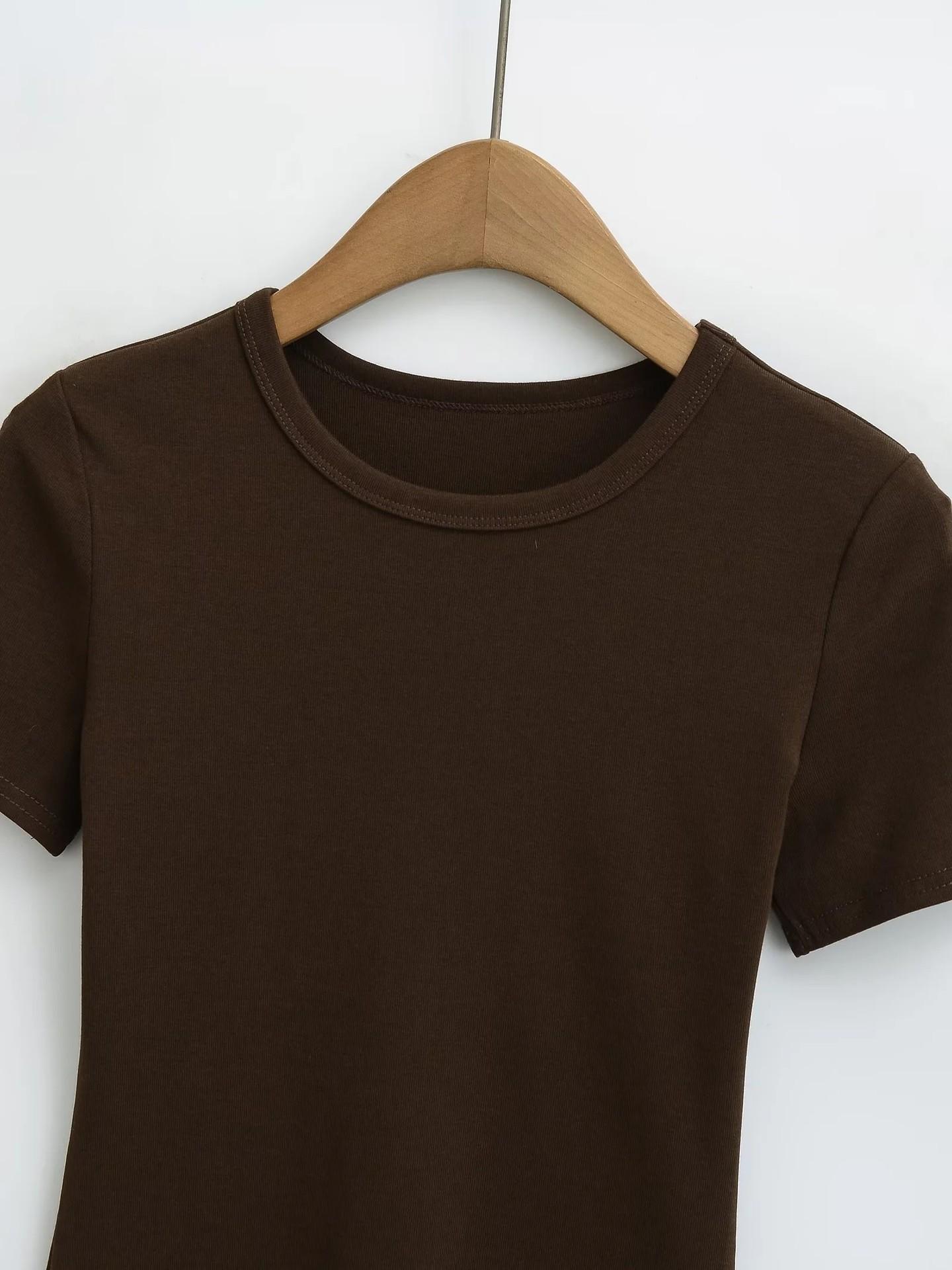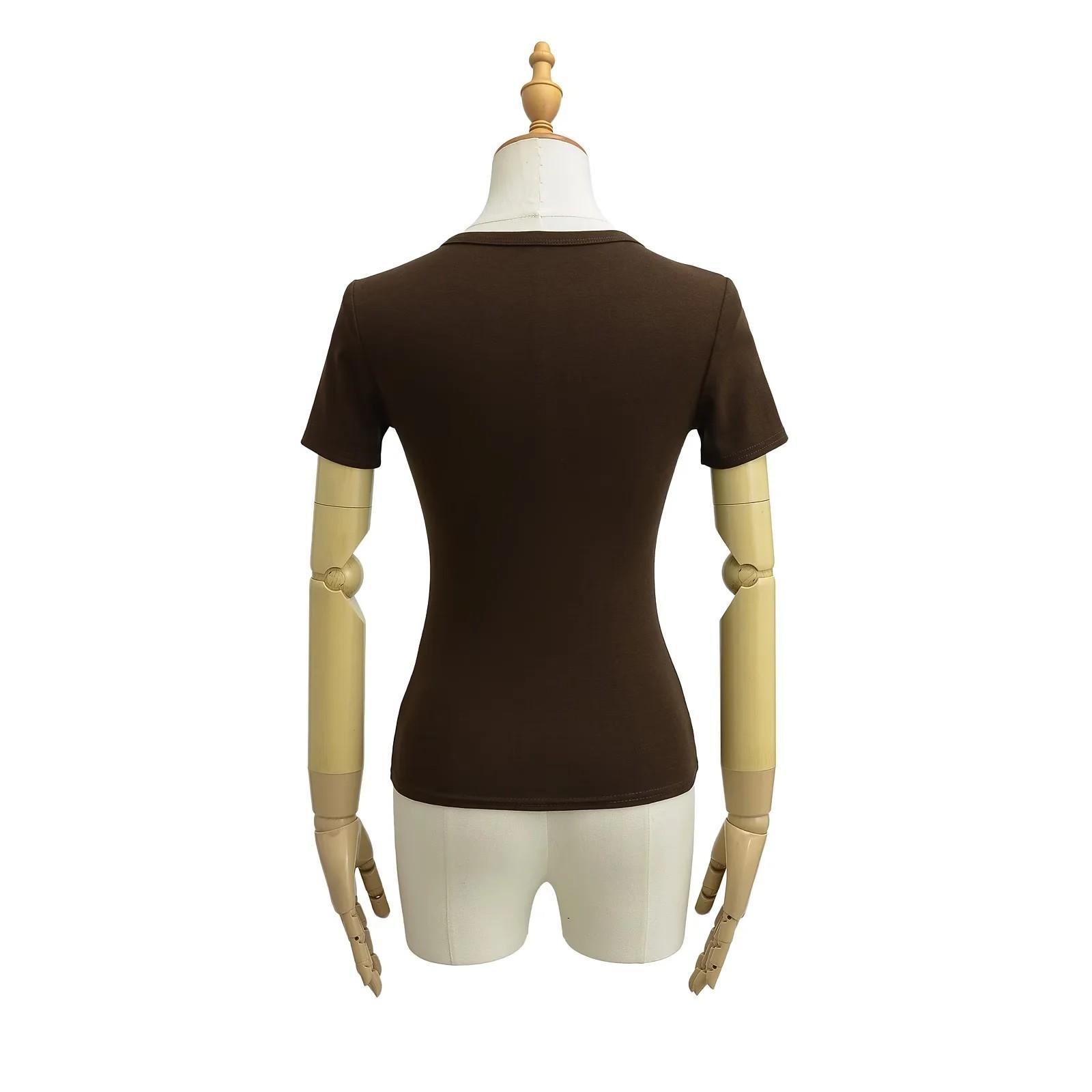 Camiseta básica americana de manga corta con cuello redondo pequeño, corte entallado, cintura ajustada y hombros descubiertos, primavera/verano 2025.