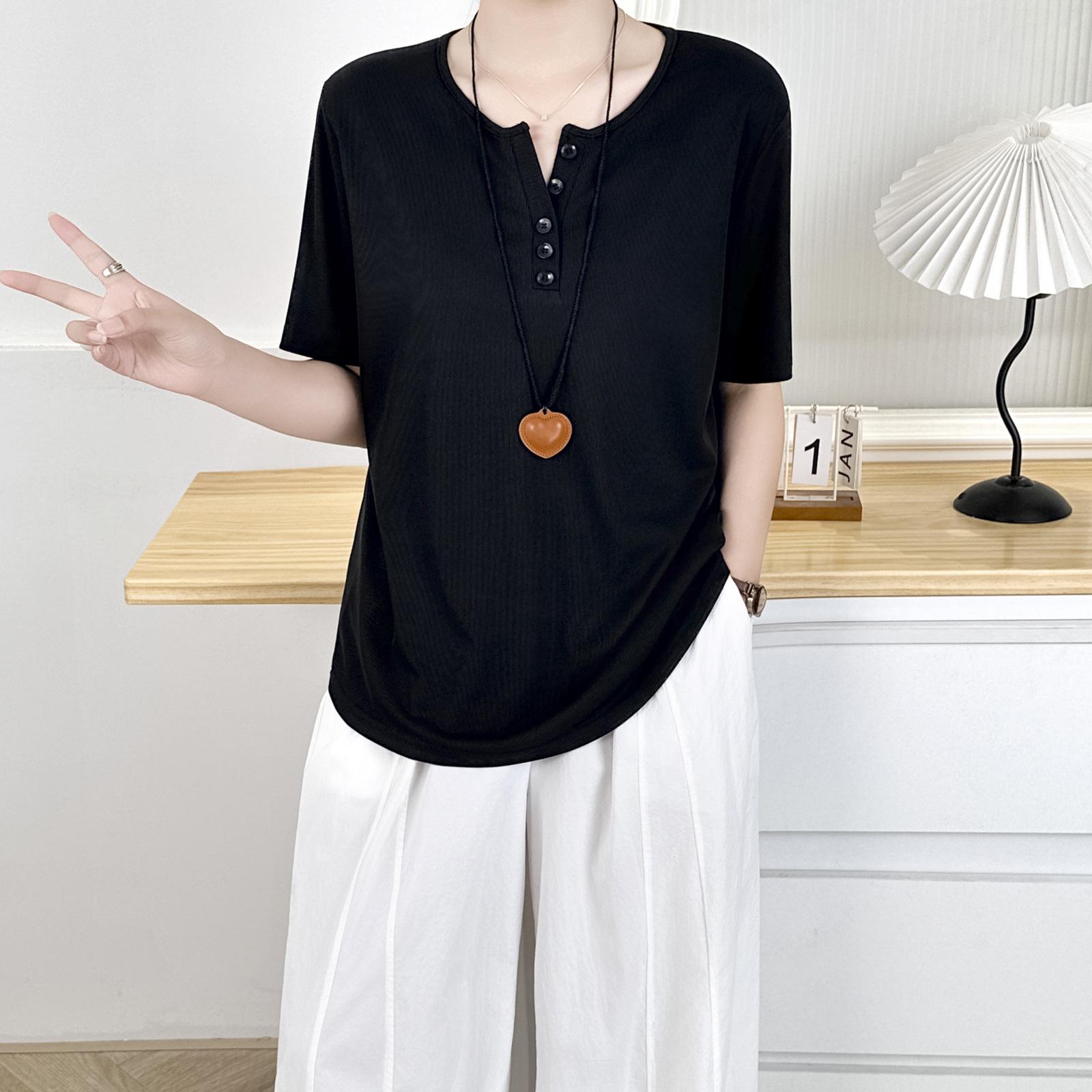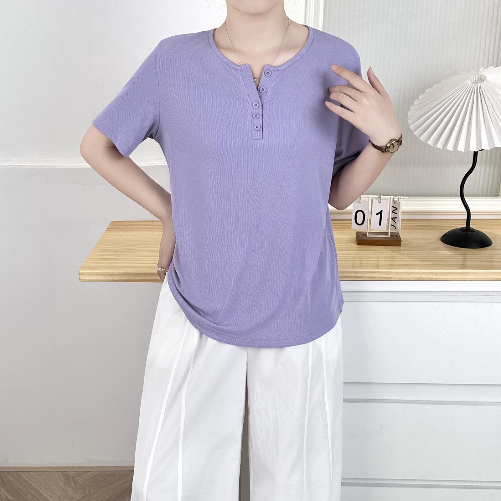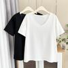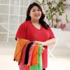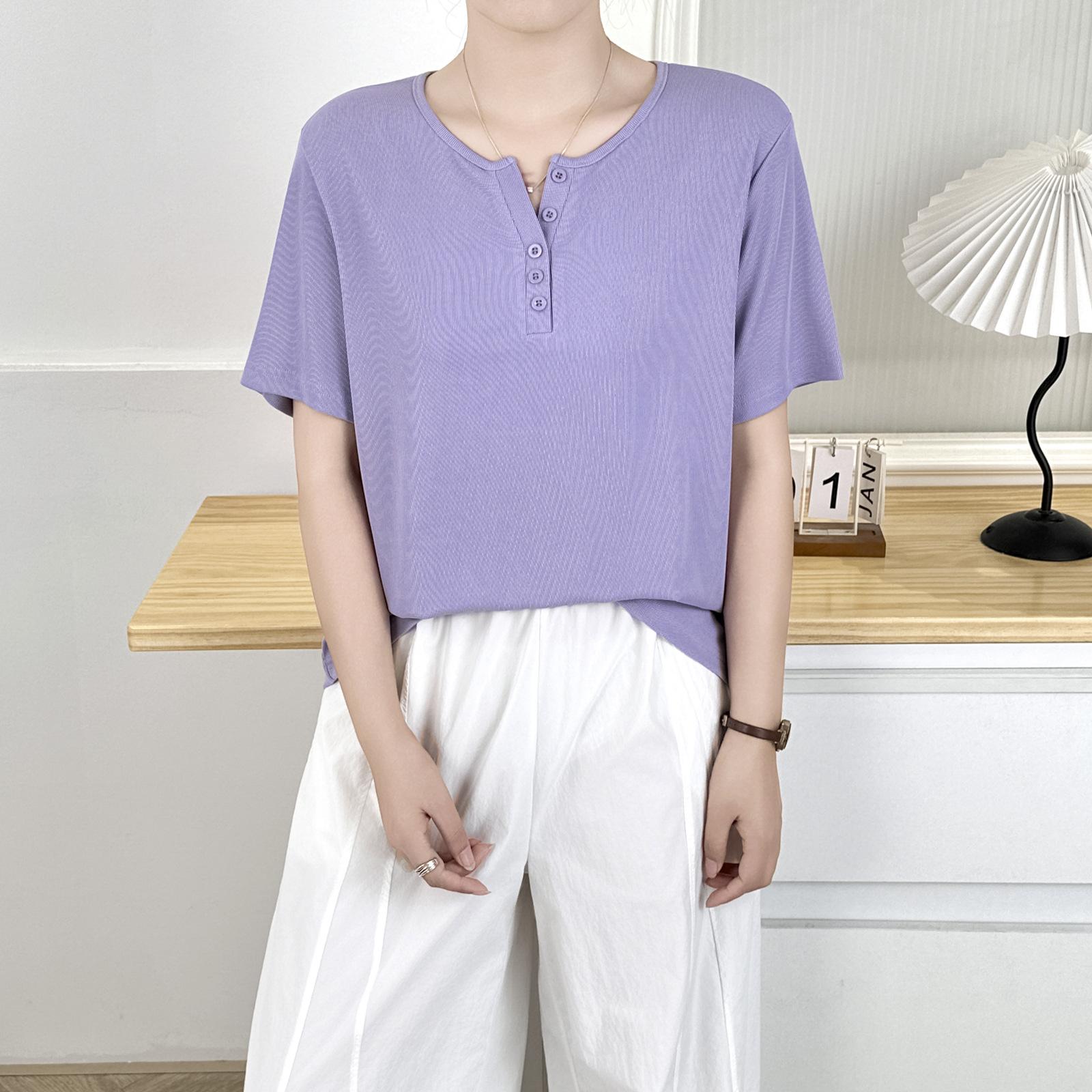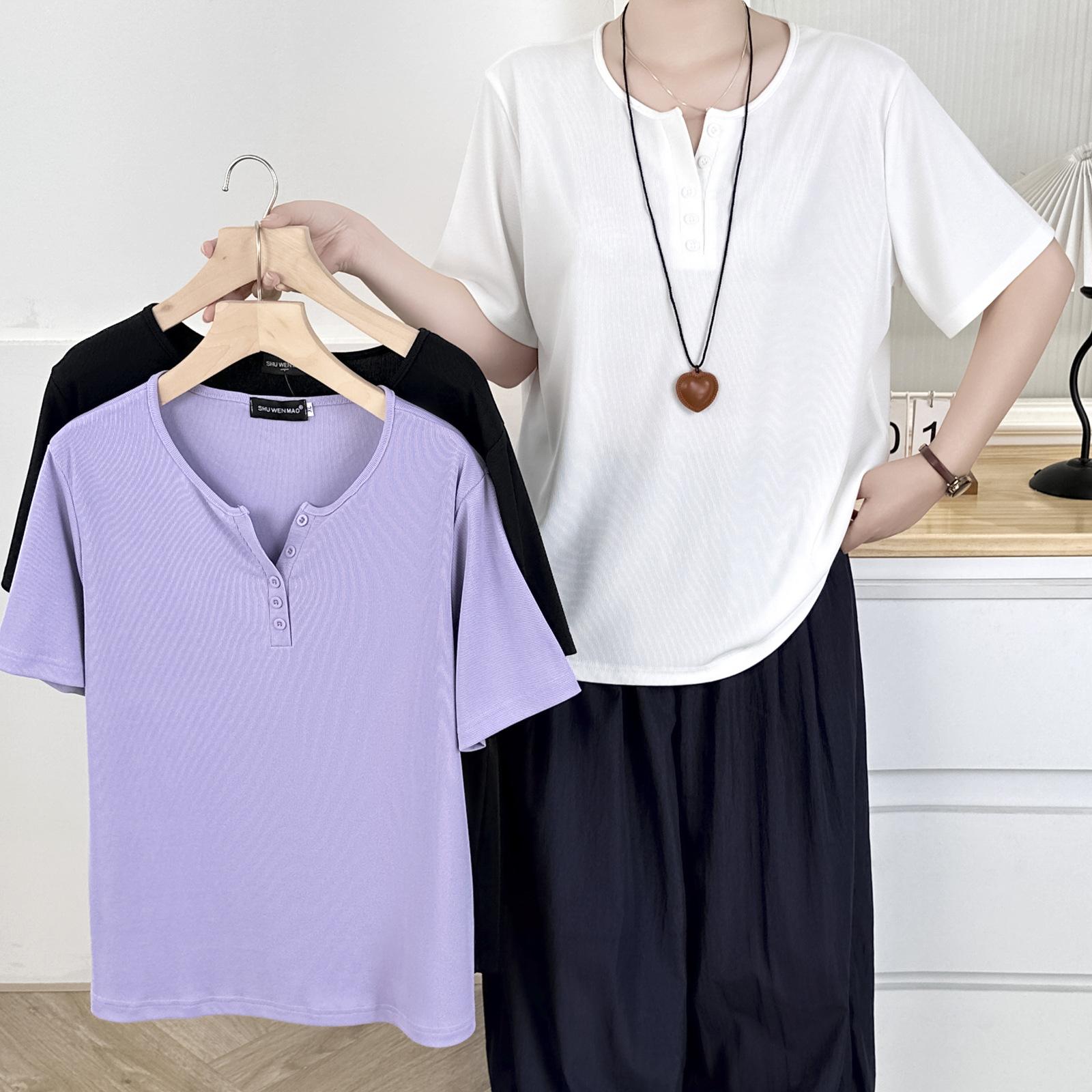 Nueva Camiseta Casual de Verano para Mujer de Talla Grande 100kg Gorda mm Simple Versátil Color Puro Cuello en V Pequeño Manga Corta 3510