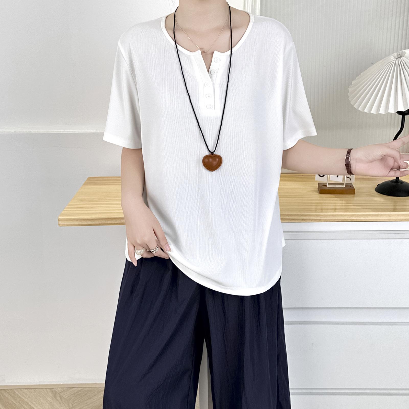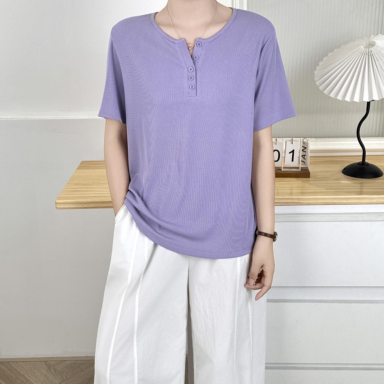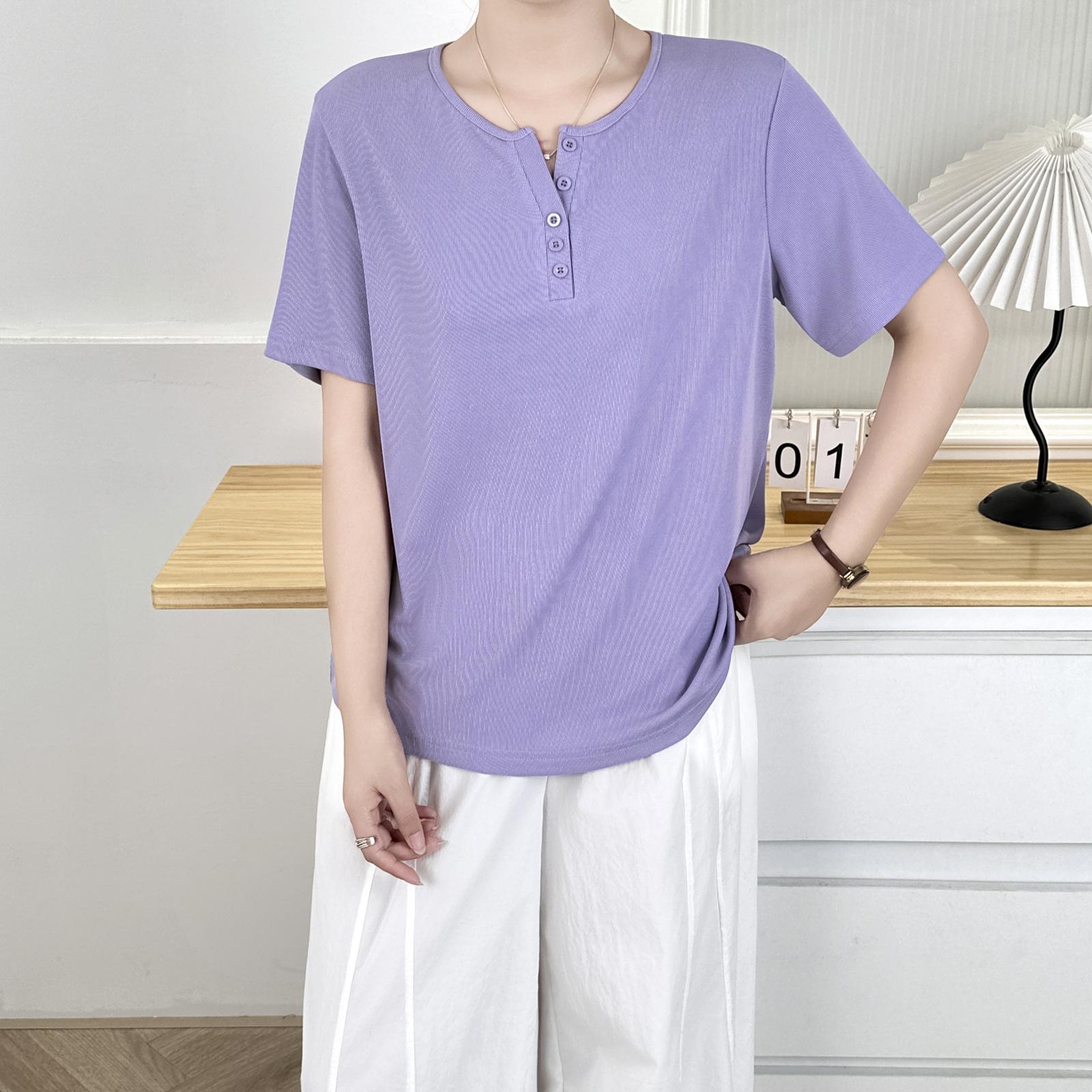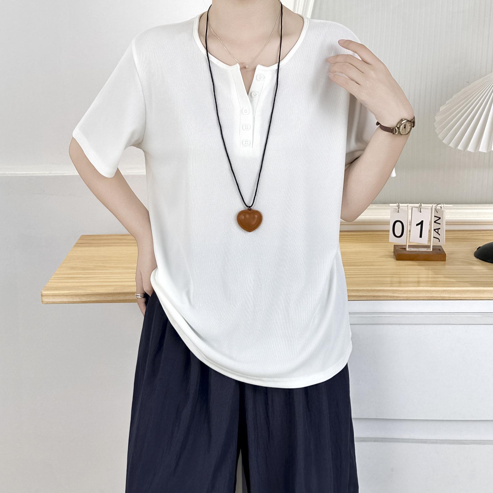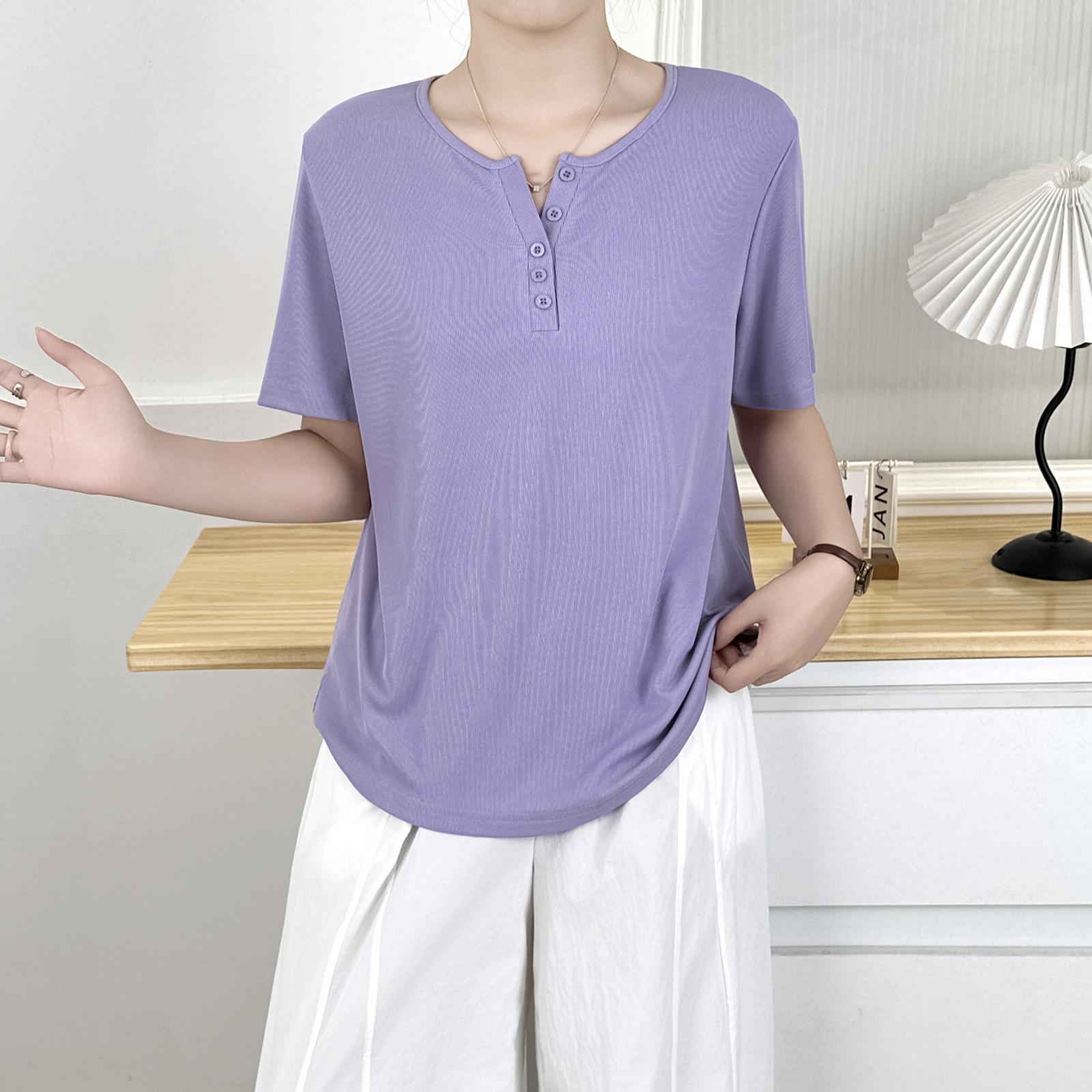 Nueva Camiseta Casual de Verano para Mujer de Talla Grande 100kg Gorda mm Simple Versátil Color Puro Cuello en V Pequeño Manga Corta 3510
