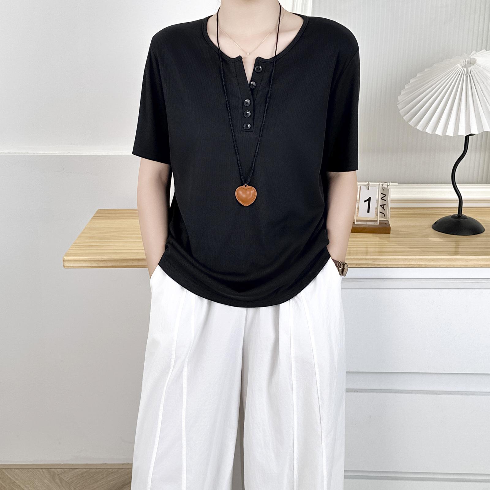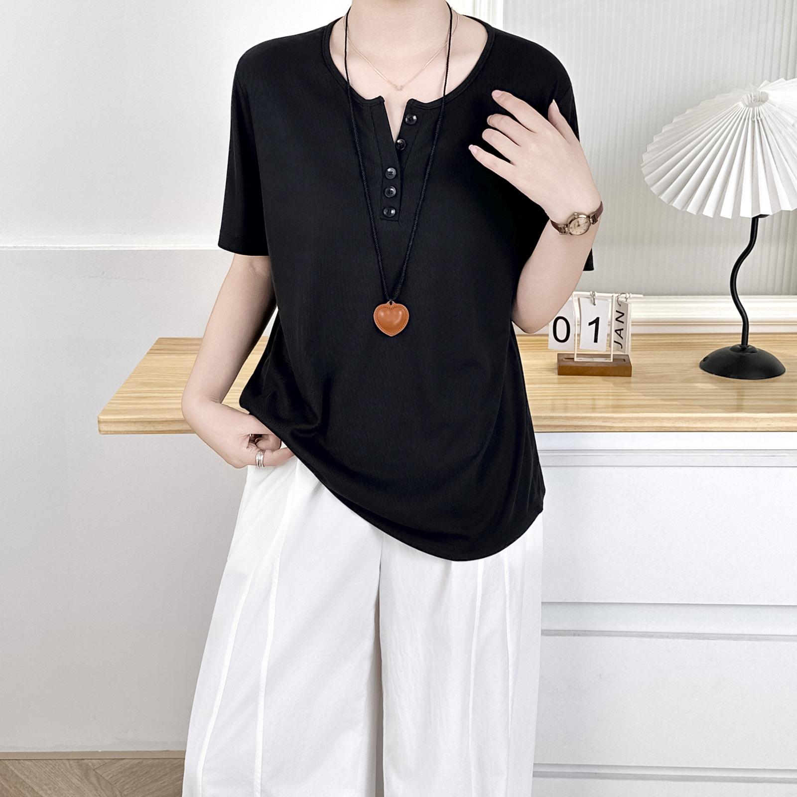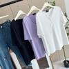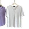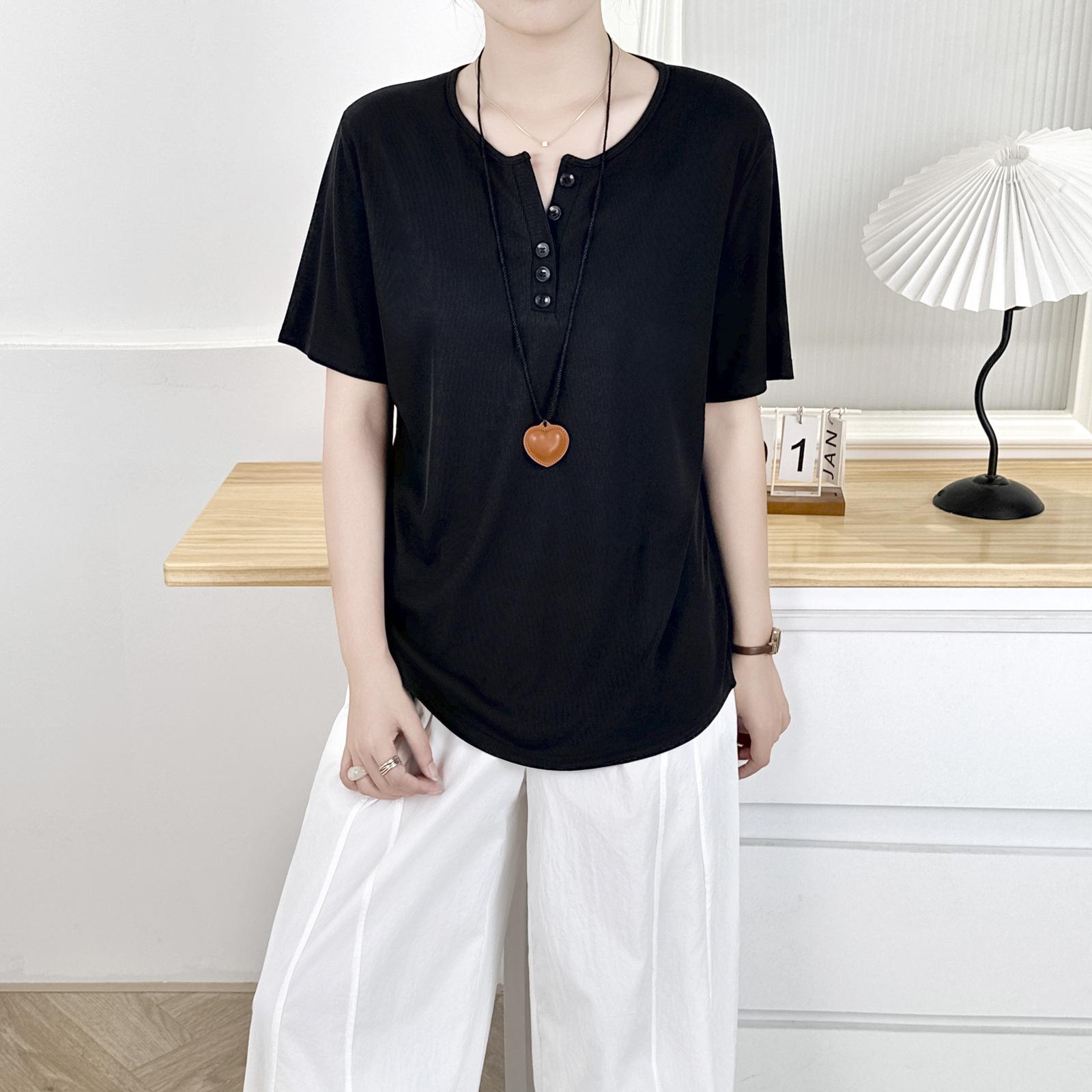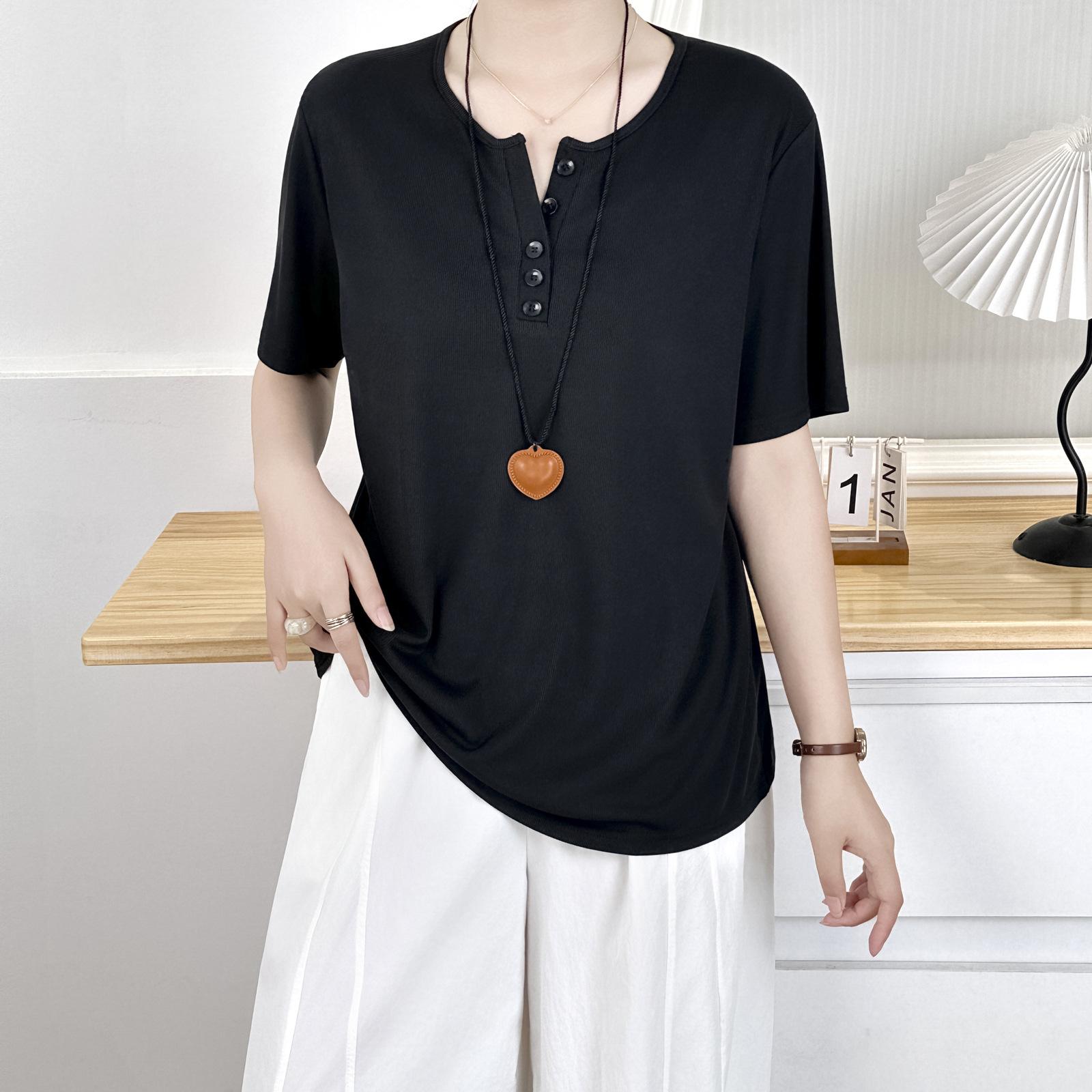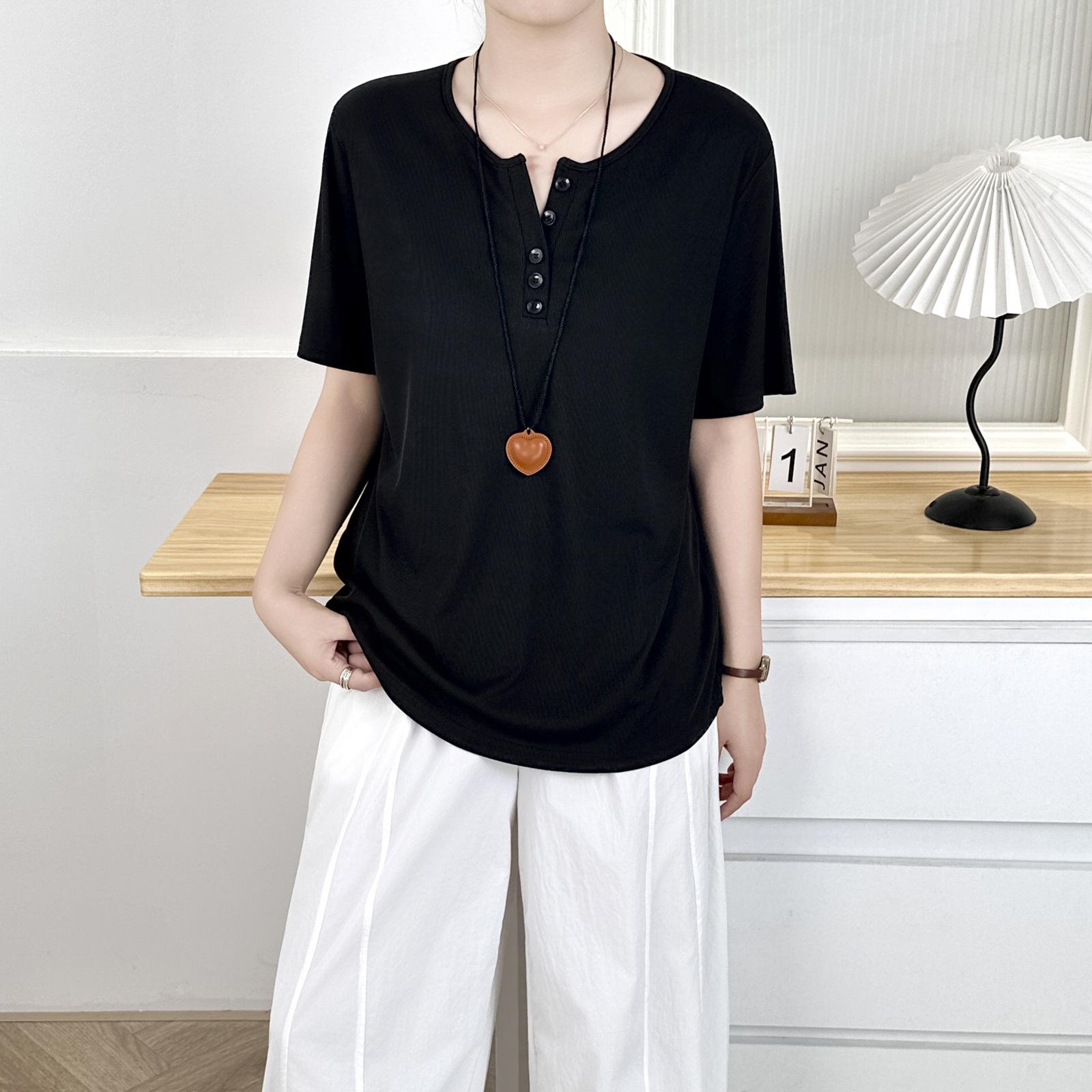 Nueva Camiseta Casual de Verano para Mujer de Talla Grande 100kg Gorda mm Simple Versátil Color Puro Cuello en V Pequeño Manga Corta 3510