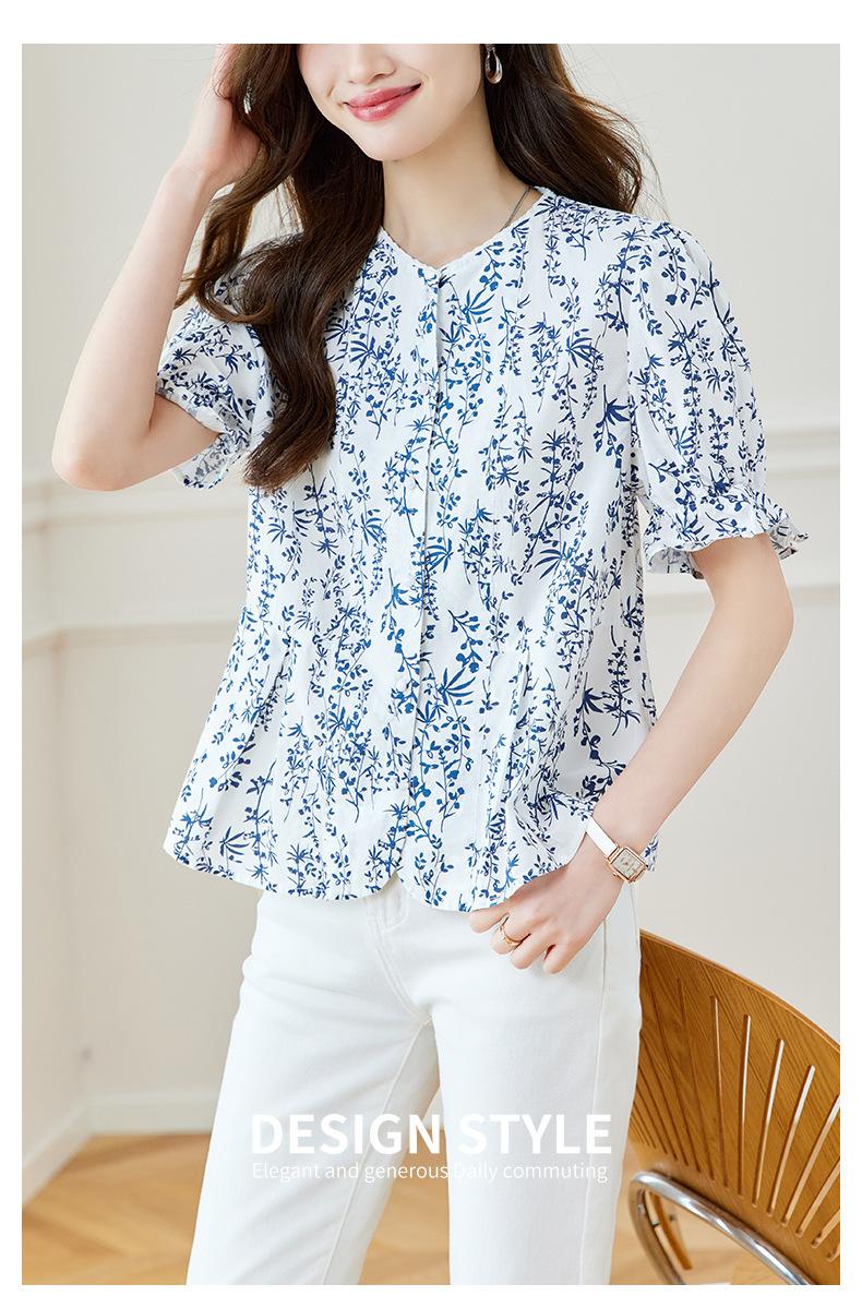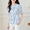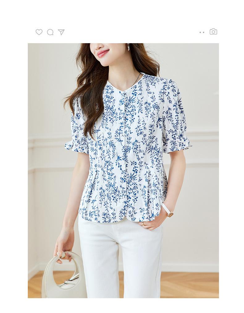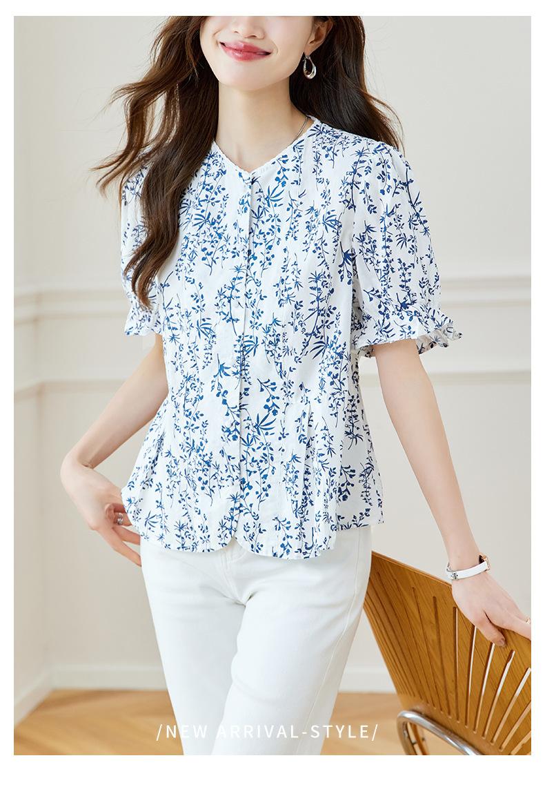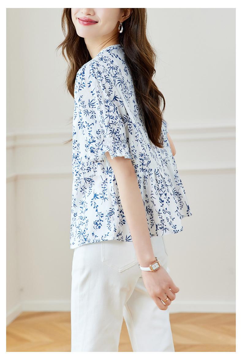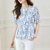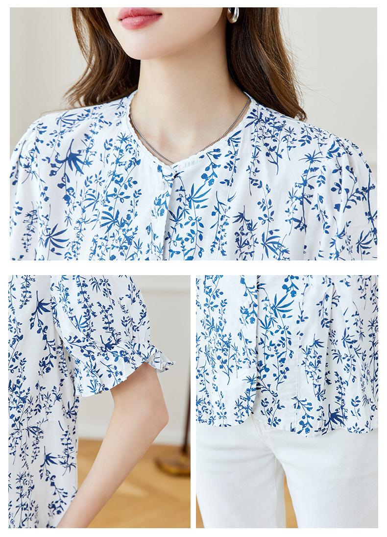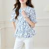 Venta directa de fábrica, nueva camisa con estampado chino, blusa de manga corta de porcelana azul y blanca, camisa elegante de algodón fino de verano para mujer