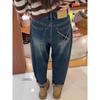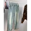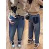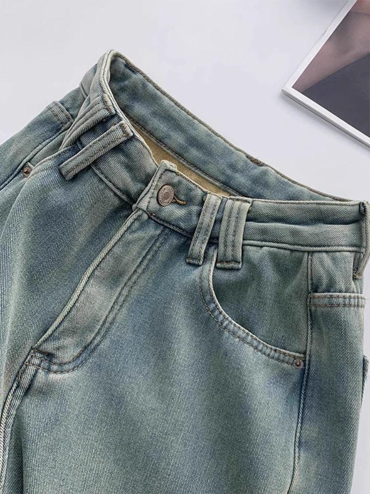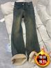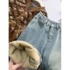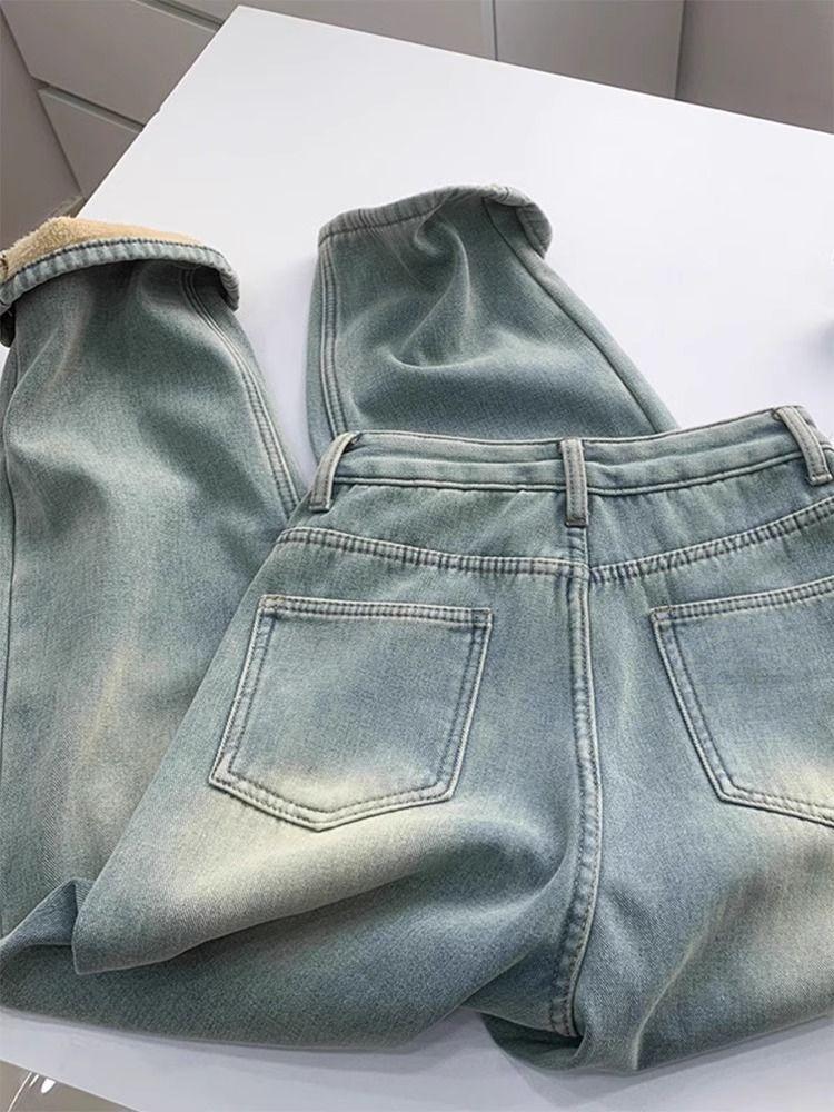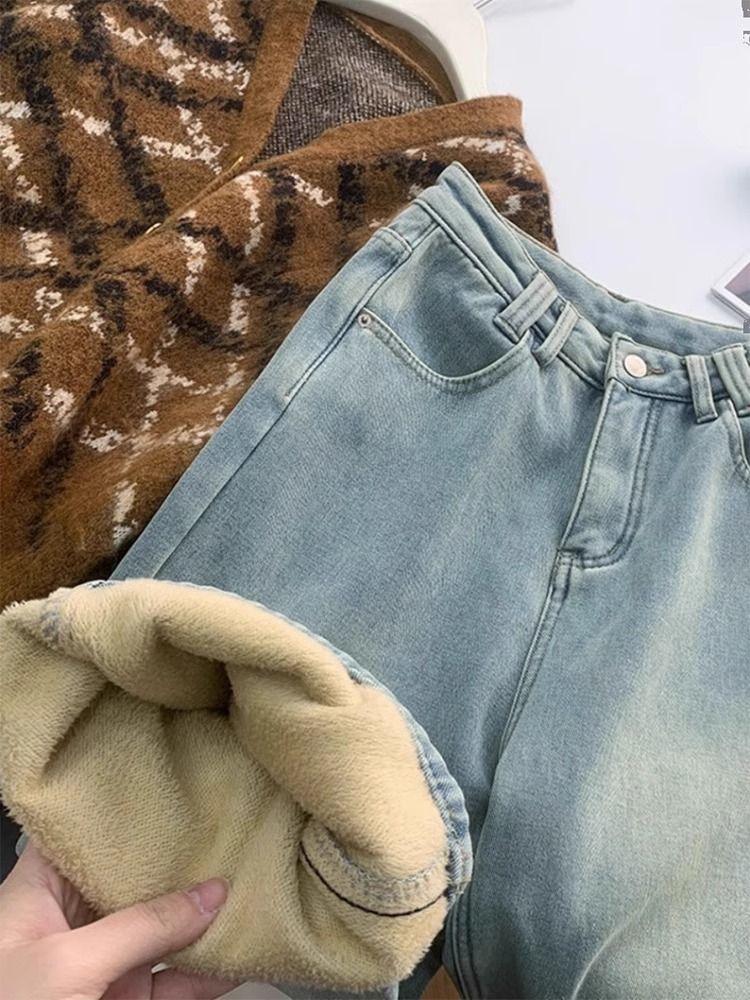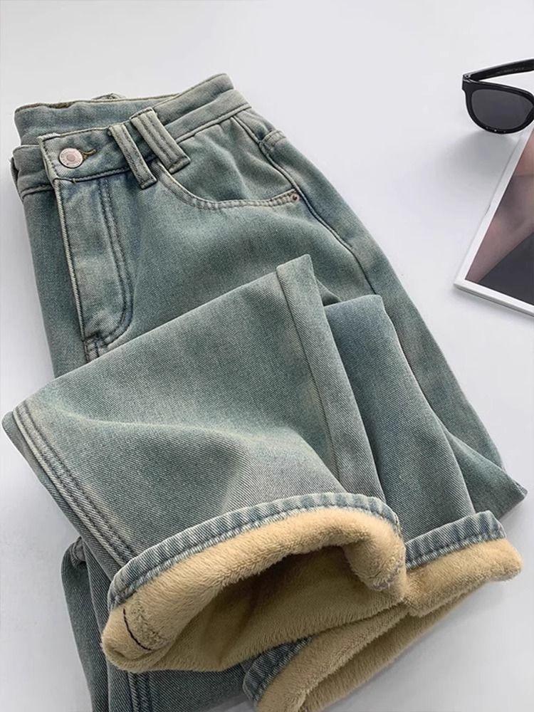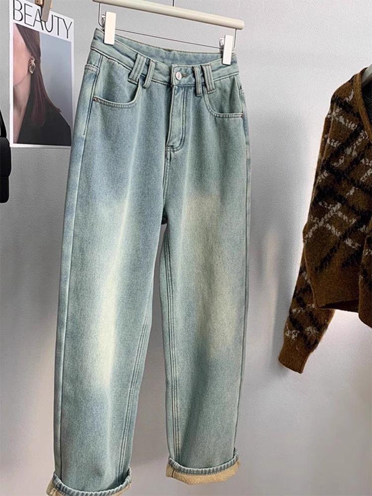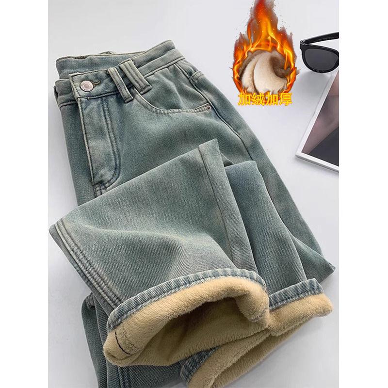 Pantalones vaqueros con forma de pera para mujer, otoño e invierno 2024, nuevos, forrados de vellón, gruesos, de talla grande, sueltos, adelgazantes, de color claro, rectos.