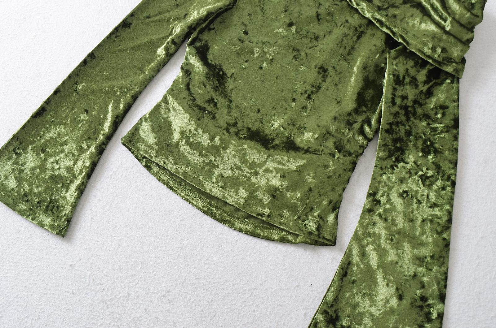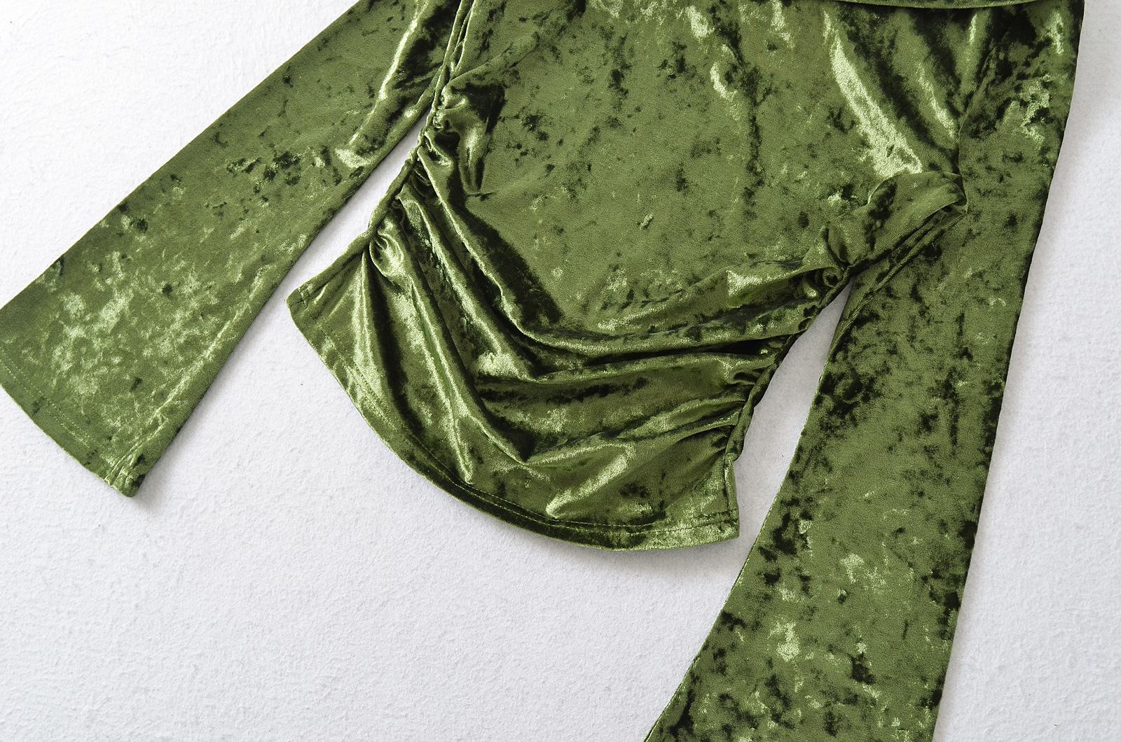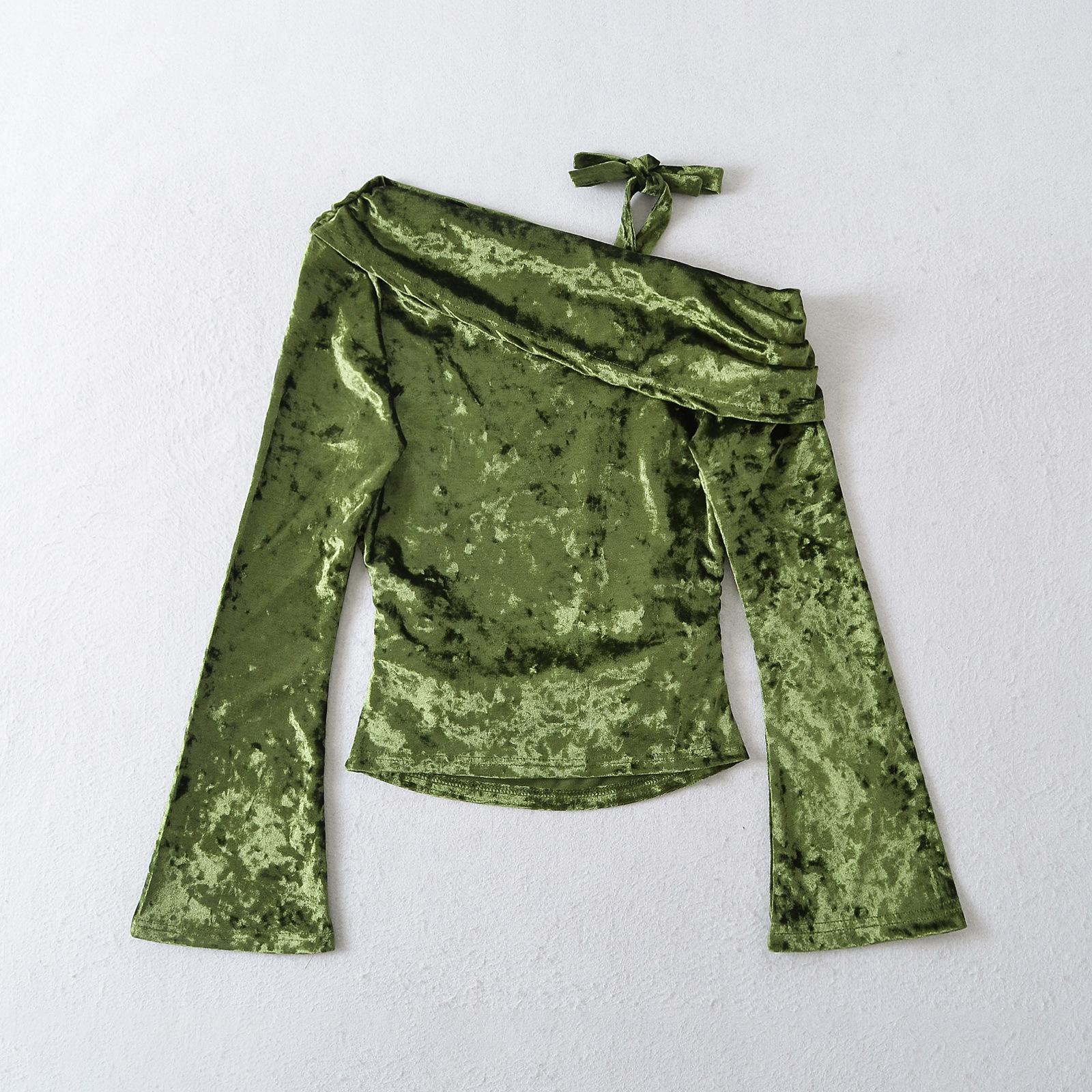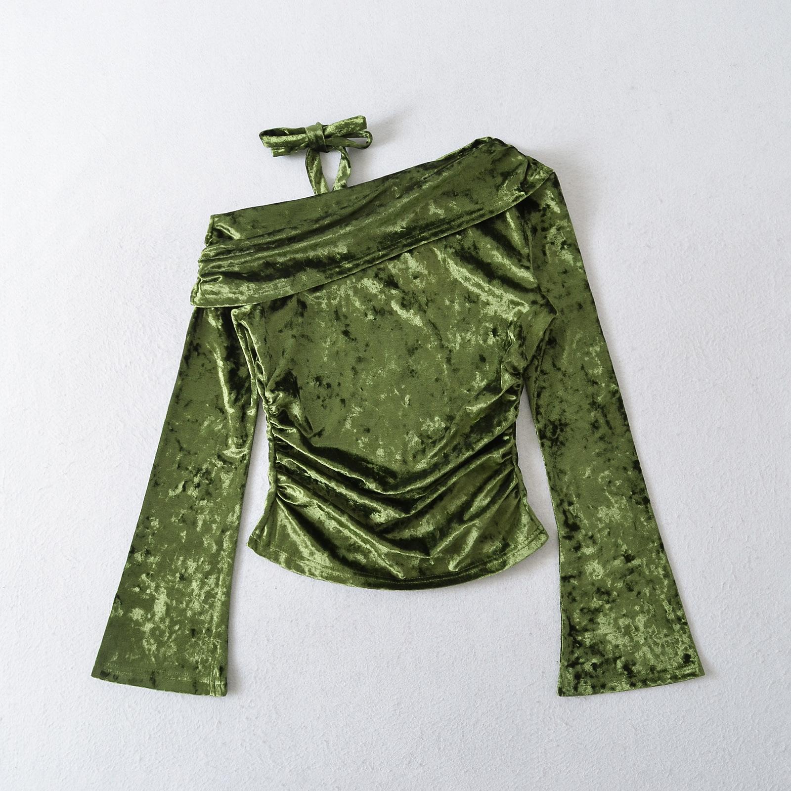 A916-24 Invierno Nuevo Estilo Americano Estilo Deseo Puro Ladrillo Piedra Terciopelo Tirante Inclinado Manga Larga Trompeta Plisada Ajustada Camiseta