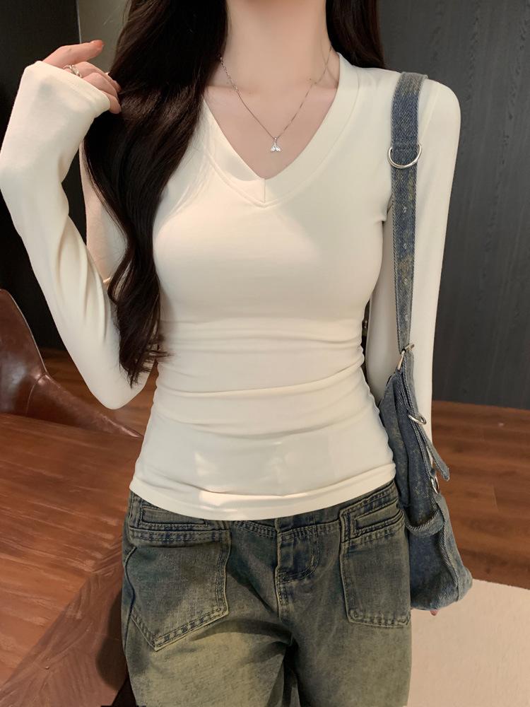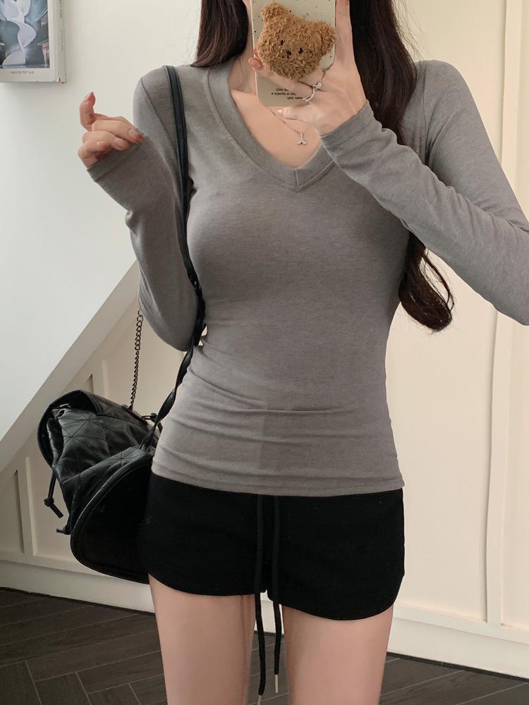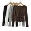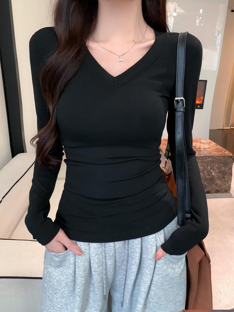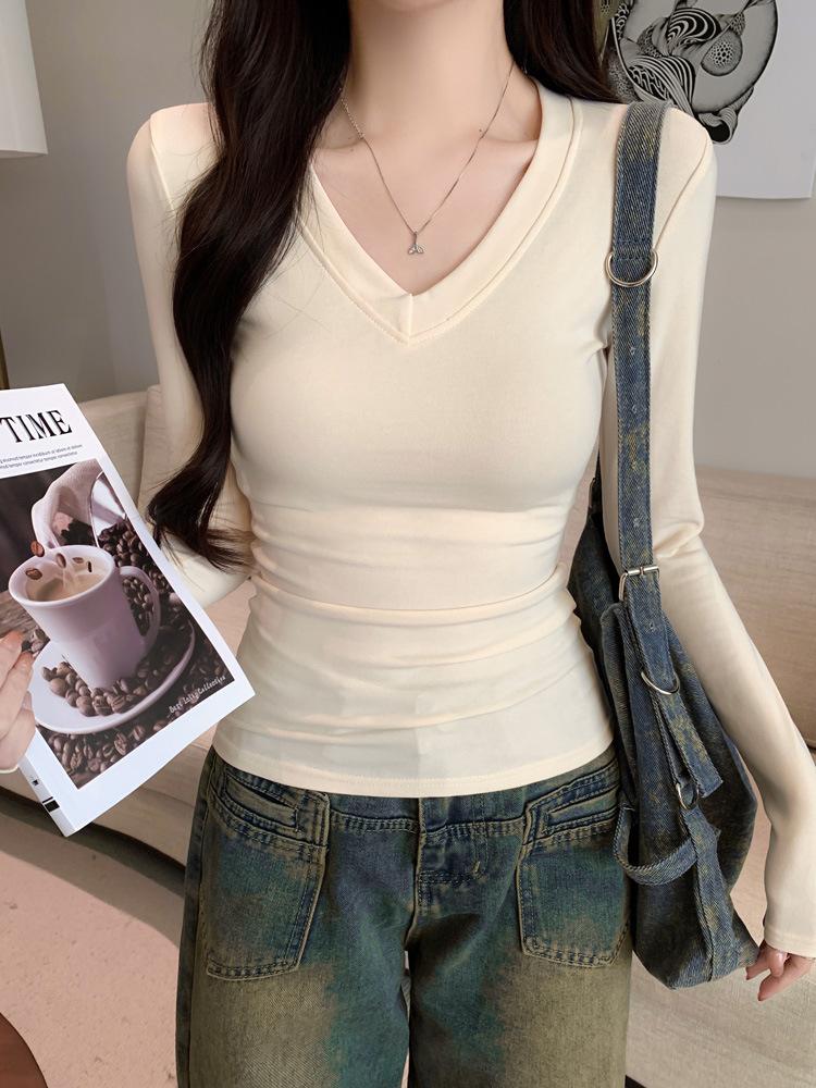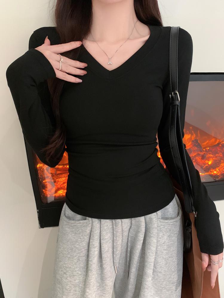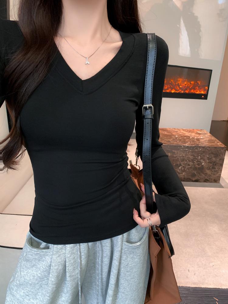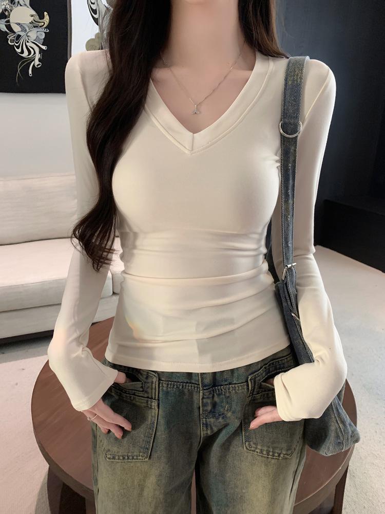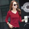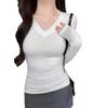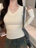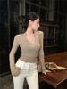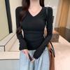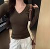 Venta al por mayor, otoño e invierno, nueva camiseta con cuello en V, camisa de manga larga para mujer, top ajustado con cintura alta y figura estupenda