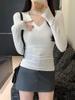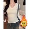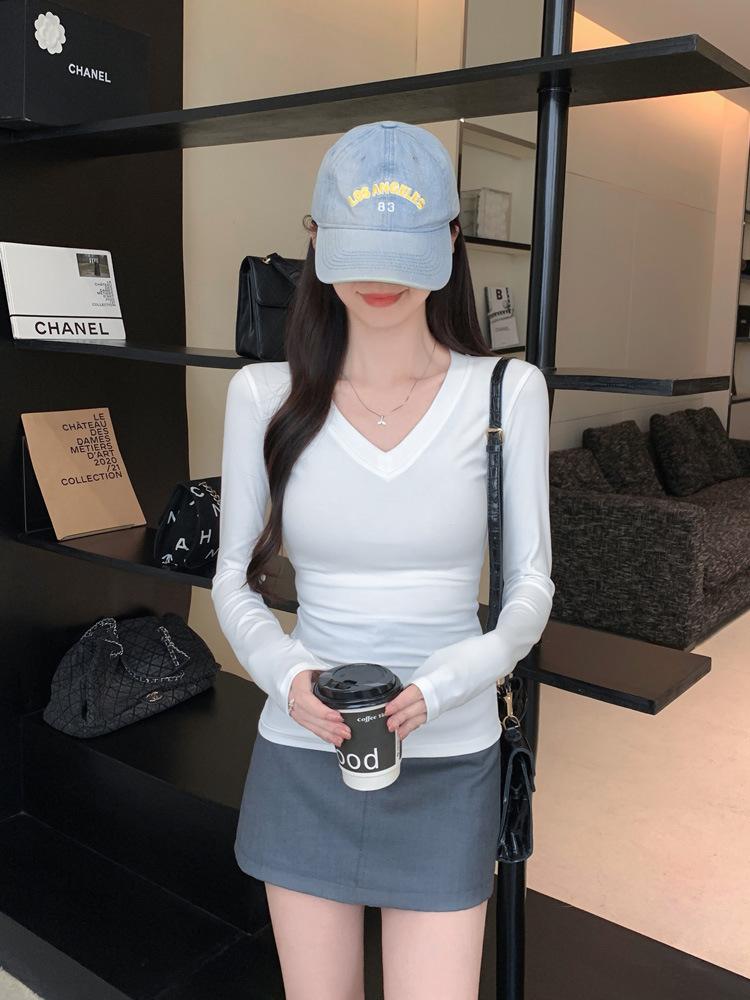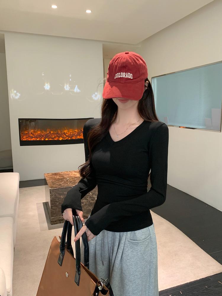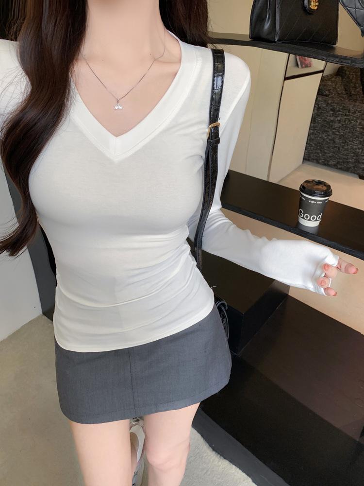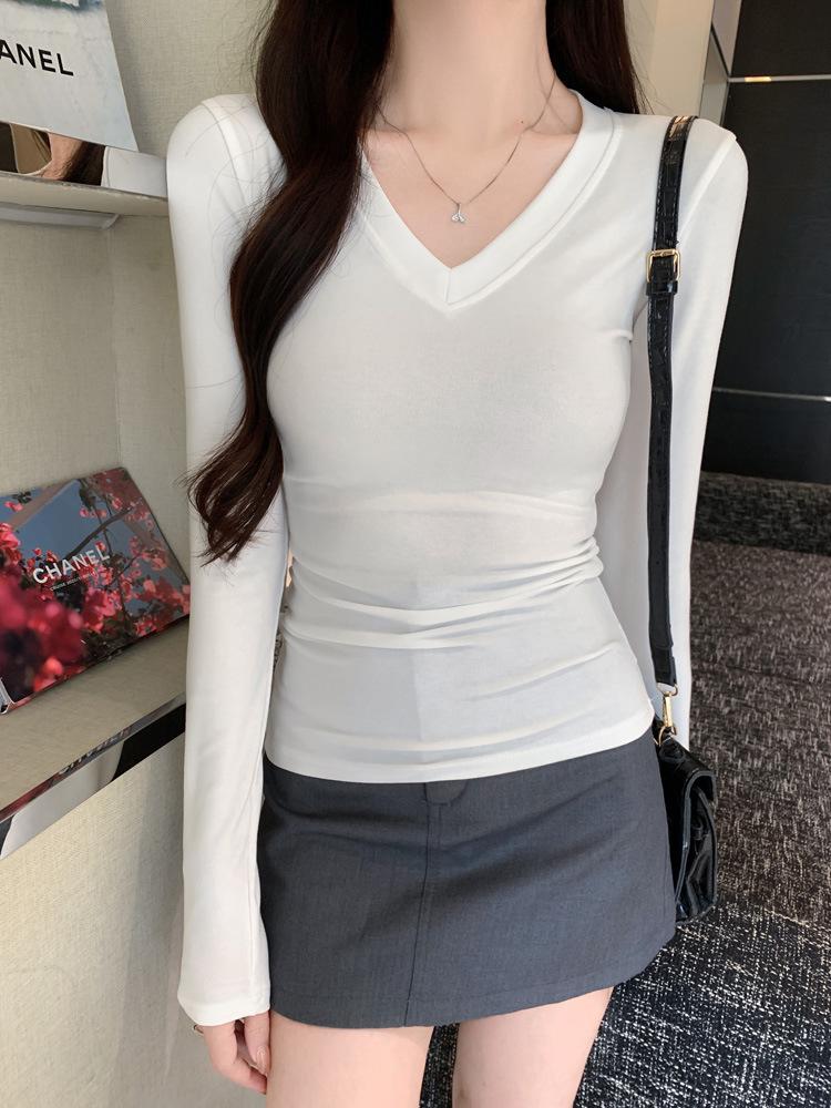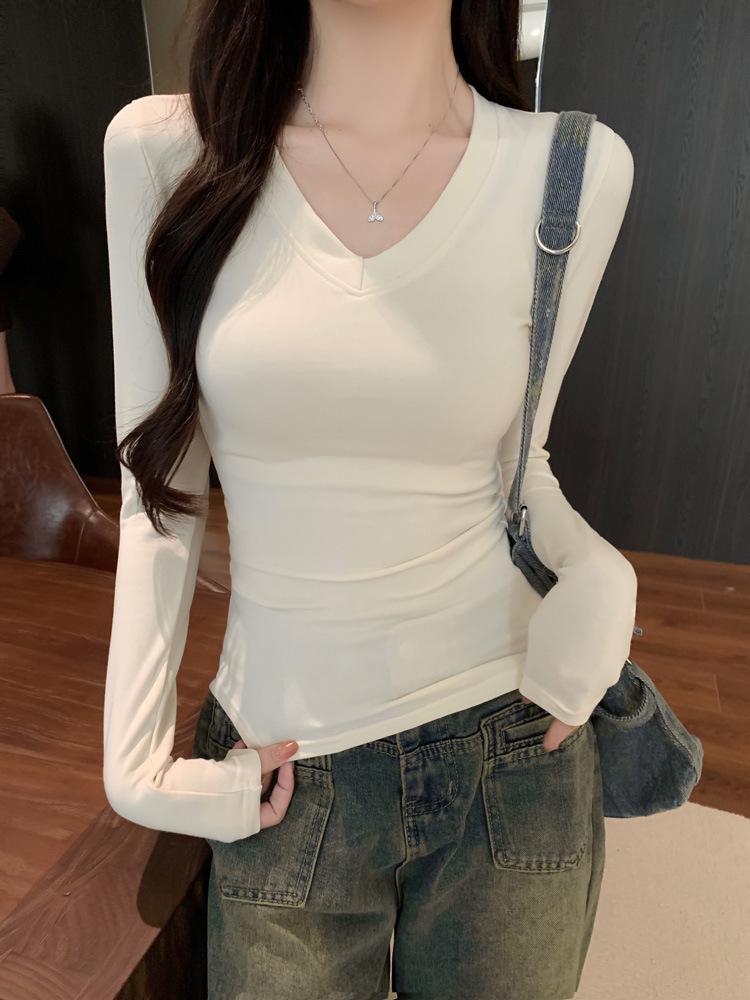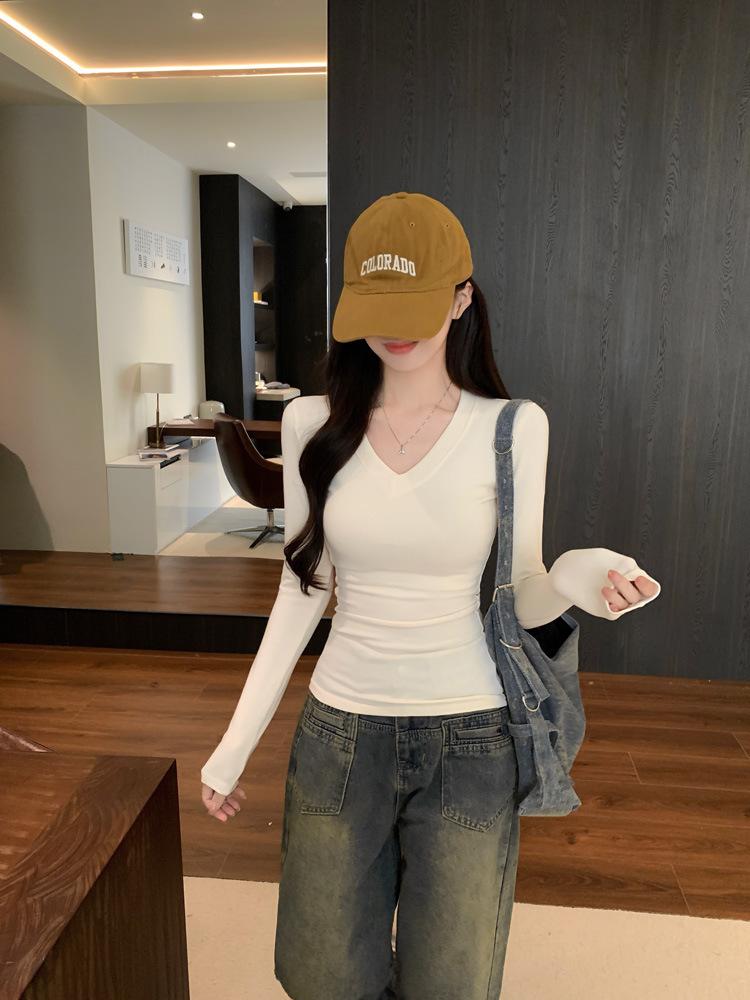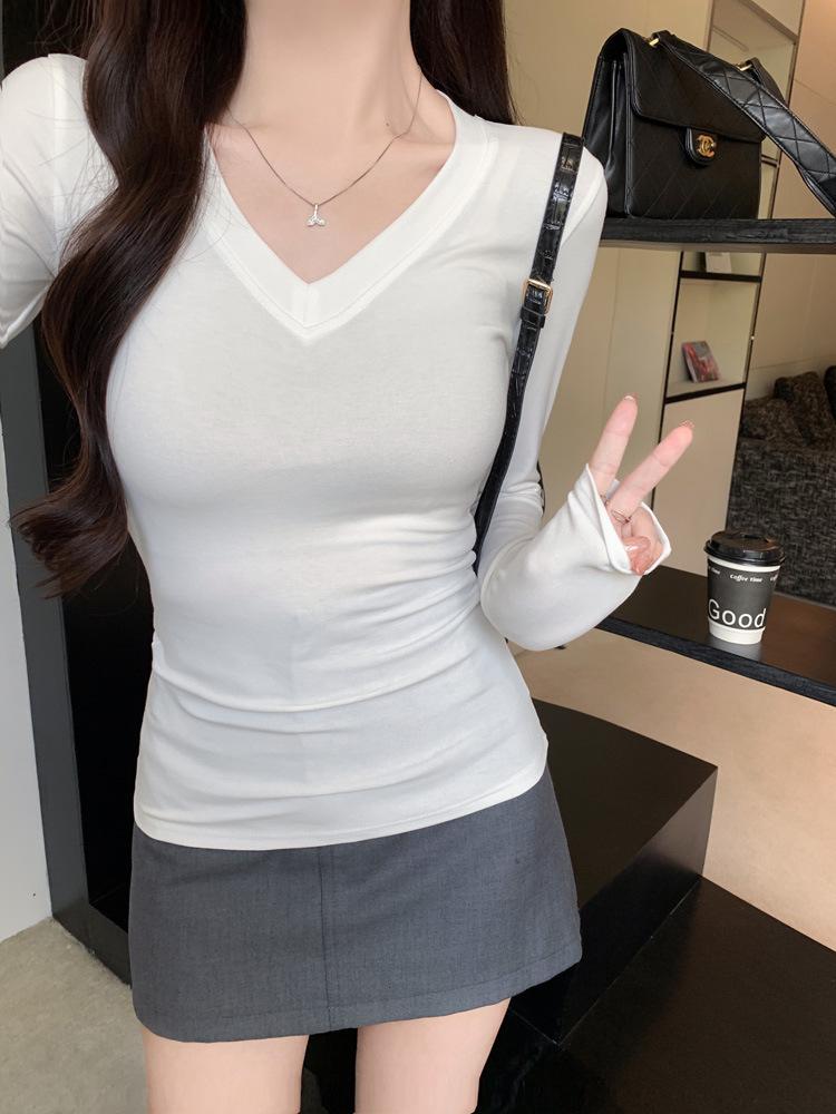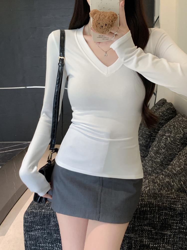 Venta al por mayor, otoño e invierno, nueva camiseta con cuello en V, camisa de manga larga para mujer, top ajustado con cintura alta y figura estupenda