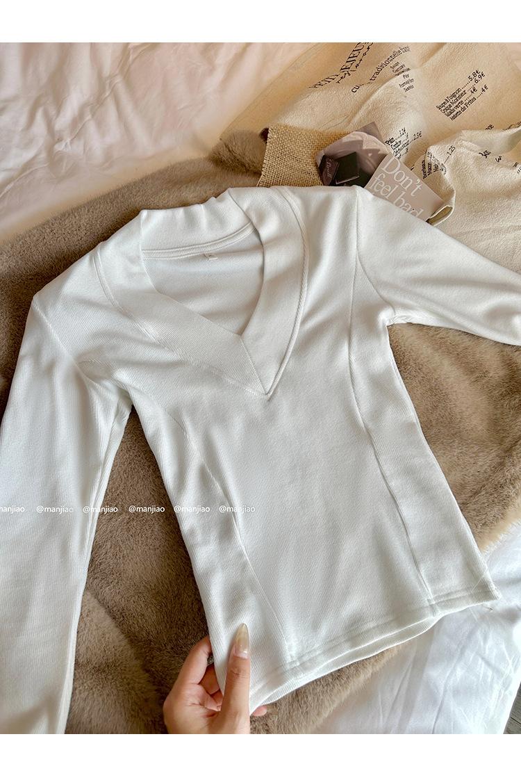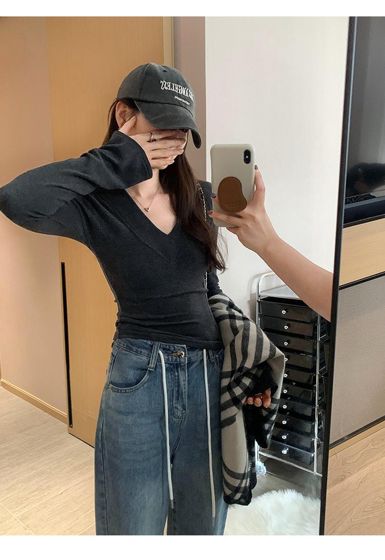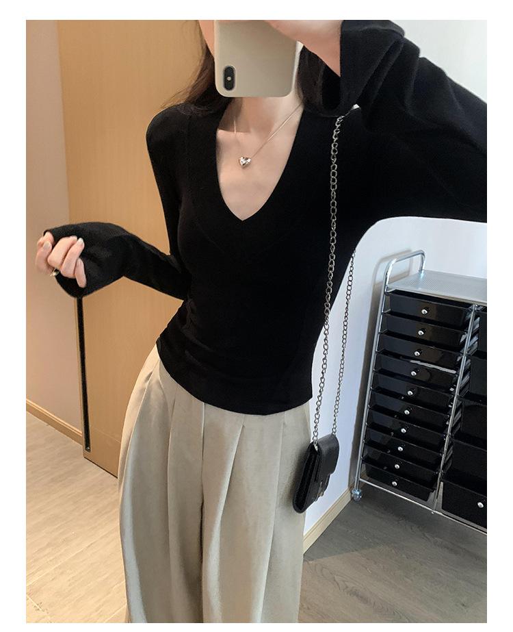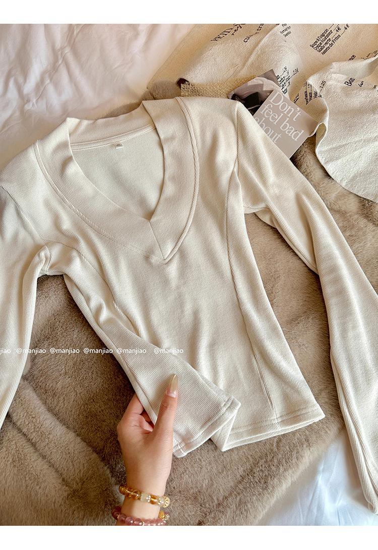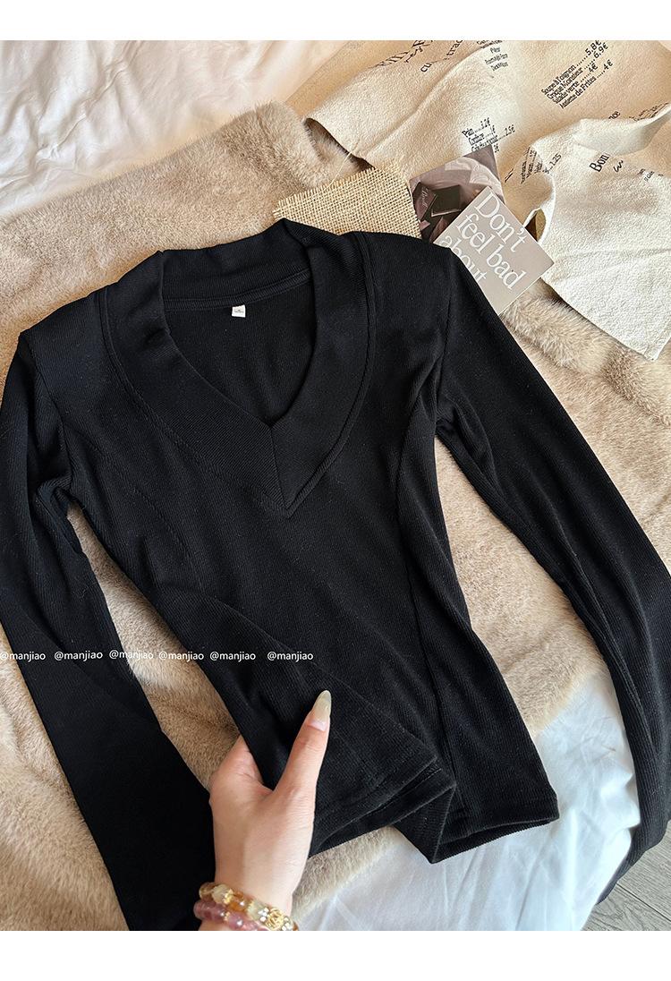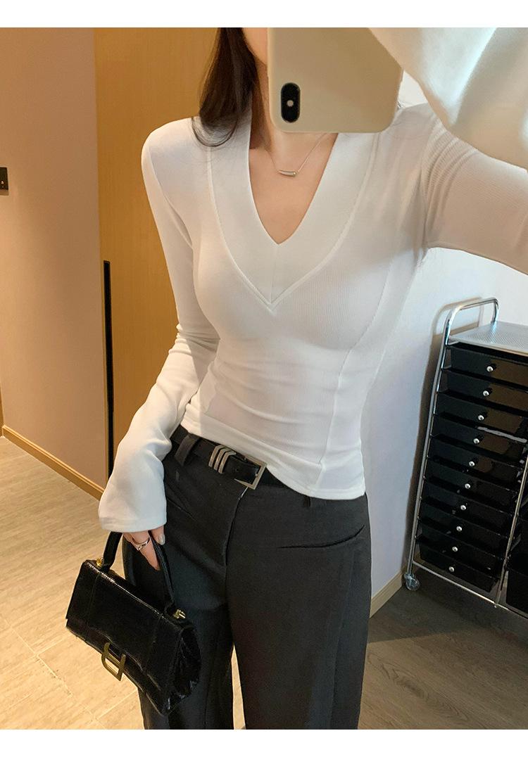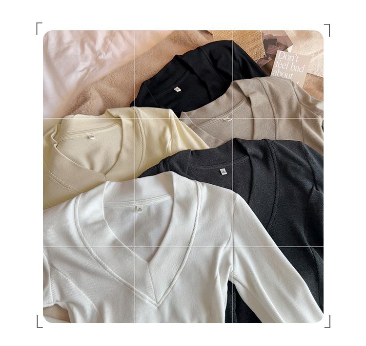 Estilo Yujie Sexy Ajustado con Hombreras Cuello en V Camiseta Básica para Mujer Estilo Otoño 2025 Camiseta Interior para Mujer