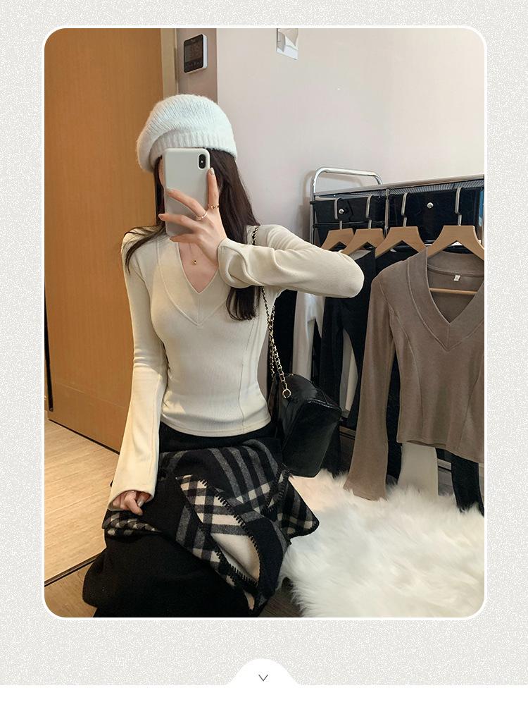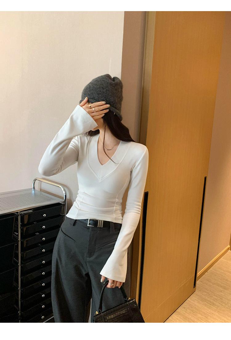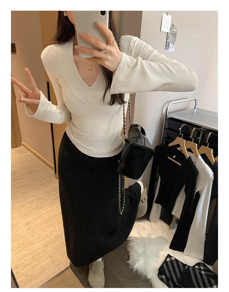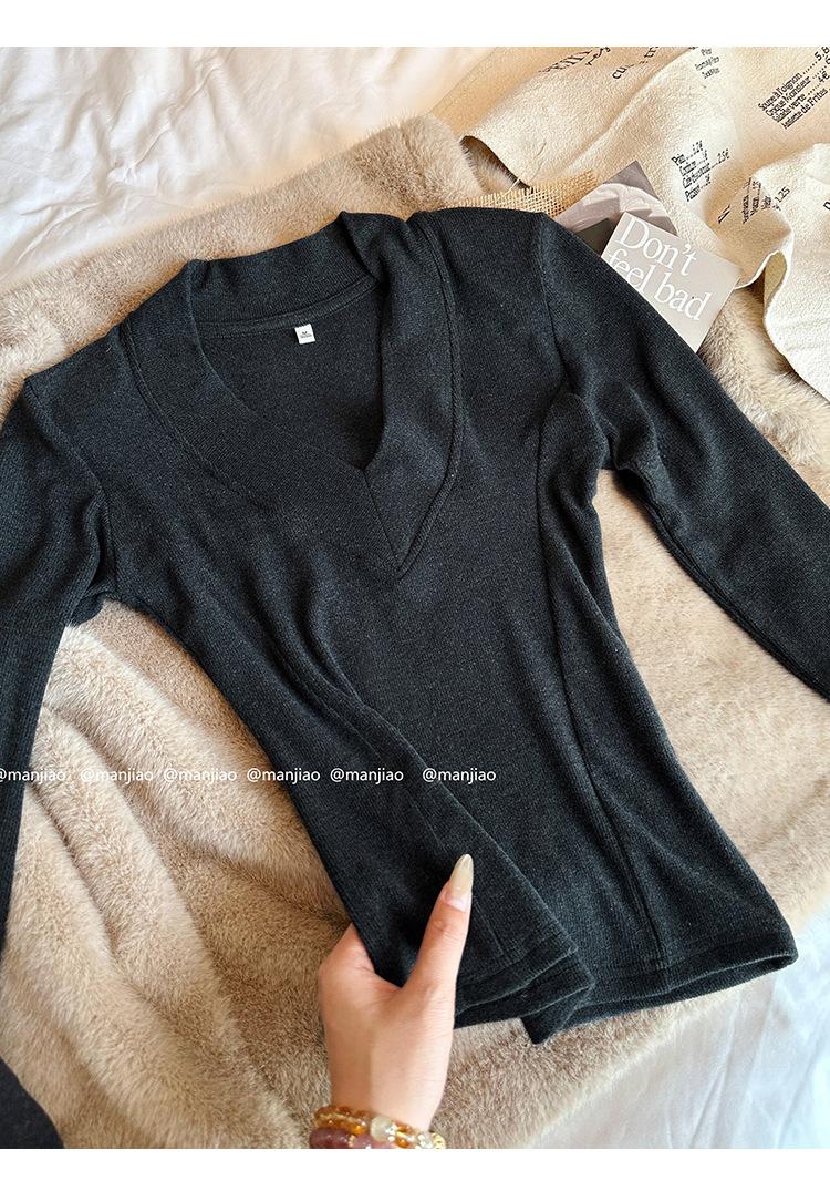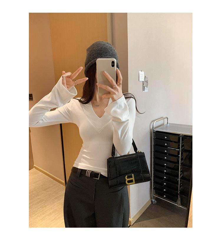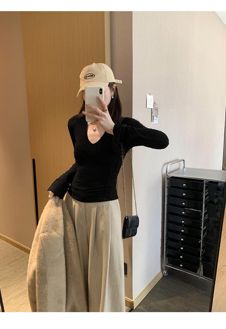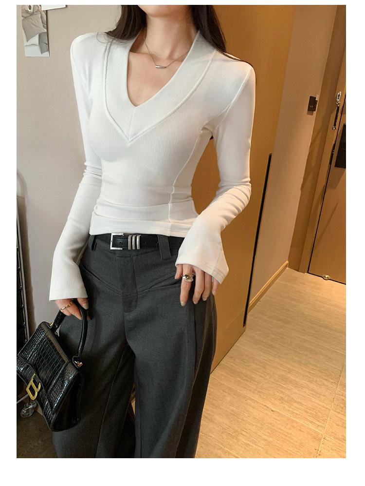 Estilo Yujie Sexy Ajustado con Hombreras Cuello en V Camiseta Básica para Mujer Estilo Otoño 2025 Camiseta Interior para Mujer