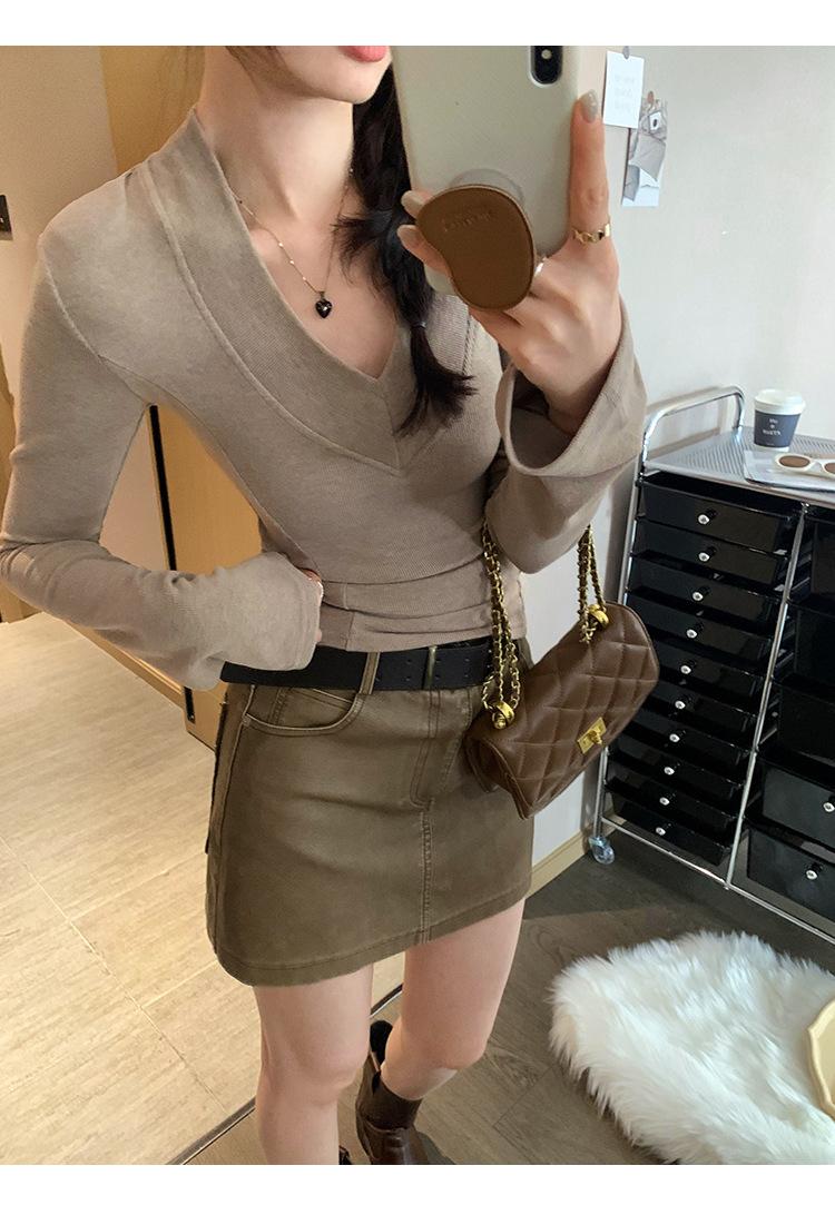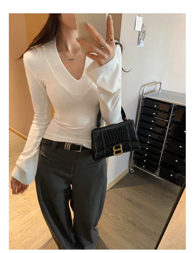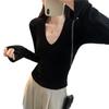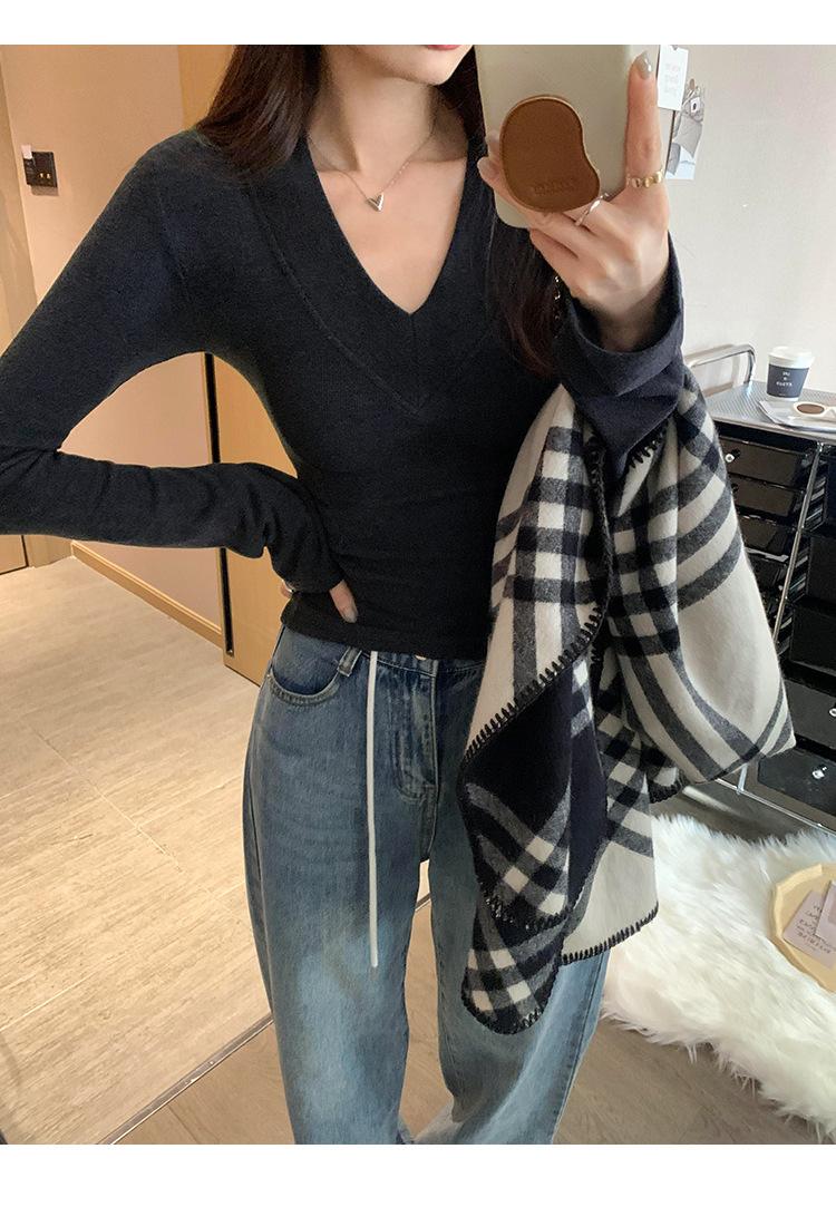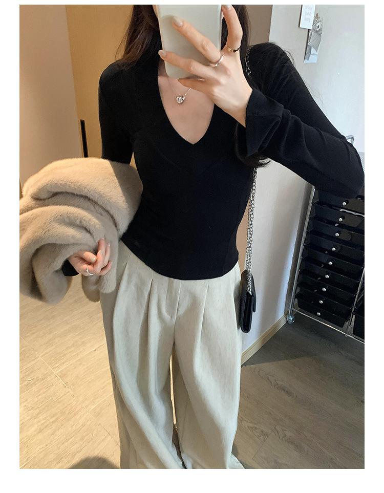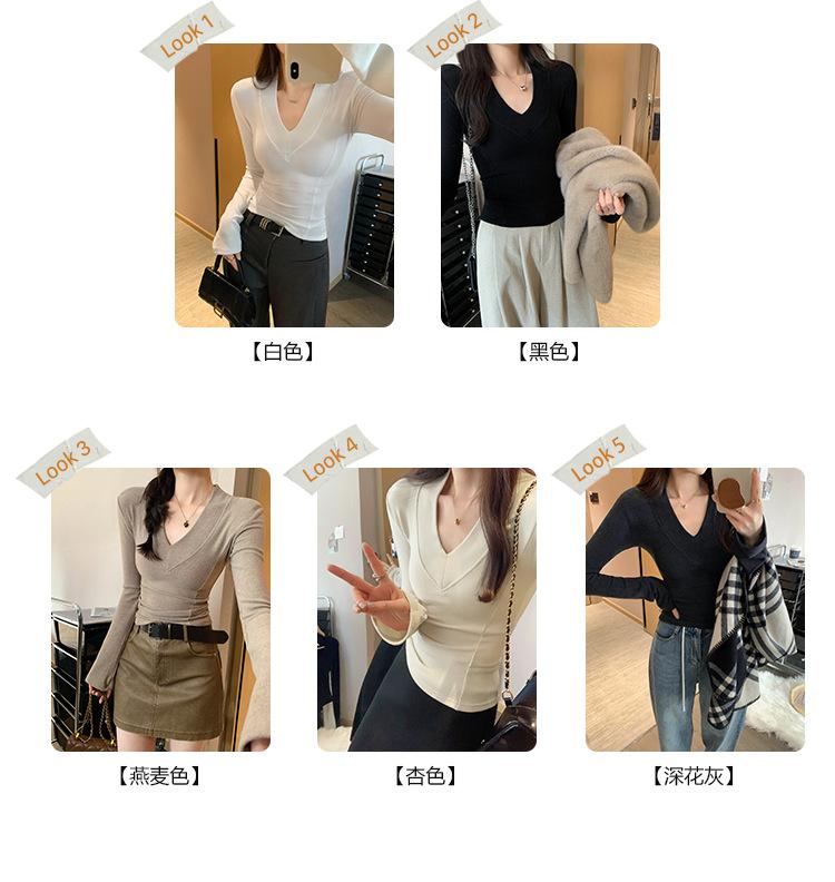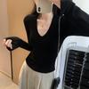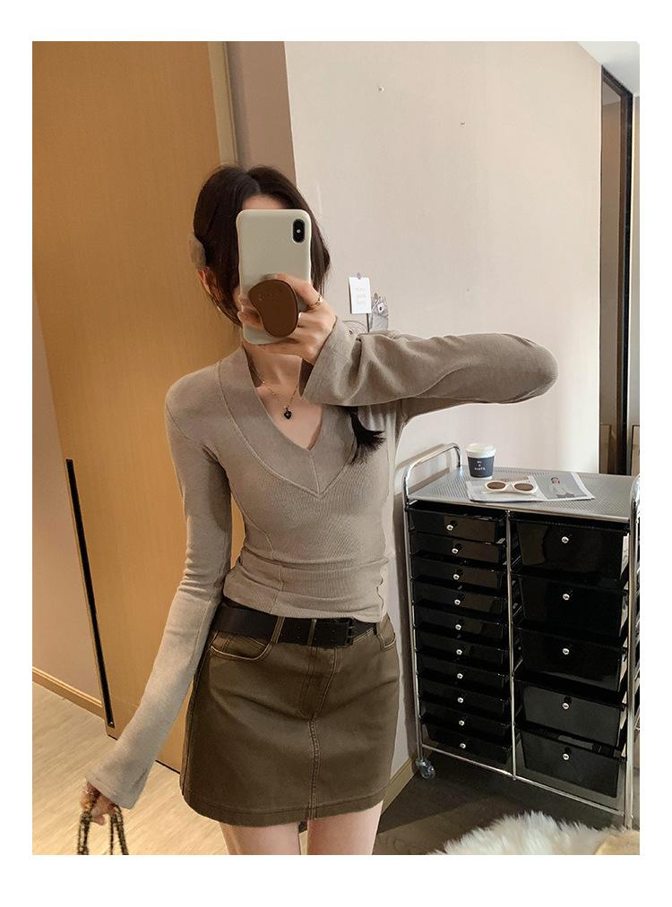 Estilo Yujie Sexy Ajustado con Hombreras Cuello en V Camiseta Básica para Mujer Estilo Otoño 2025 Camiseta Interior para Mujer