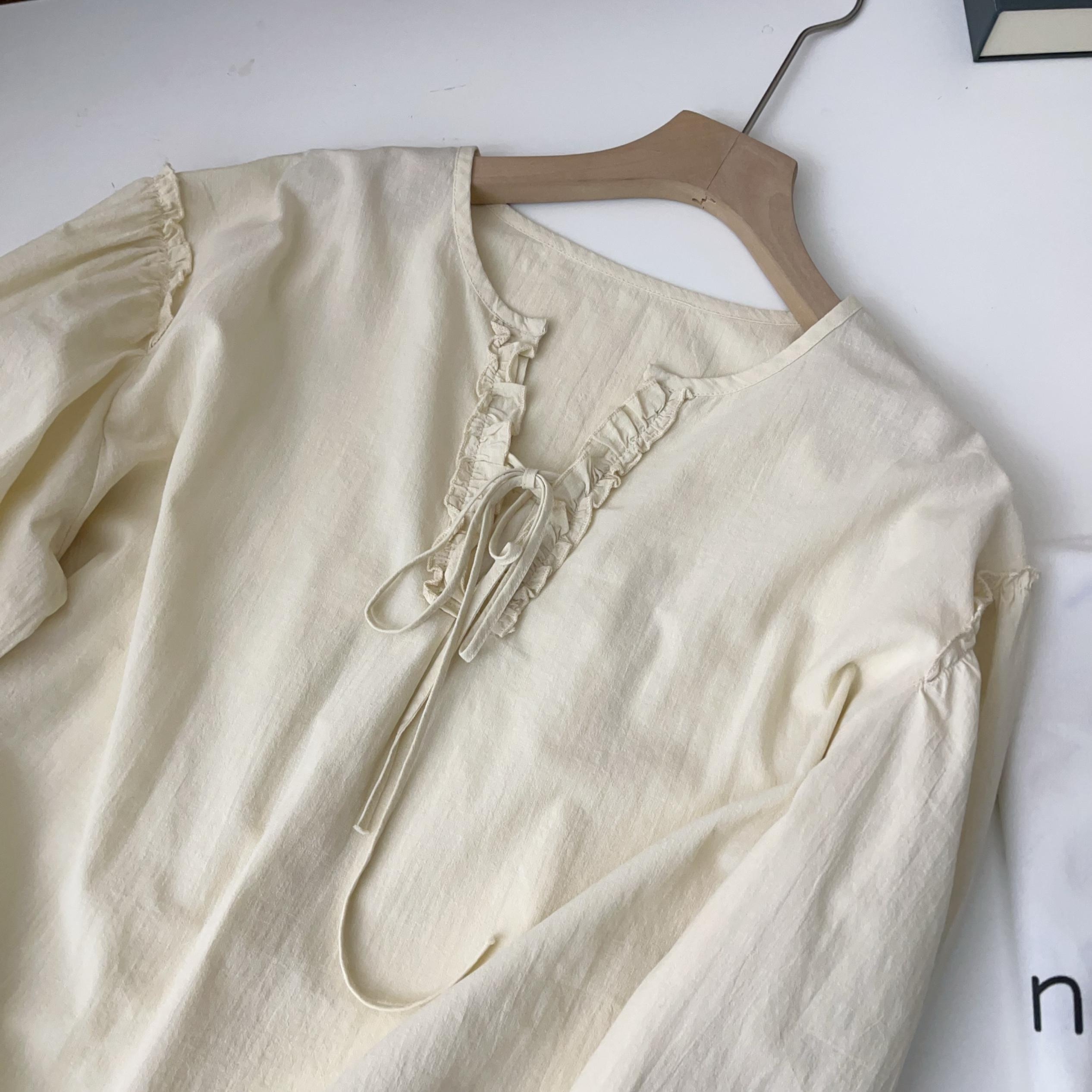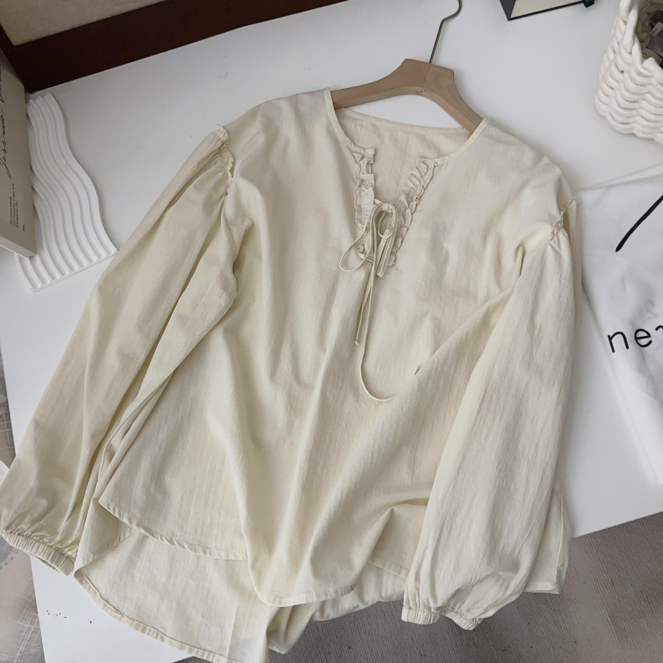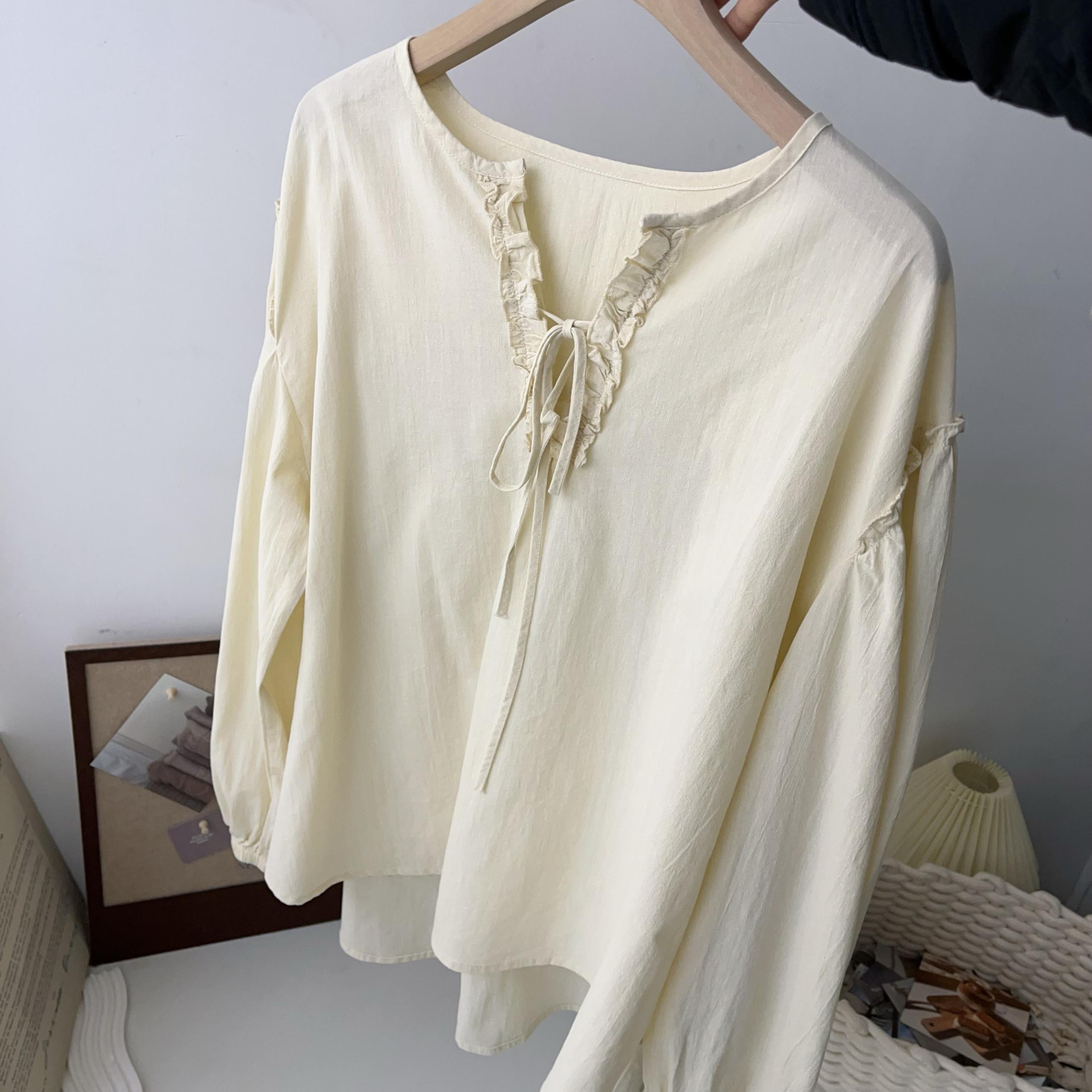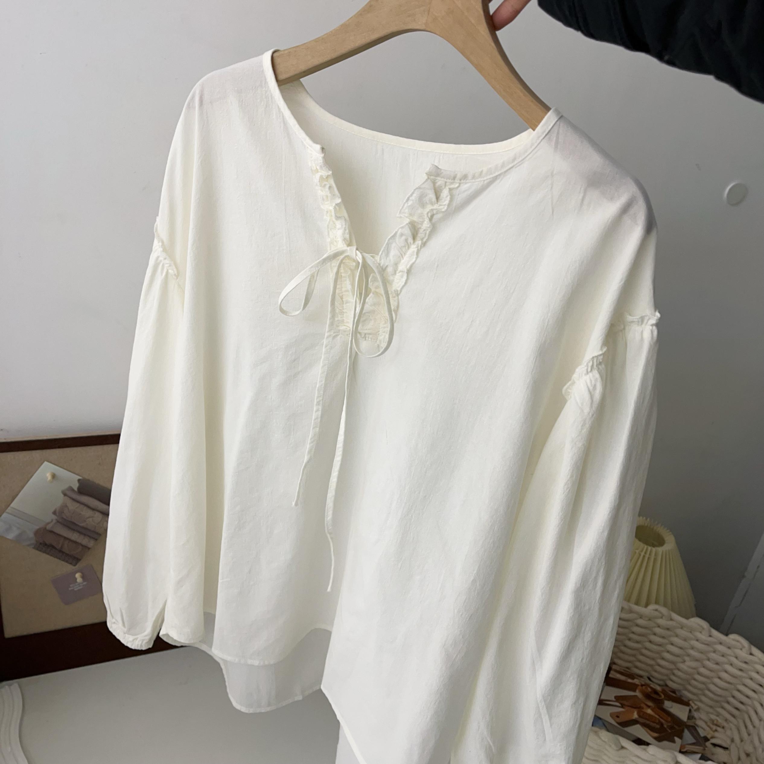 Camisa holgada y adelgazante de estilo coreano para mujer, con cuello en V, con cordones y combinable, para principios de primavera