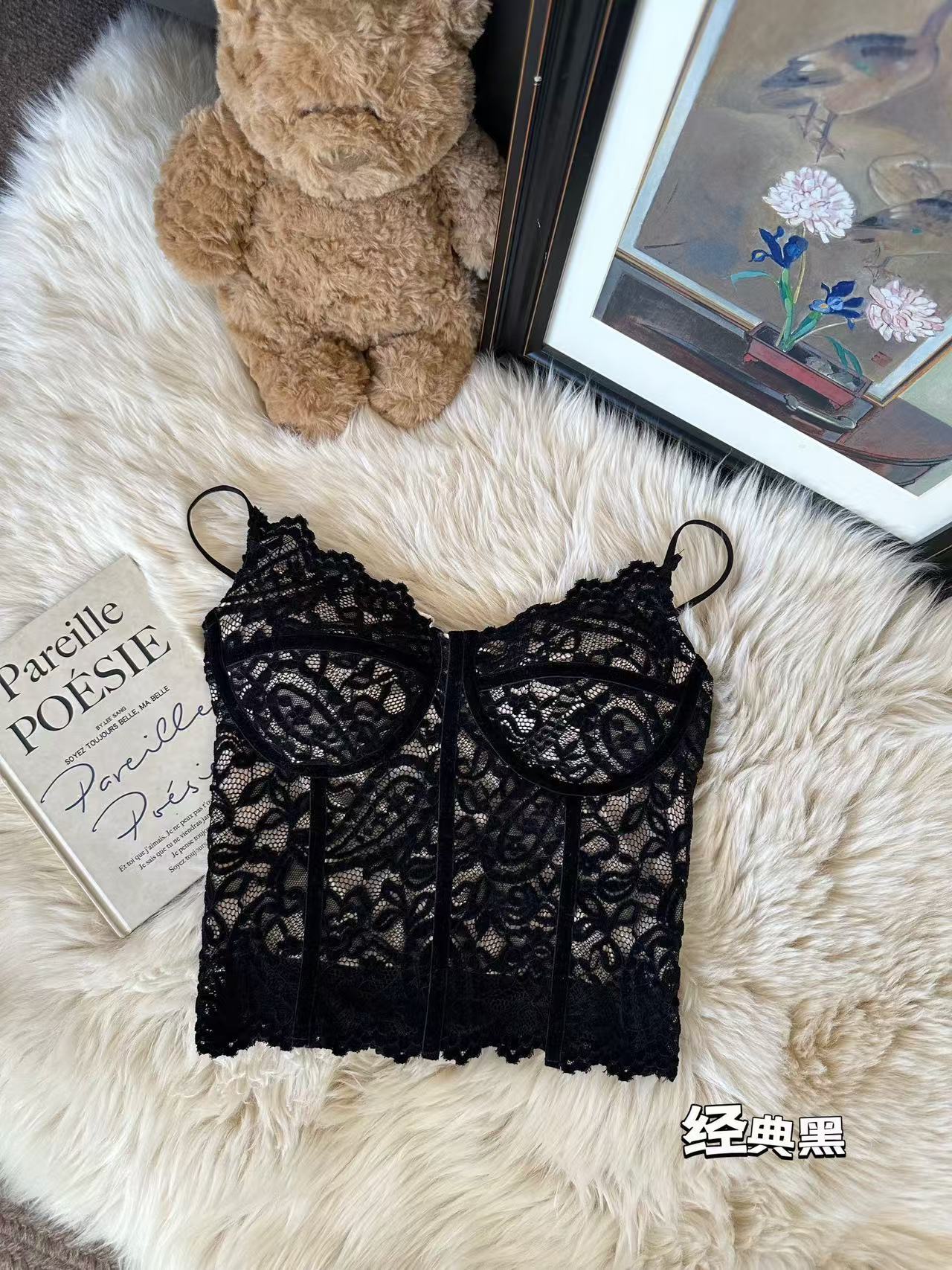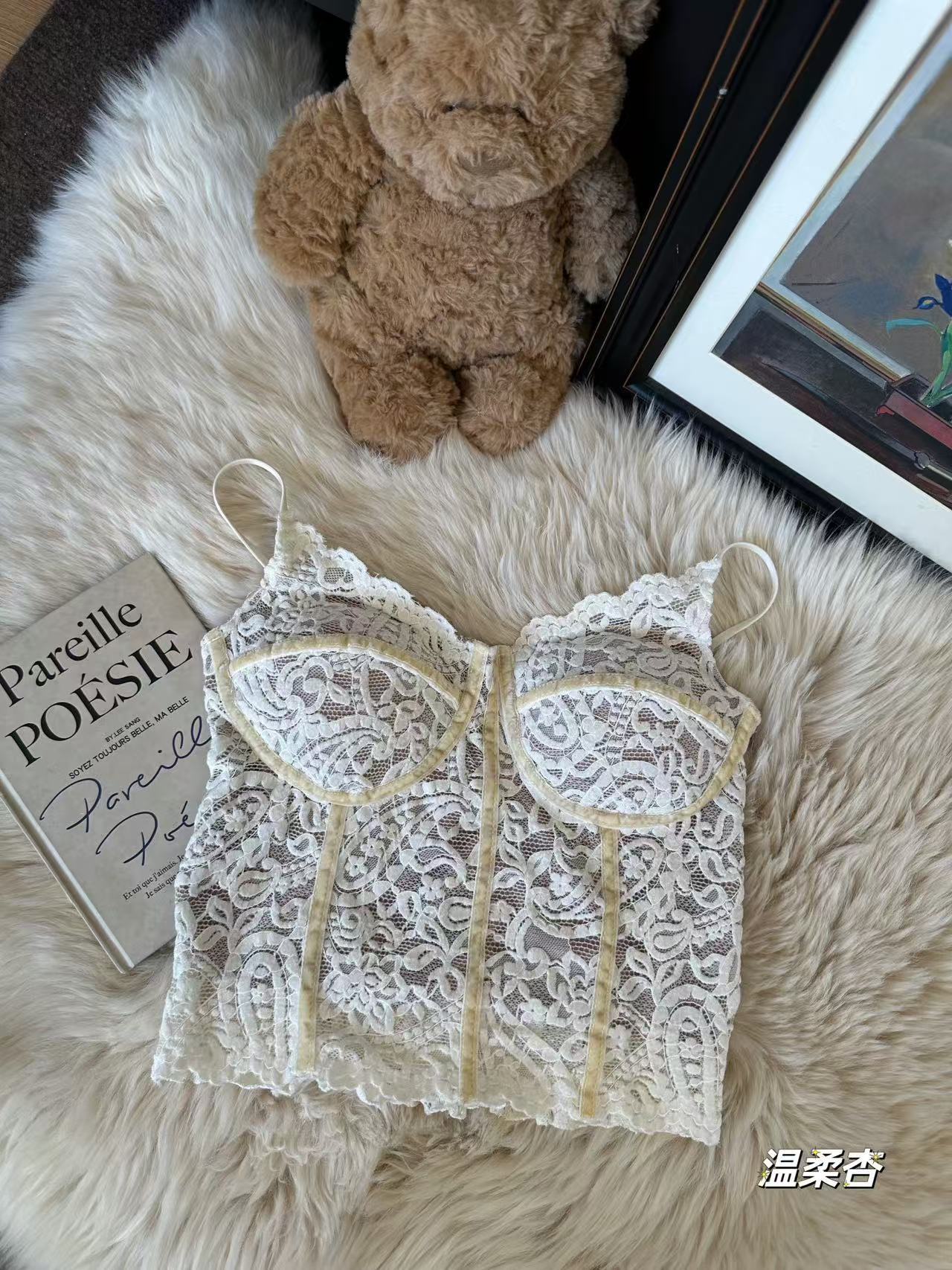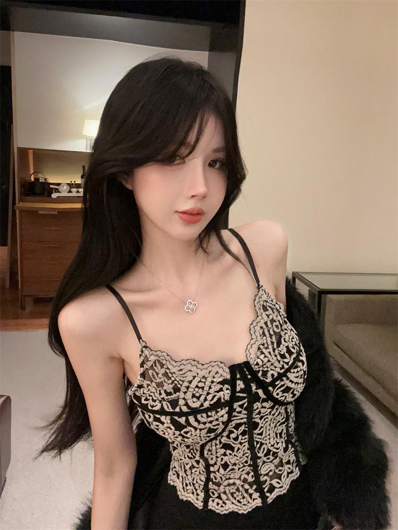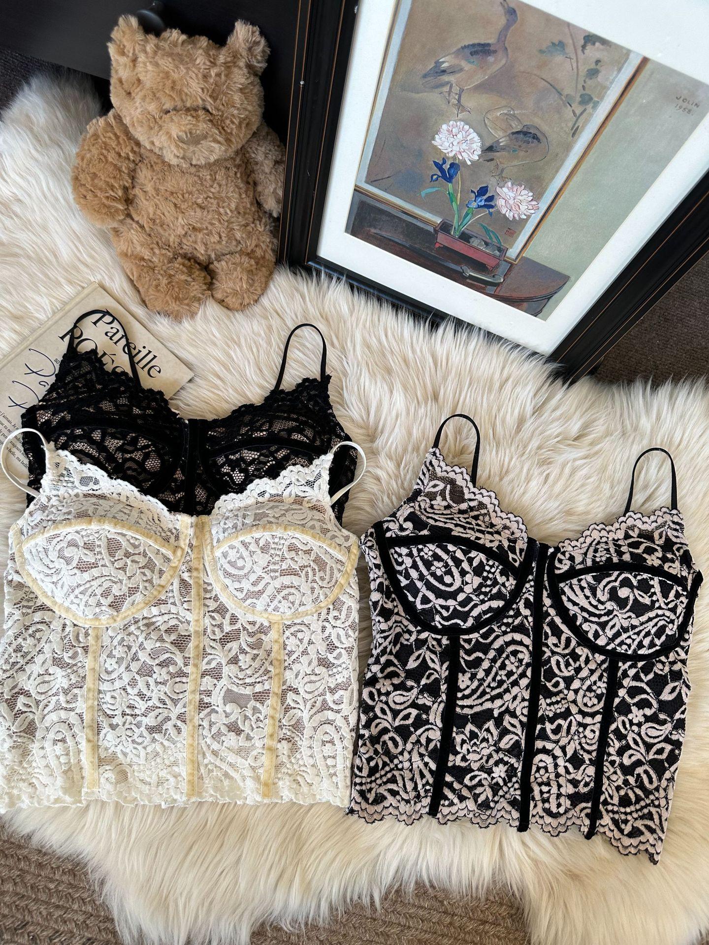 Camisola de Encaje Bordado Pure Desire para Mujer Estilo Francés Estilo Socialité Spice Girl Reductora Top Base con Almohadilla en el Pecho para Mujer 2258