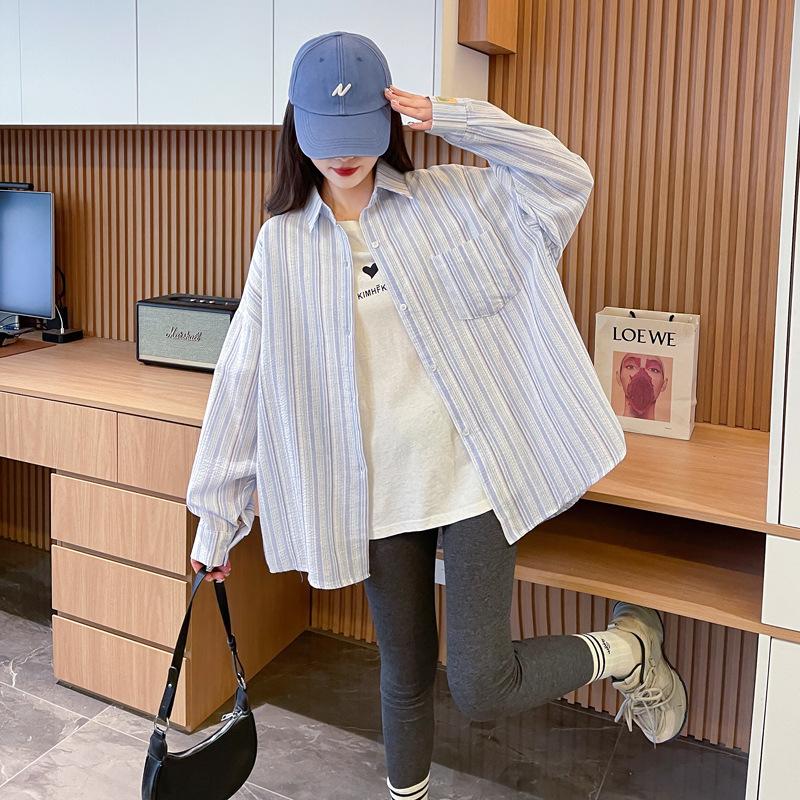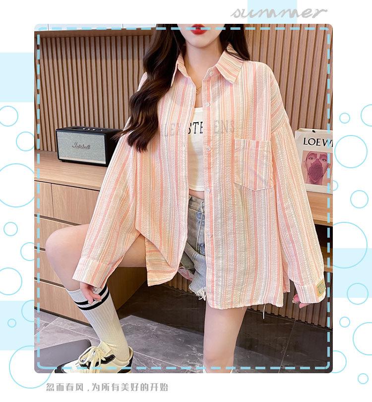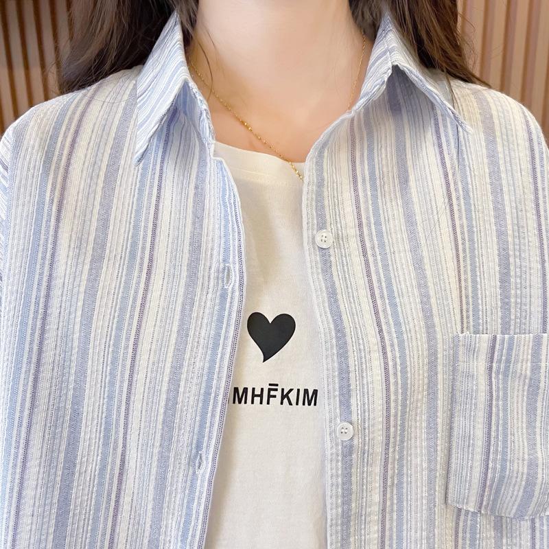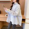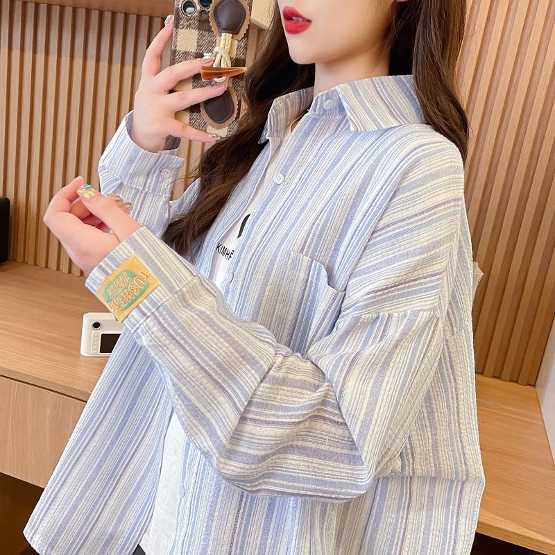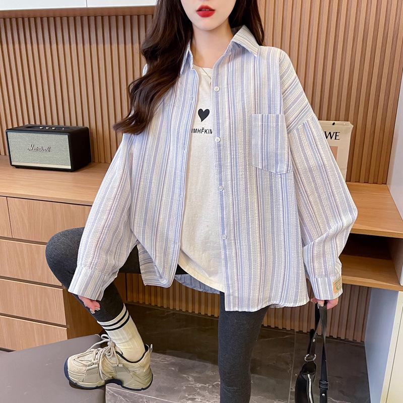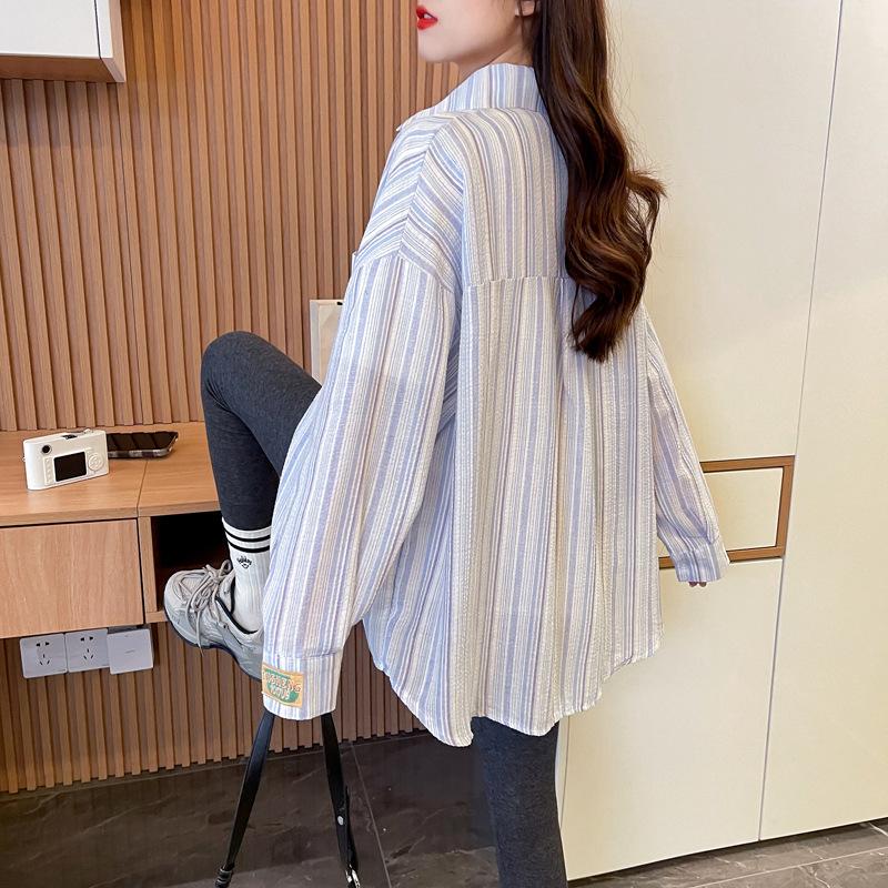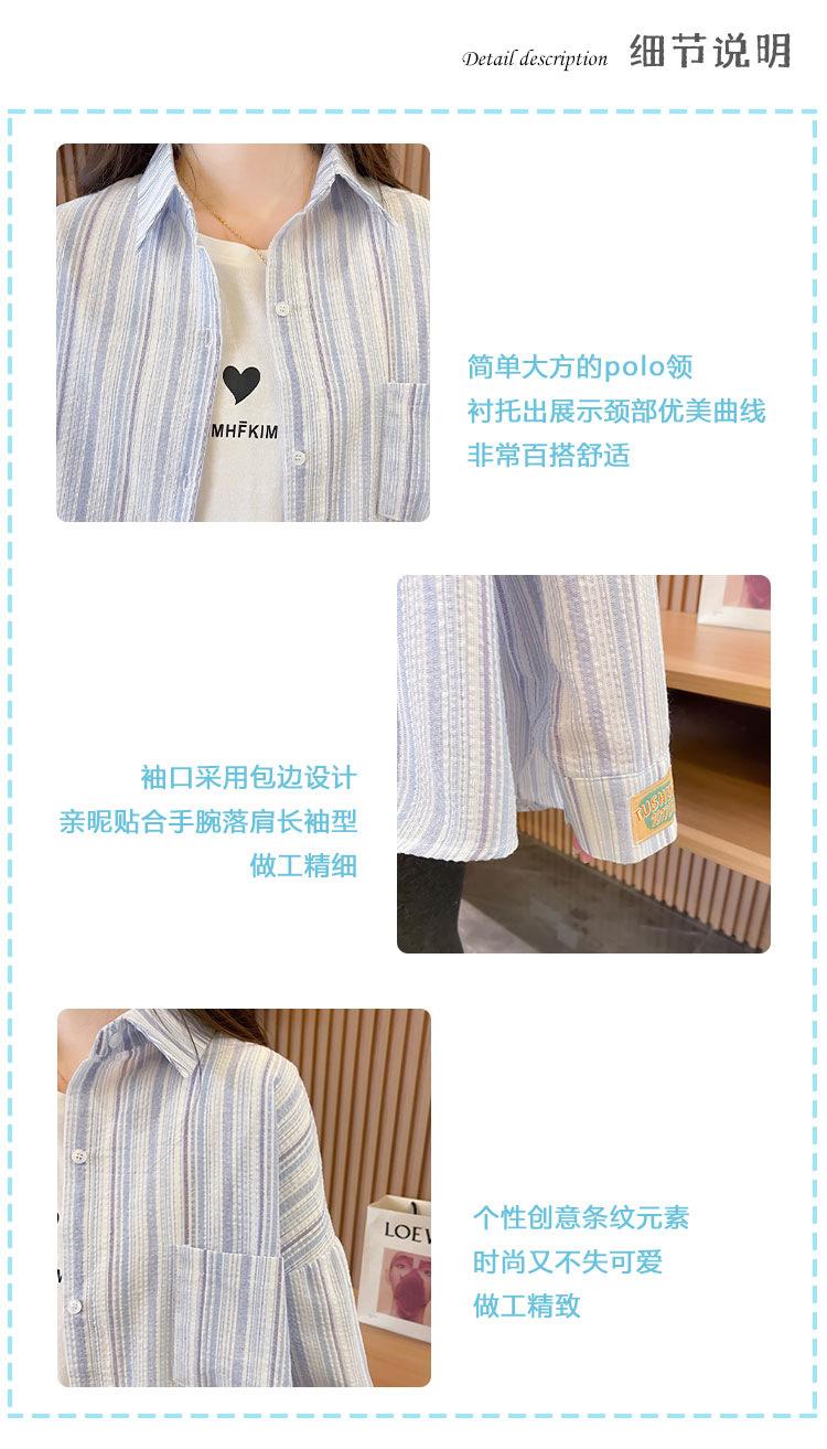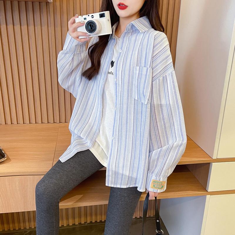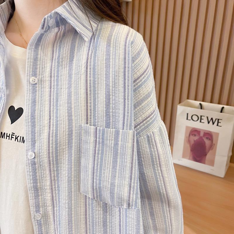 Camisa fina con protector solar para mujer, diseño holgado y perezoso de primavera, otoño y verano, camisa informal de manga larga a rayas azules a la moda
