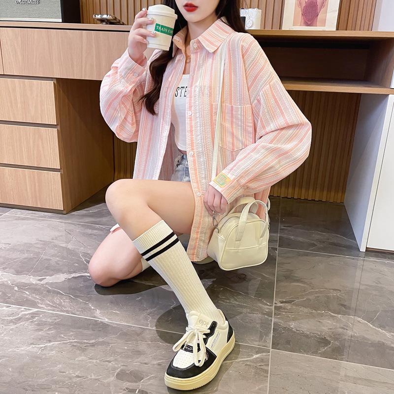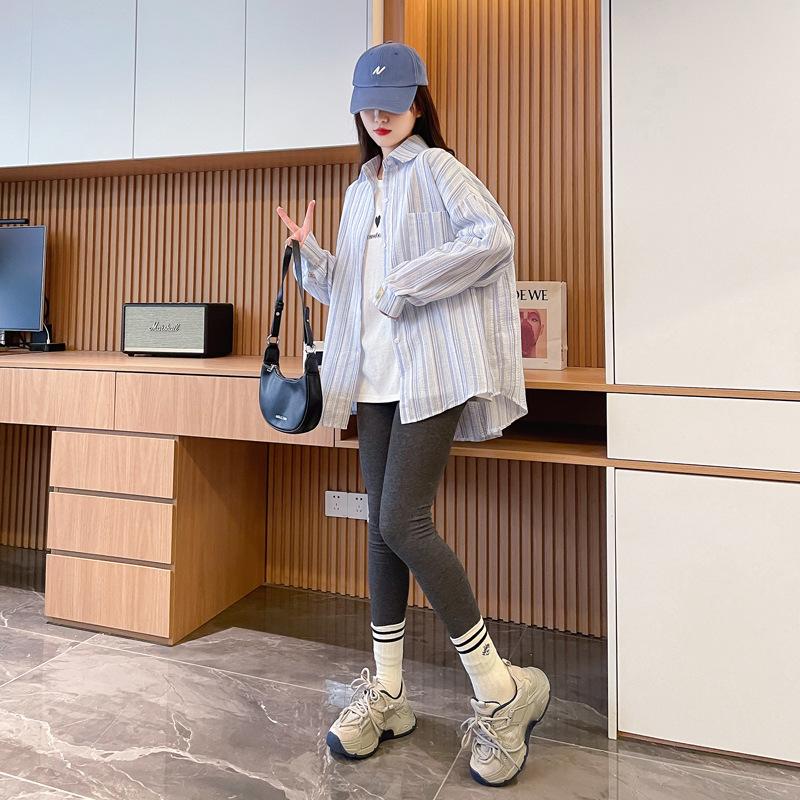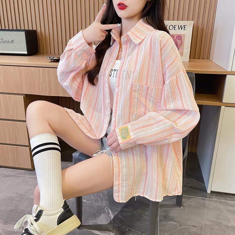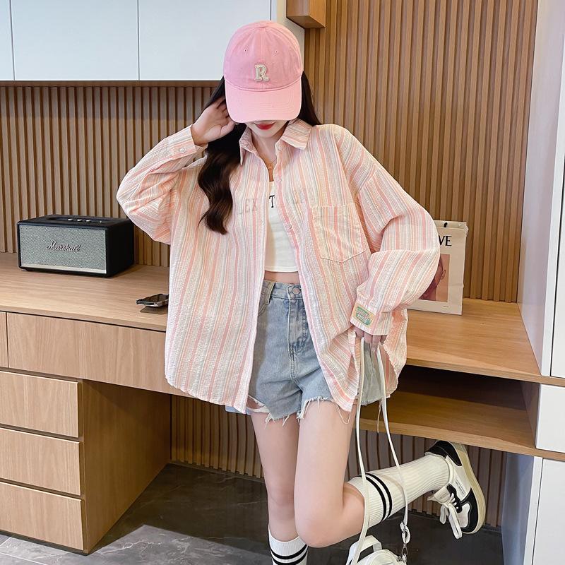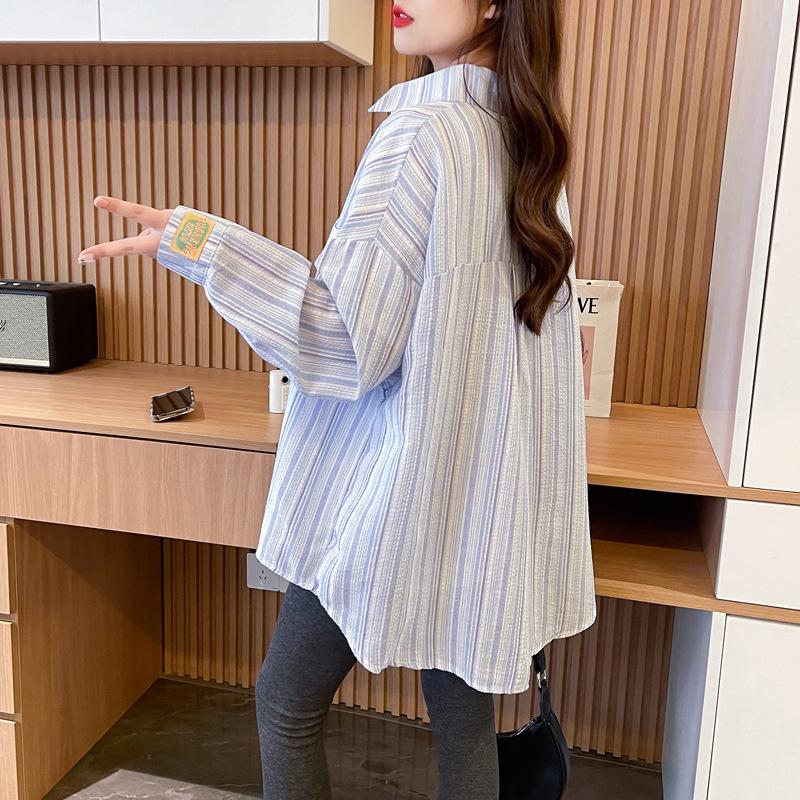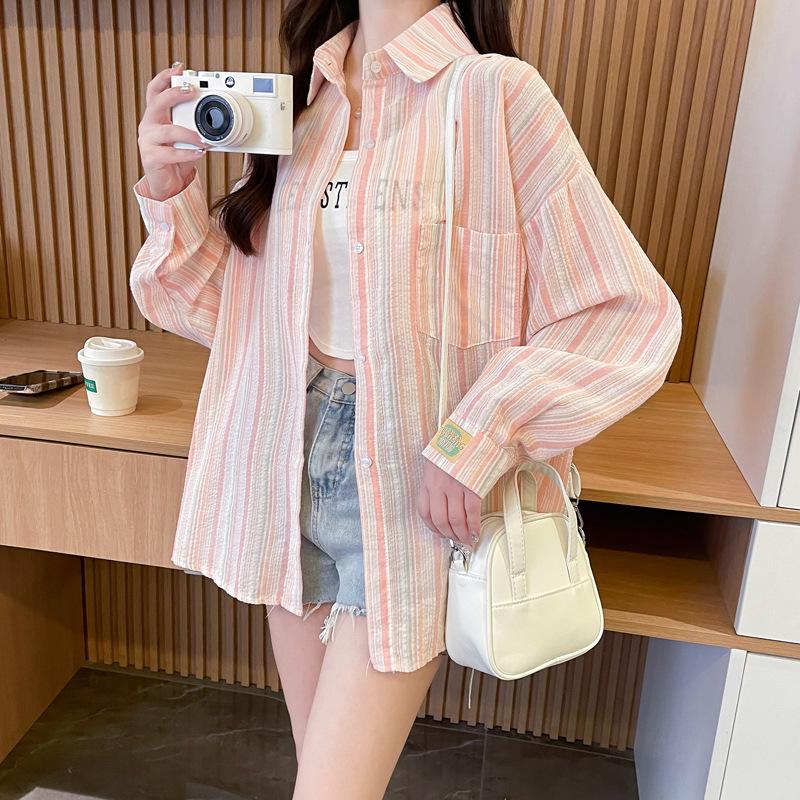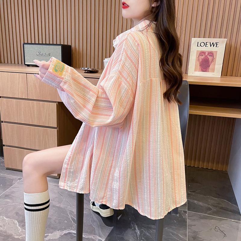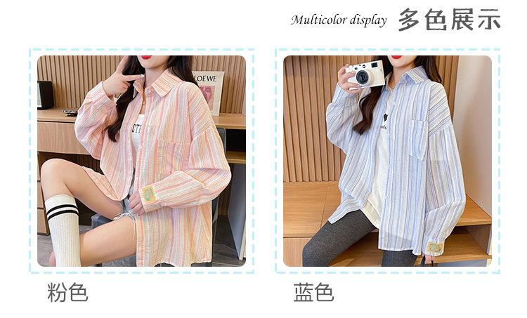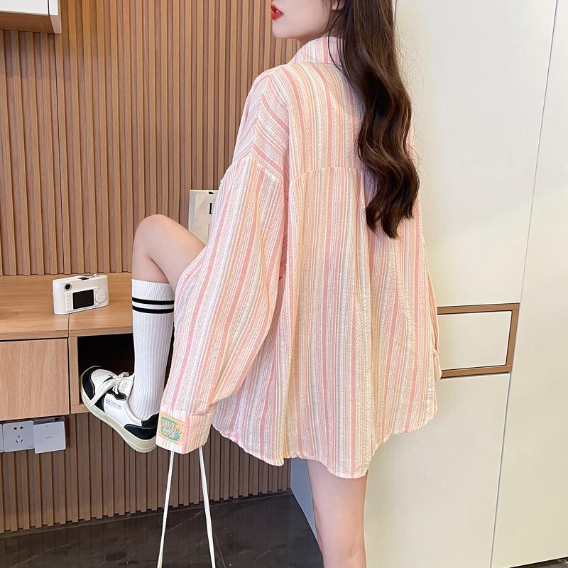 Camisa fina con protector solar para mujer, diseño holgado y perezoso de primavera, otoño y verano, camisa informal de manga larga a rayas azules a la moda