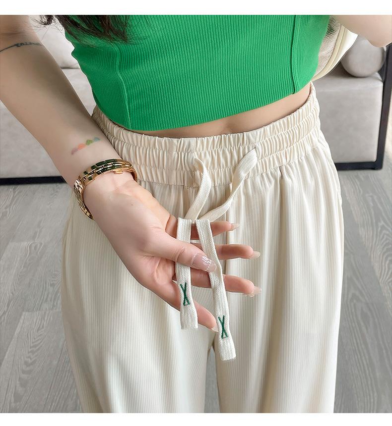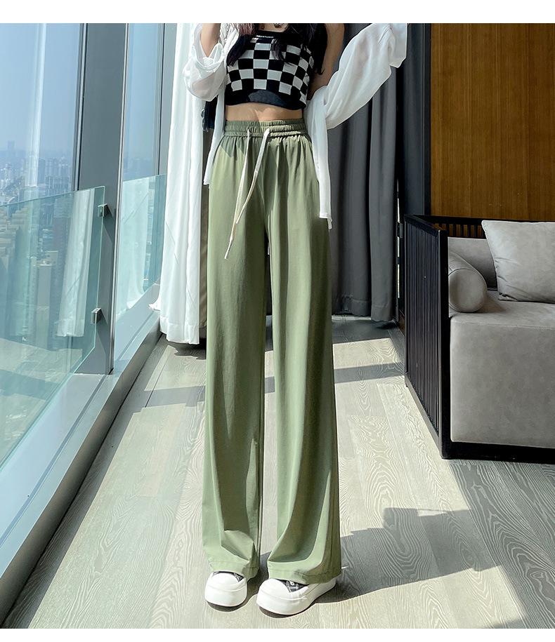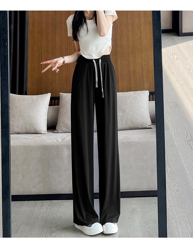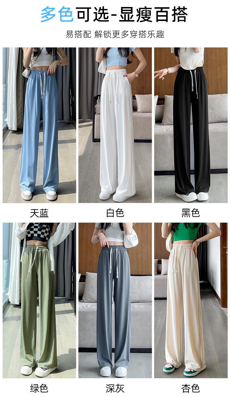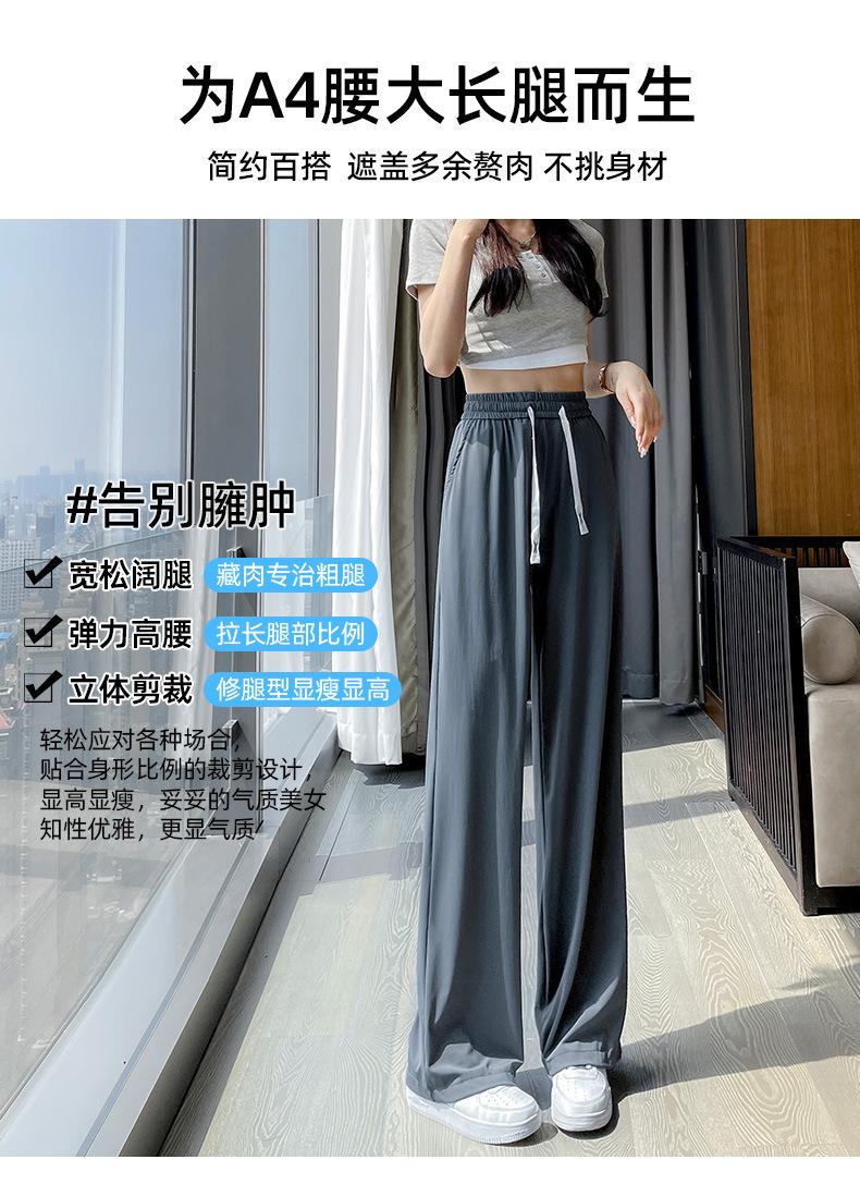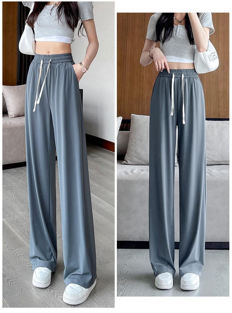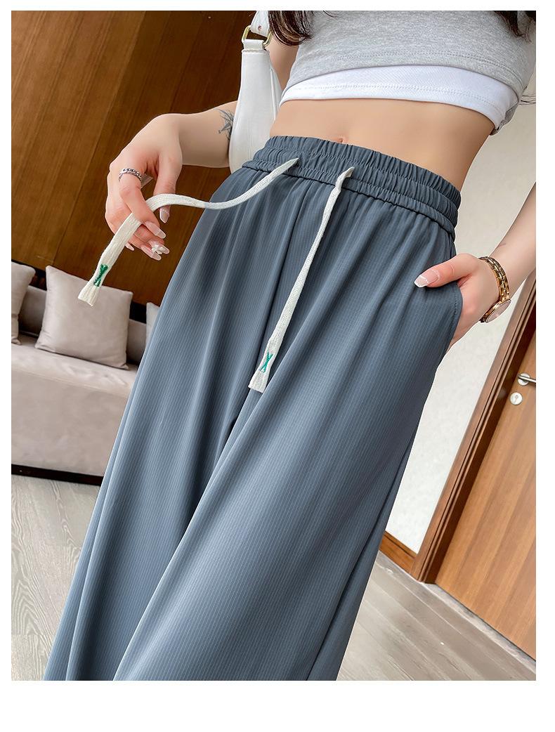 Pantalones anchos de seda de hielo con cordón ajustable para mujer, pantalones rectos holgados de verano 2024, pantalones casuales adelgazantes de talla grande.