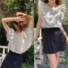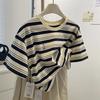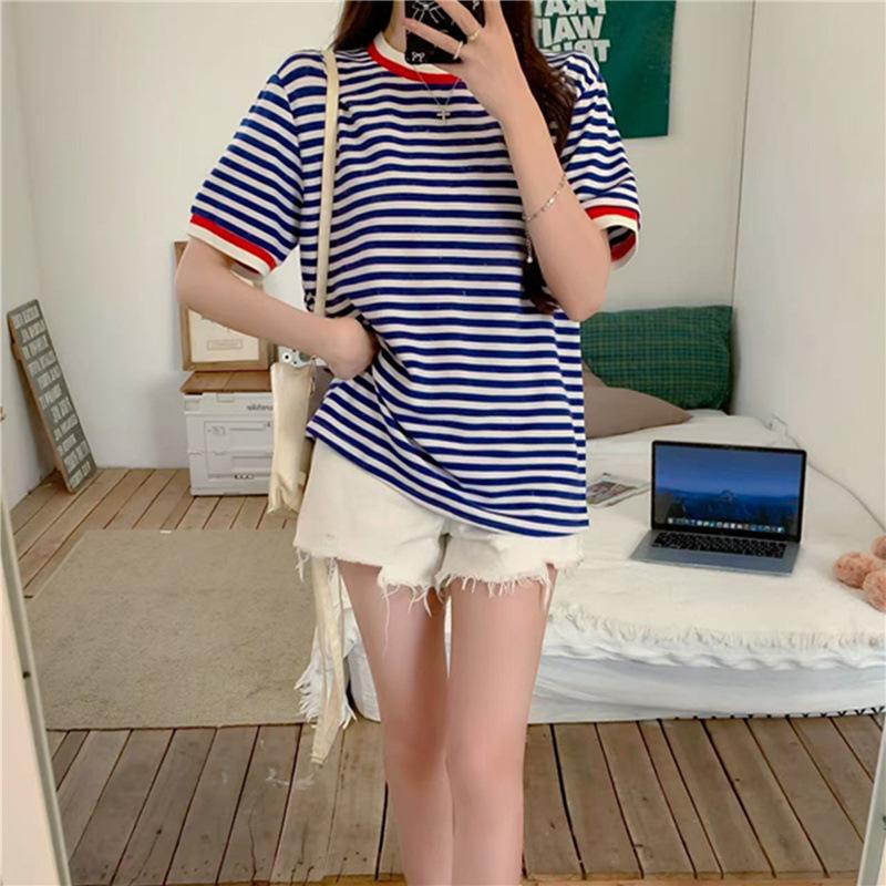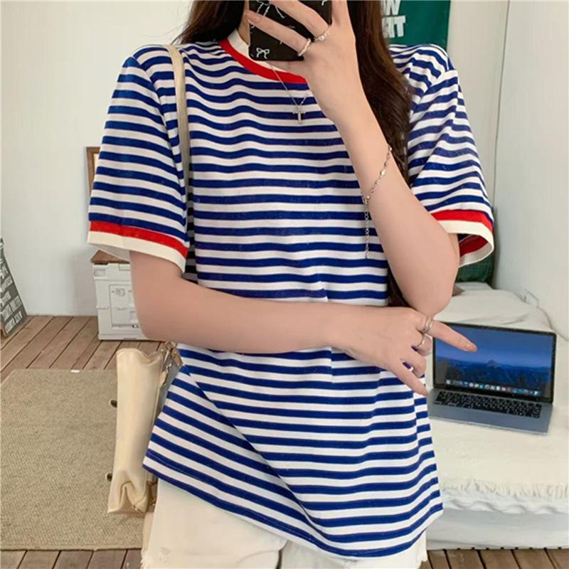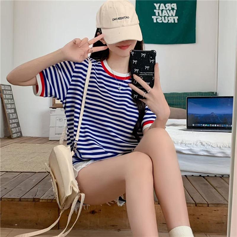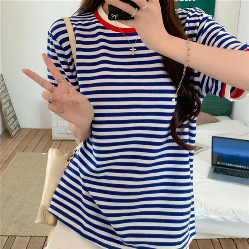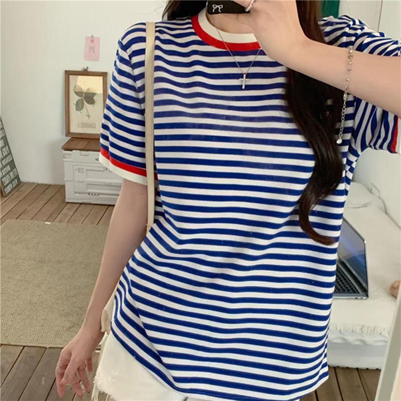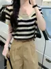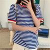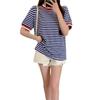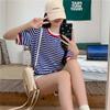 Camiseta de manga corta con rayas retro azules para mujer, diseño de estilo universitario de verano 2025, top holgado con hombros descubiertos