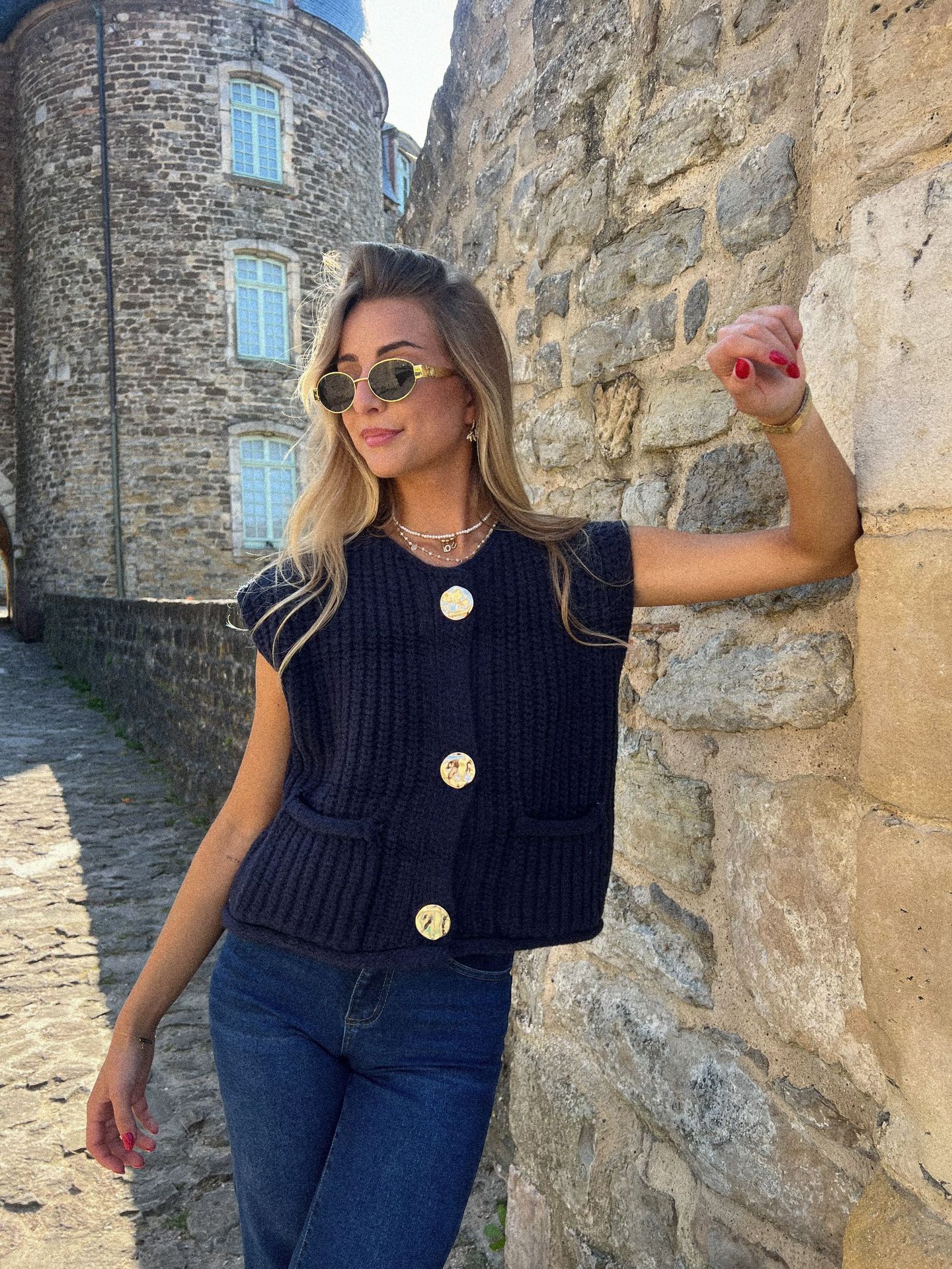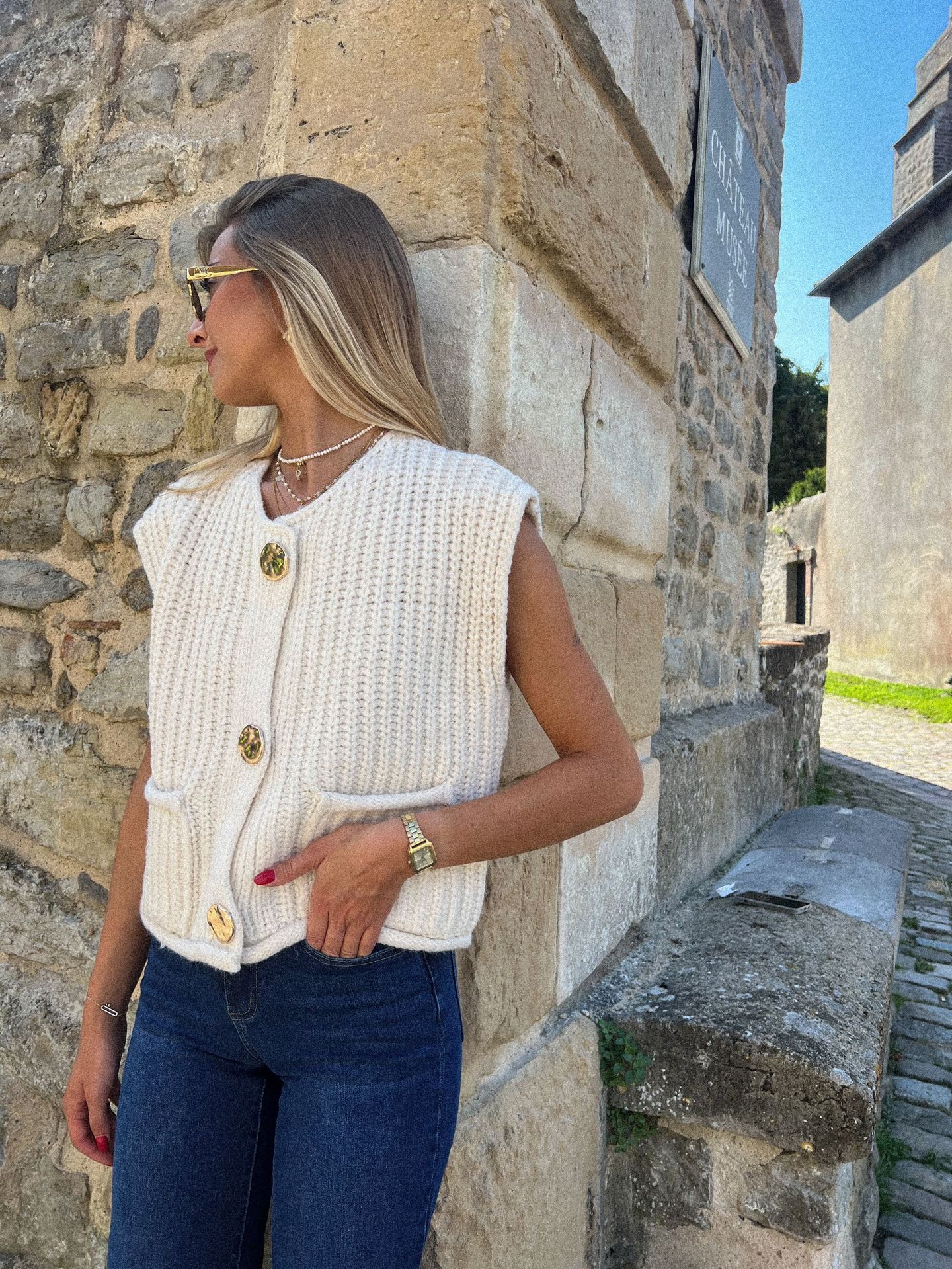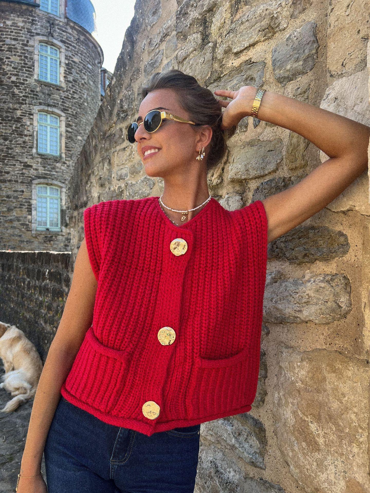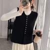 Chaleco de Moda Europeo y Americano para Mujer Nuevo Transfronterizo con Bolsillo, sin Mangas, Corto, de Punto
