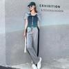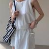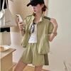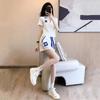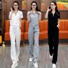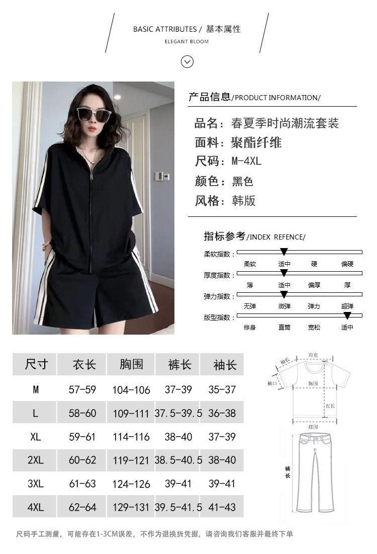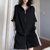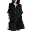 Traje Deportivo con Cremallera para Mujer 2024 Verano Nuevo Versátil Chaqueta de Manga Corta a Rayas Pantalones Cortos de Pierna Ancha Negro Conjunto de Dos Piezas