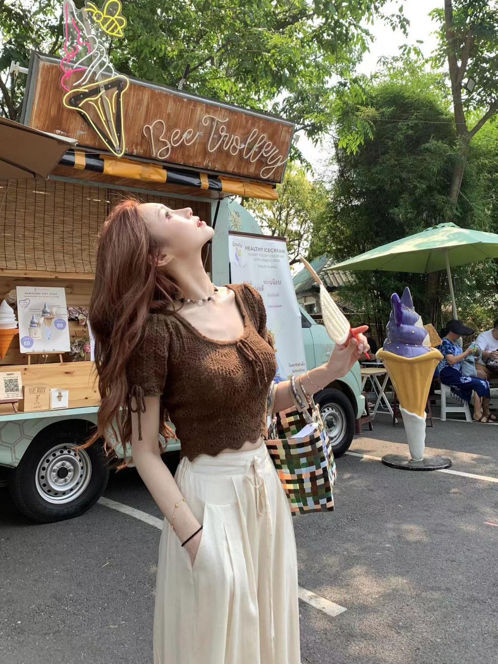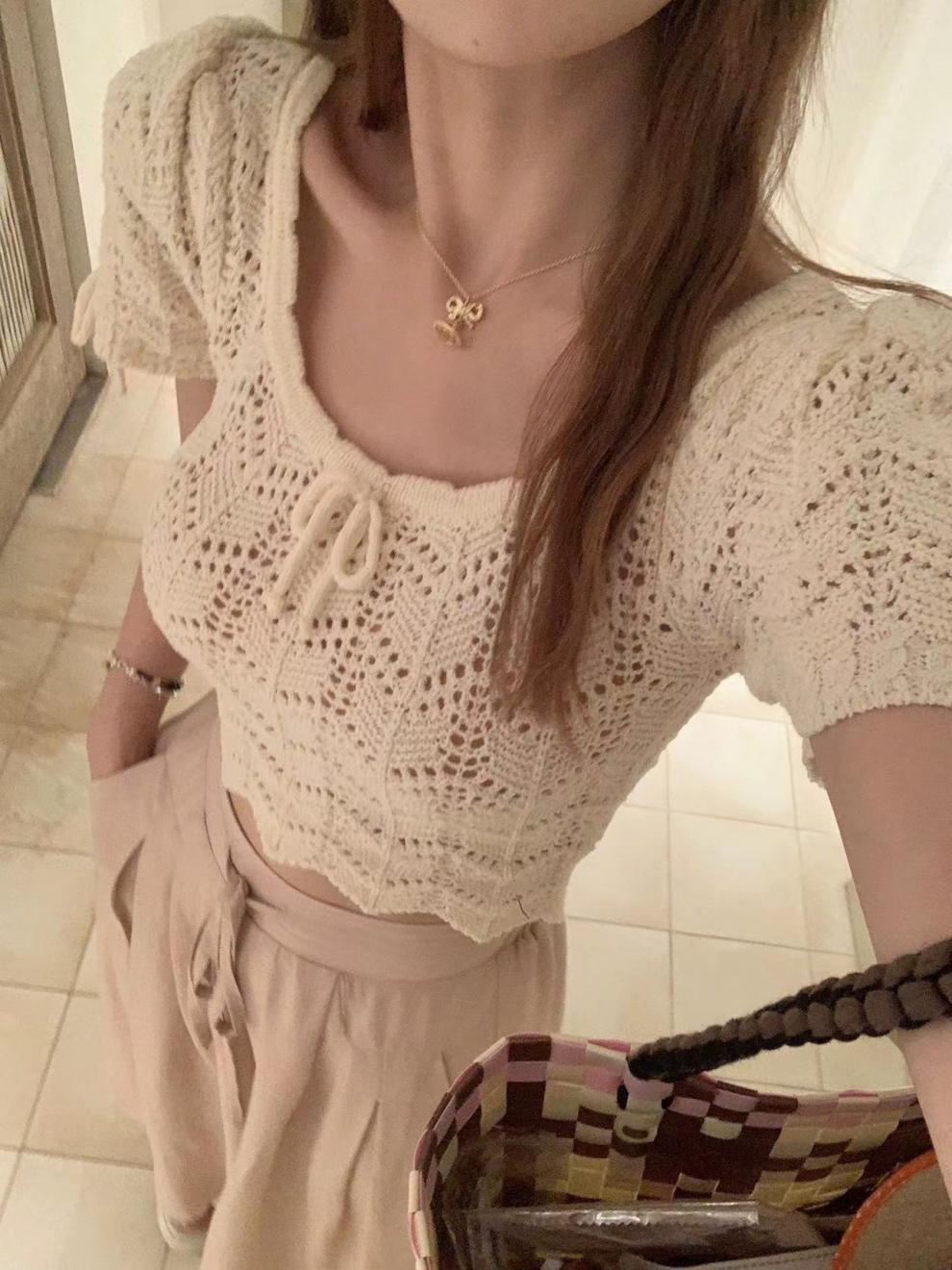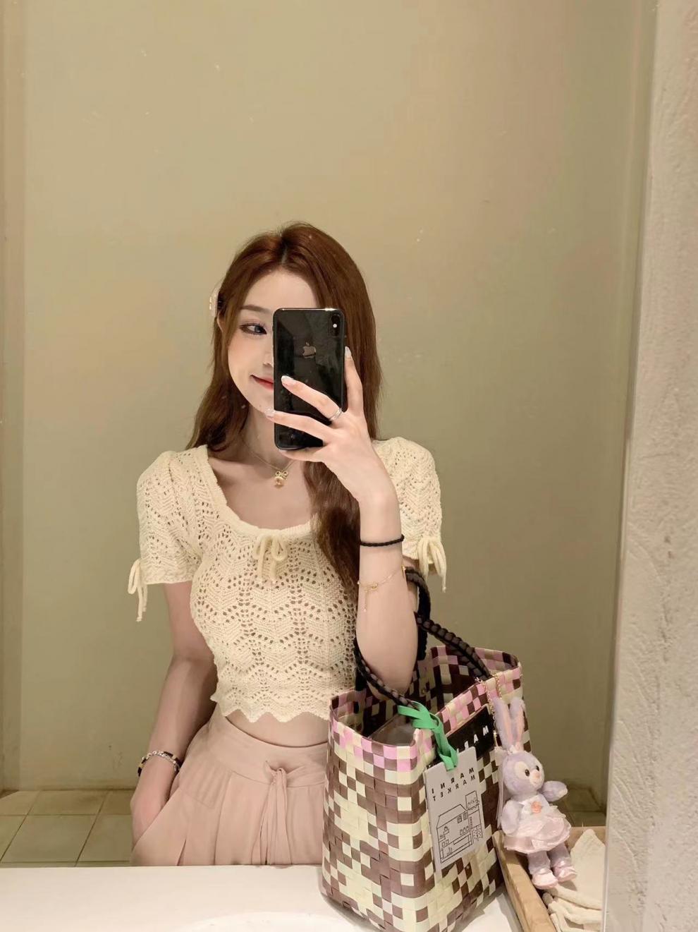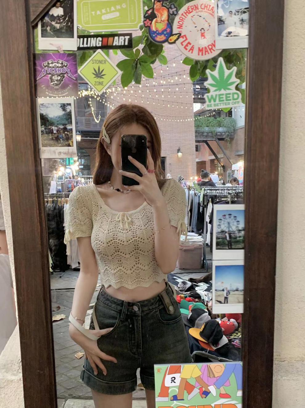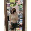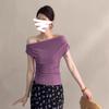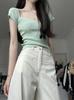 Playera de Punto de Manga Corta con Cuello U Grande Recortada para Chica Caliente con Hombro Derecho Descubierto para Mujer Verano de Cintura Alta con Aspecto Adelgazante Top Corto