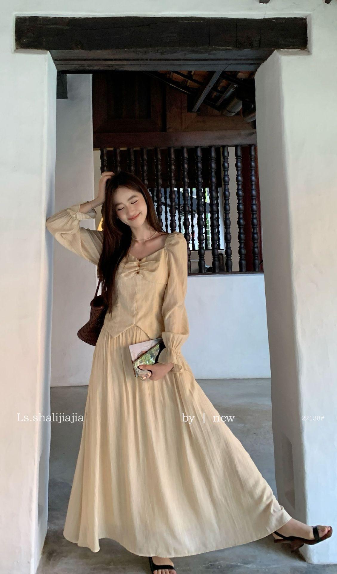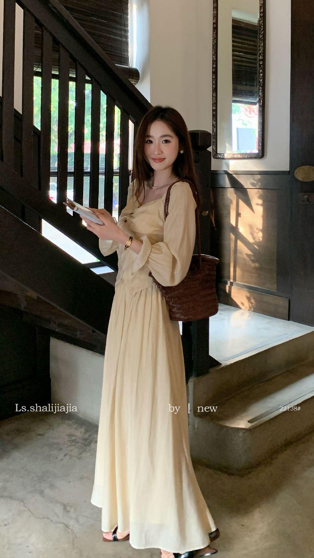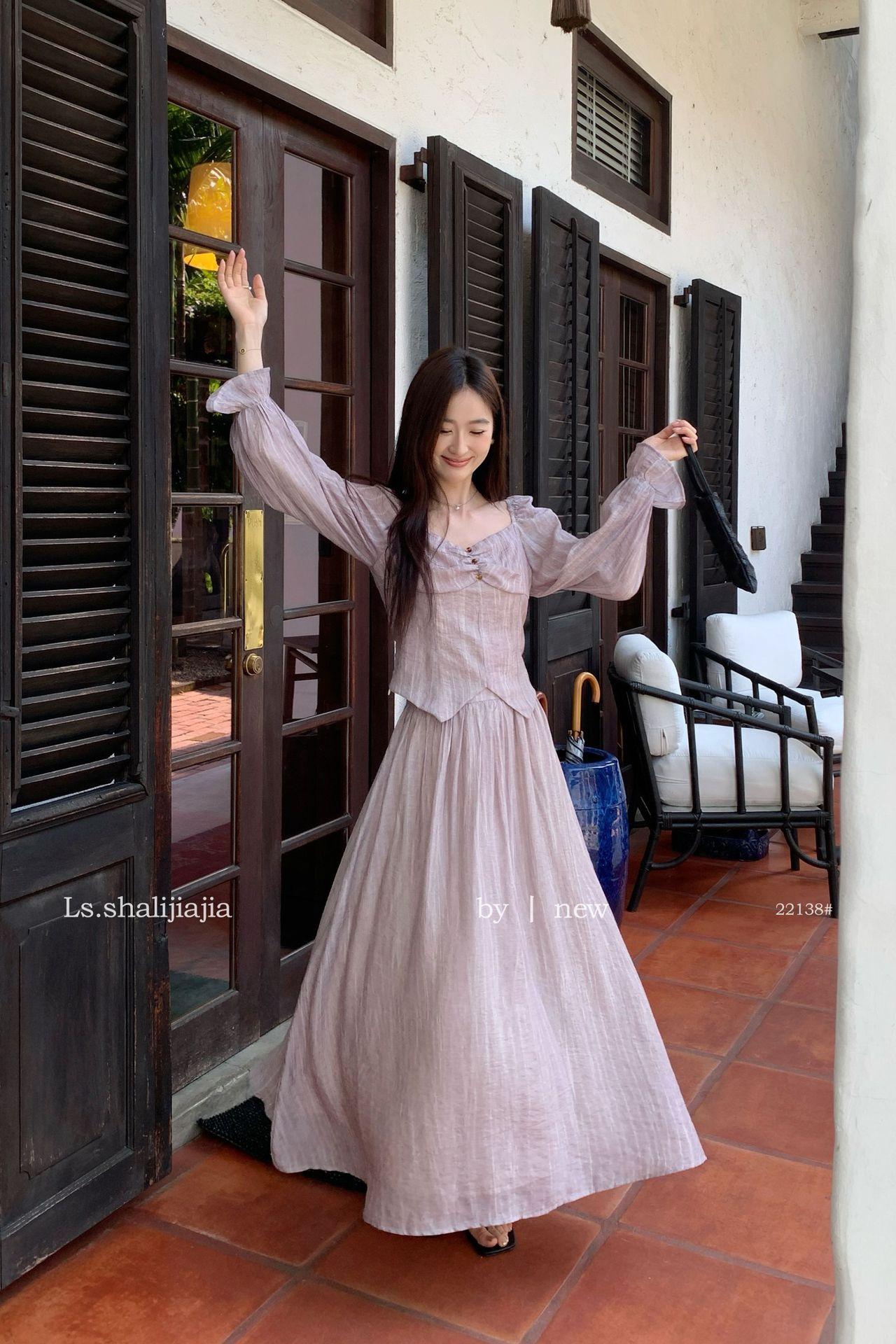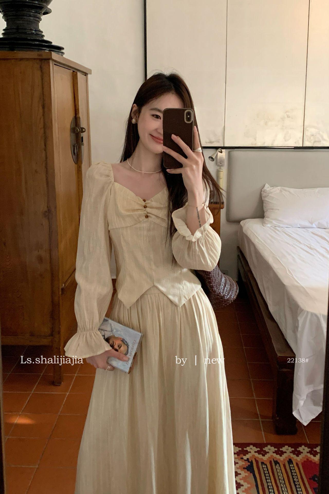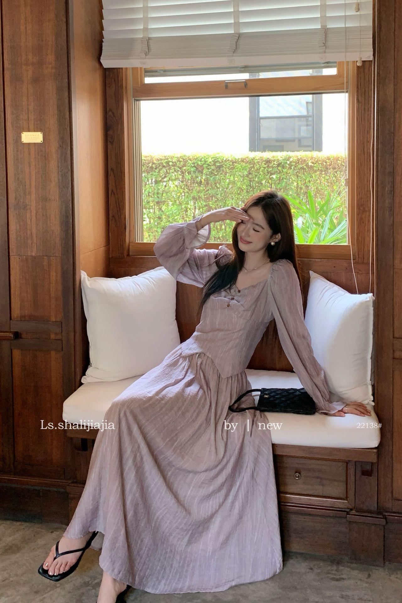 Conjunto de dos piezas de falda y top de cuello cuadrado suave de manga larga para mujer Guangzhou Trece Líneas 25 Años Primavera Nuevo traje 22138