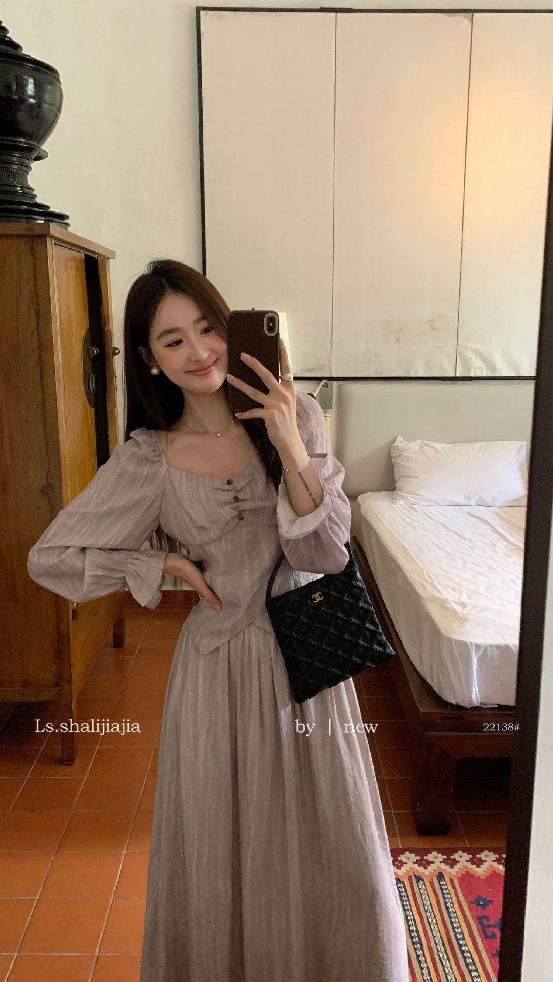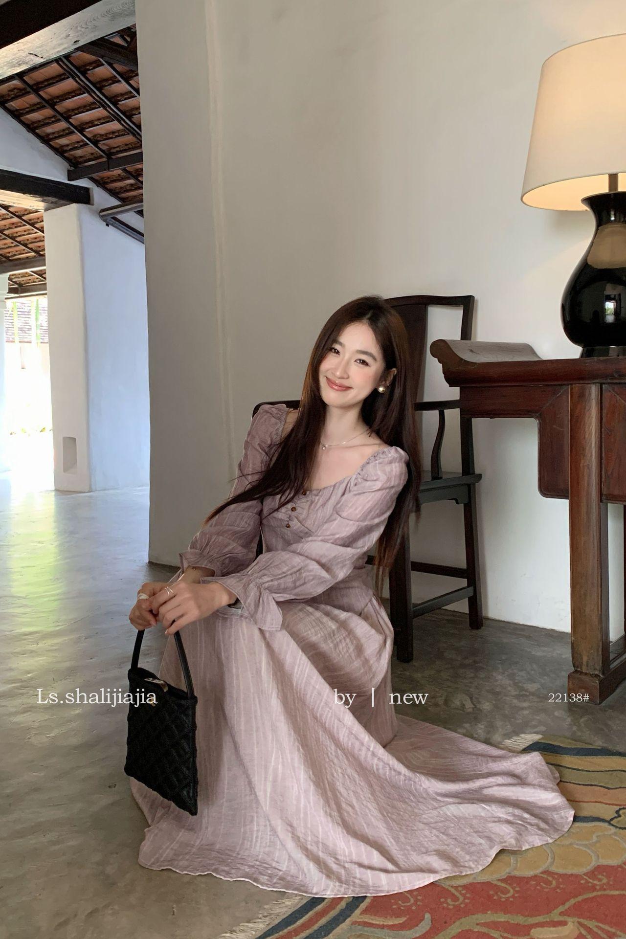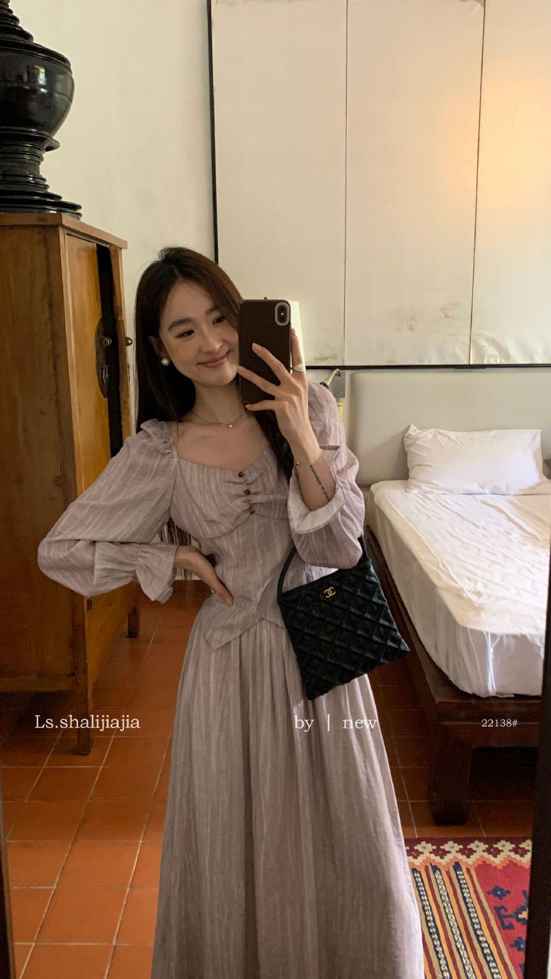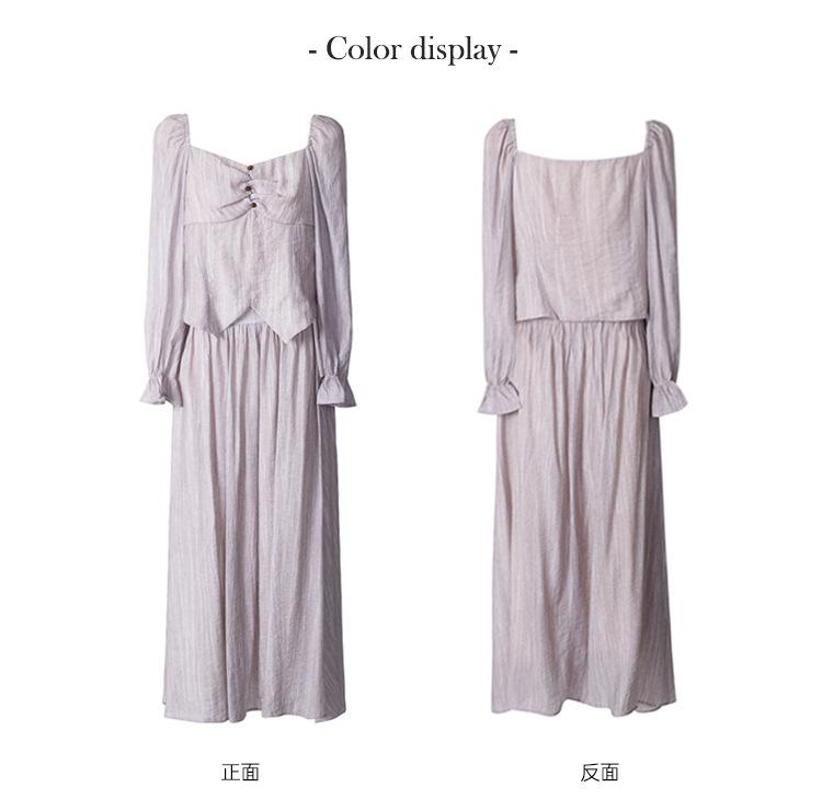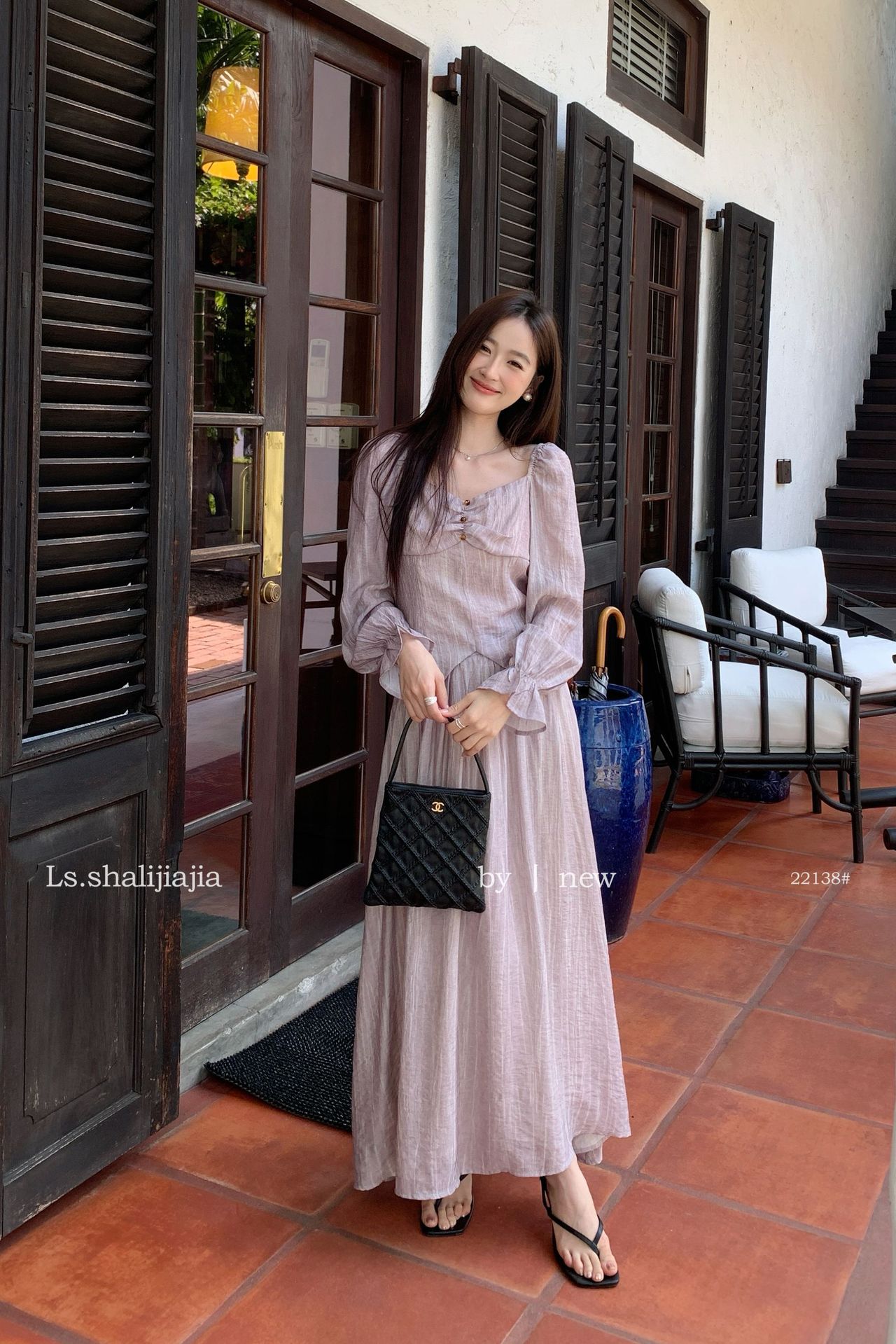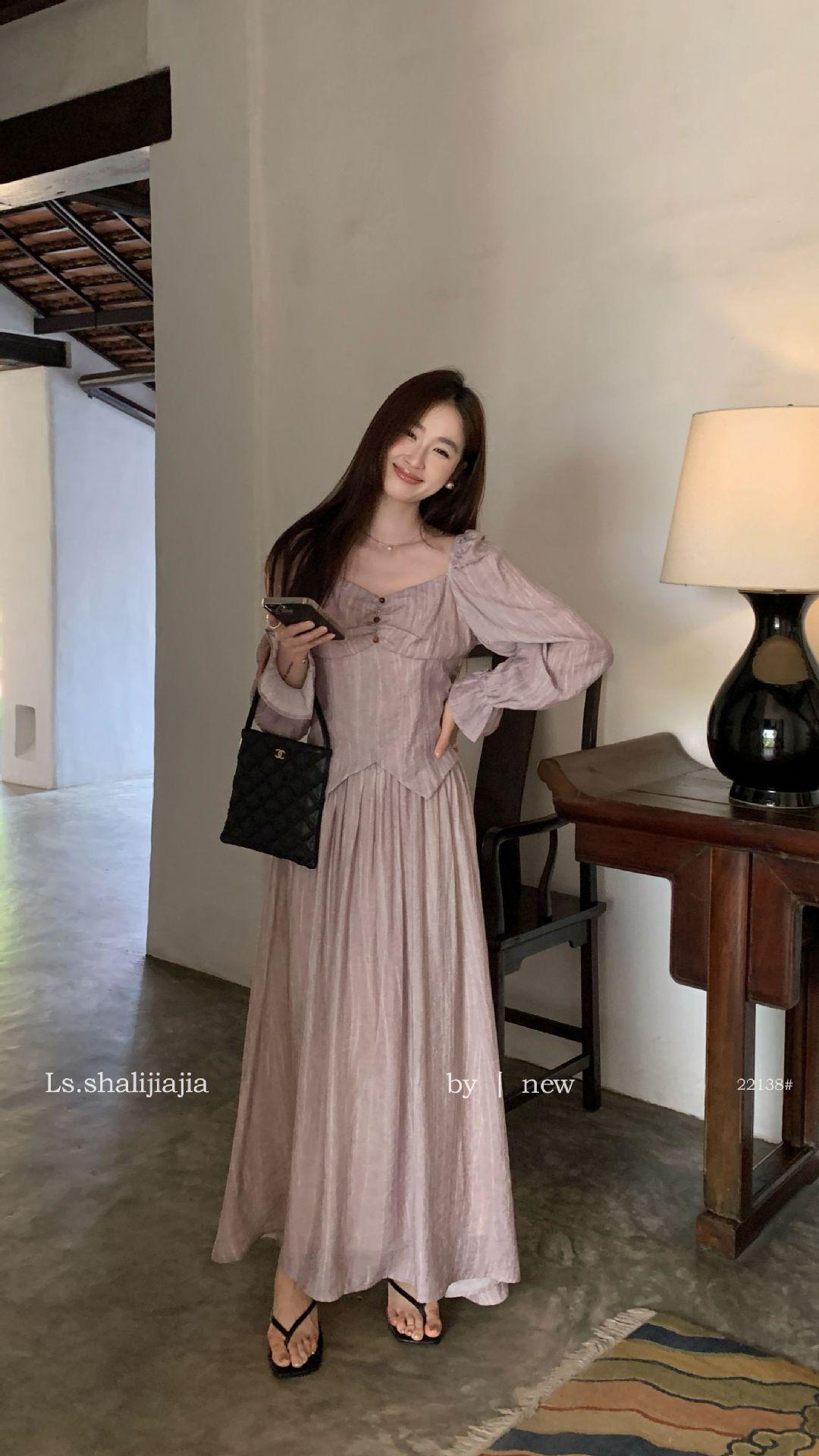 Conjunto de dos piezas de falda y top de cuello cuadrado suave de manga larga para mujer Guangzhou Trece Líneas 25 Años Primavera Nuevo traje 22138