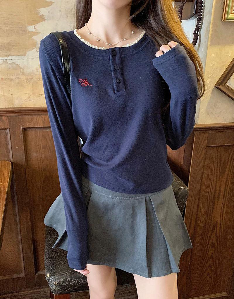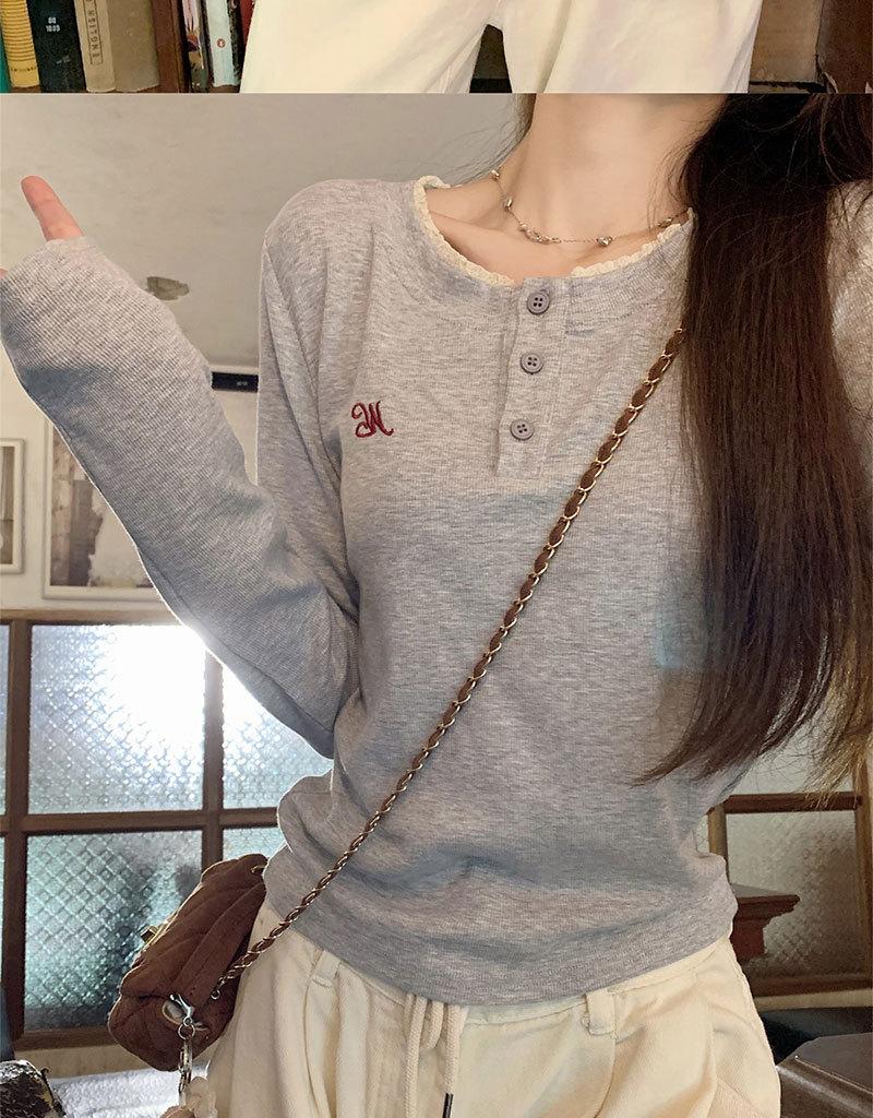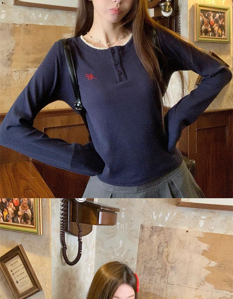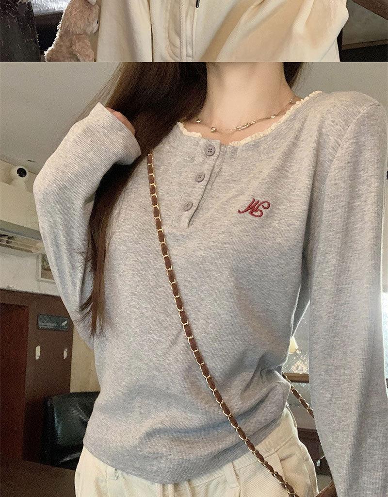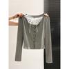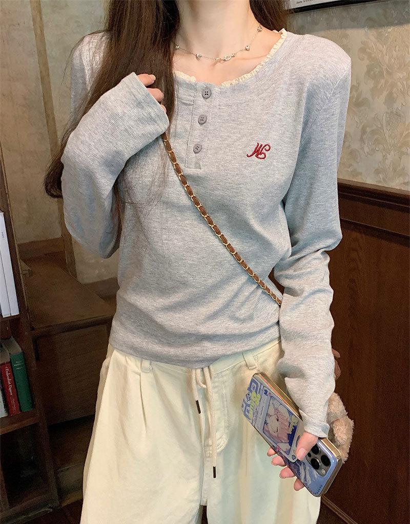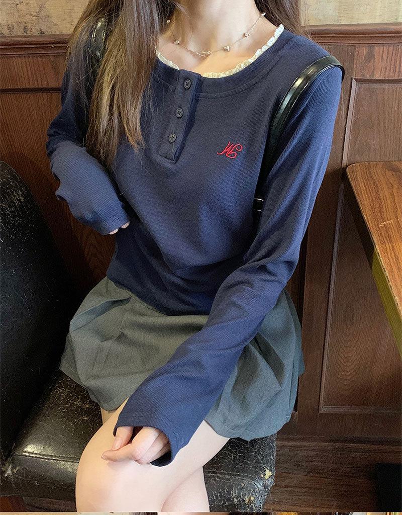 Otoño Estilo Coreano Dulce Encaje Diseño de Empalme Camiseta Falsa de Dos Piezas de Manga Larga