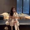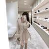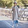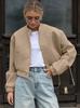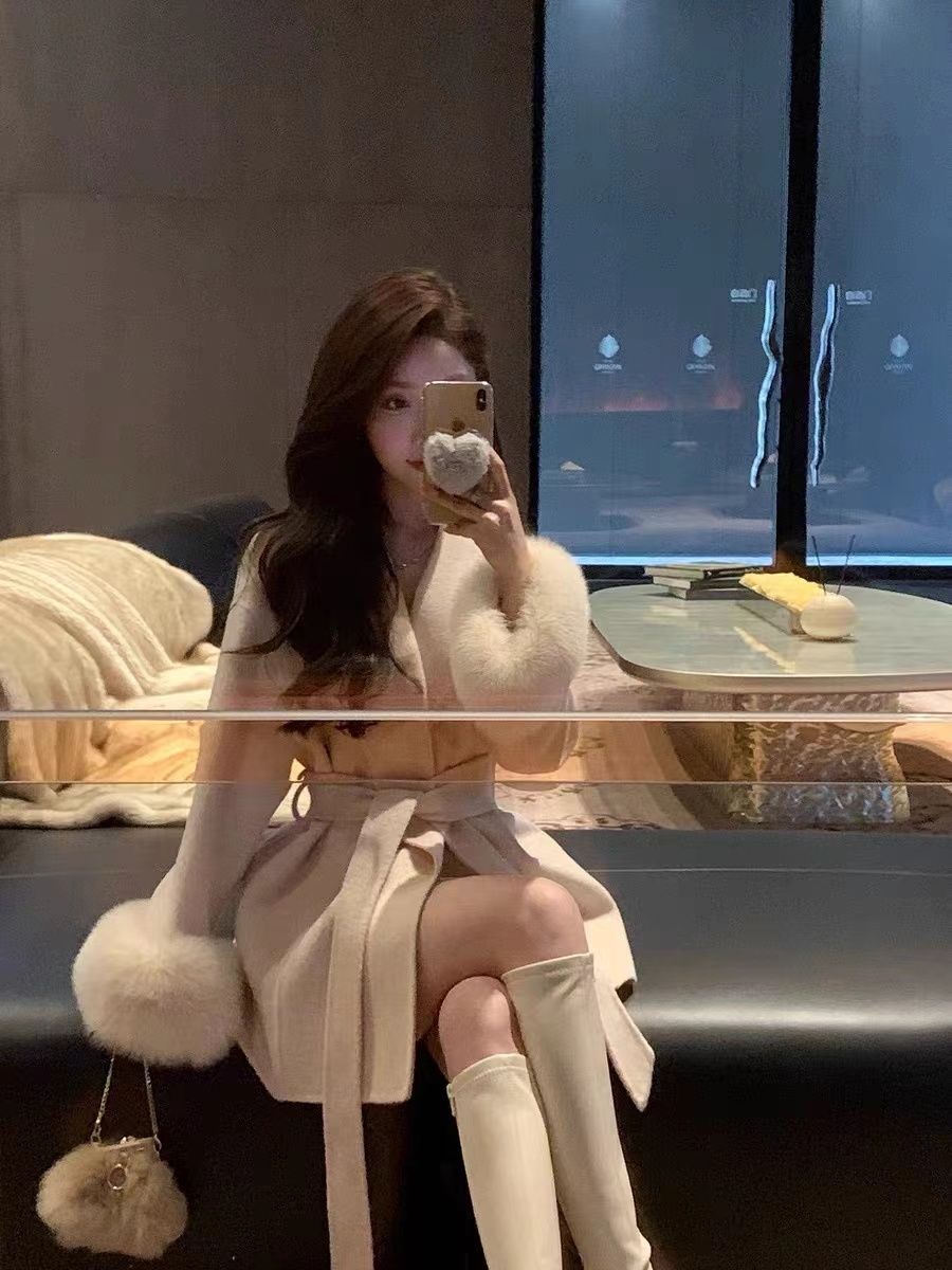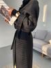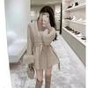 Elegante abrigo de lana de manga larga color albaricoque para mujer, cárdigan de lana con tirantes y cintura ajustada de alta gama para otoño e invierno.