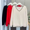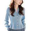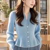 Shanli Dadi [Fashion Joker] Camisa de punto de manga larga con cuello en V azul estilo Chanel para mujer, nuevo estilo de otoño para celebridades