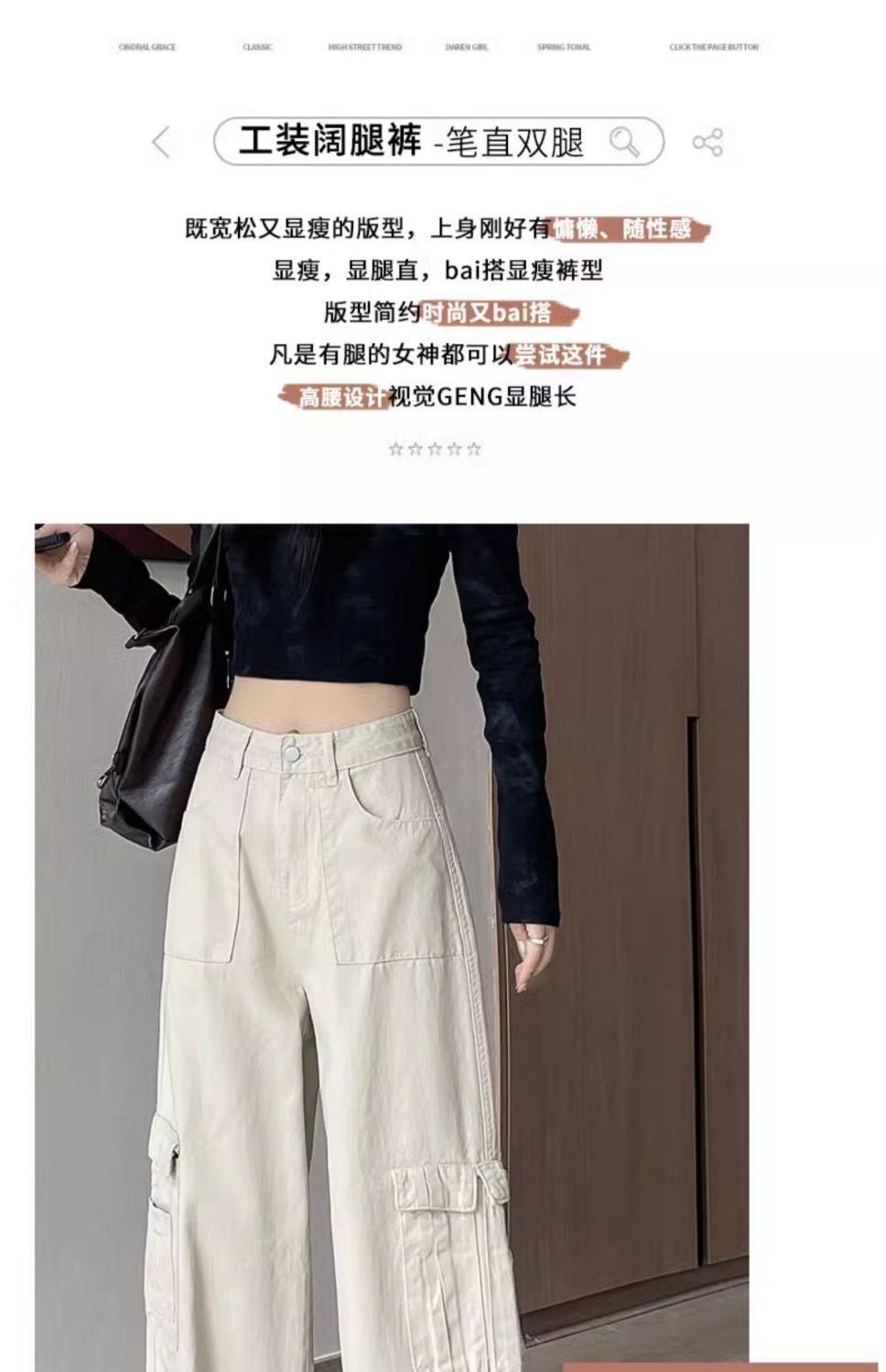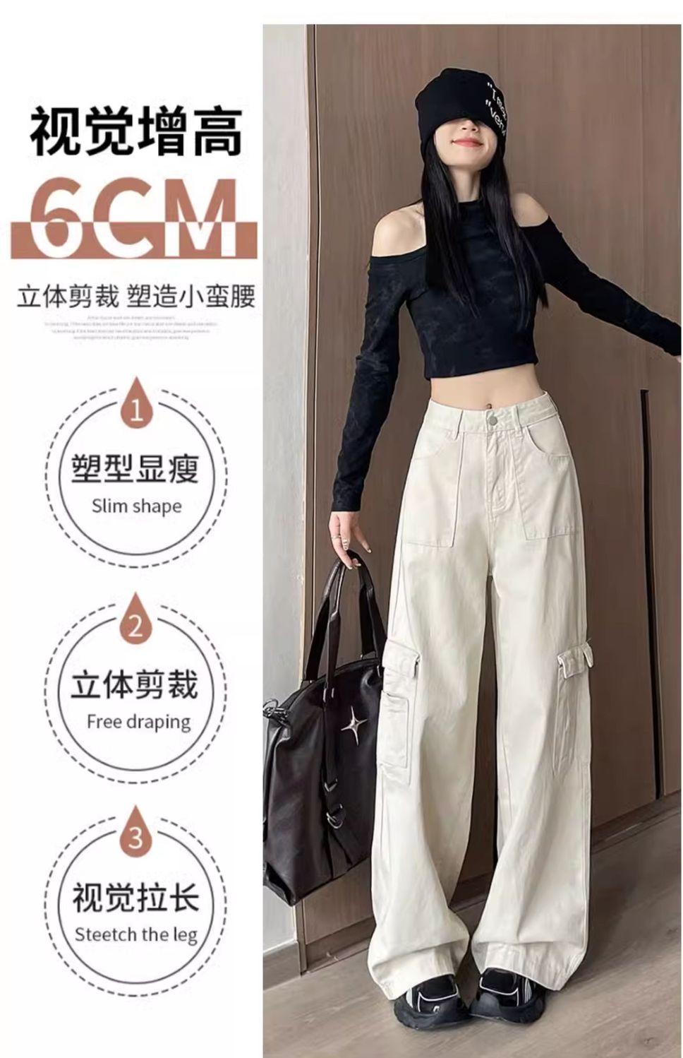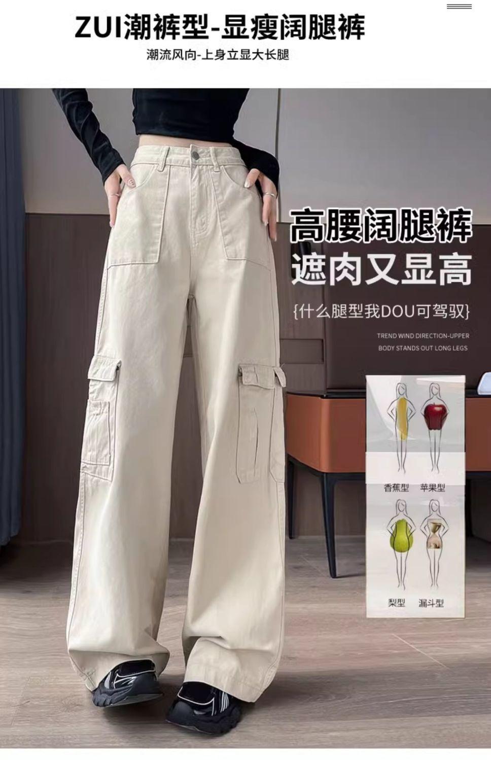 Diseño de cintura alta que cubre el sentido de la primavera. Nueva hermana gordita que cubre los pantalones vaqueros de pierna ancha. Ropa de mujer suelta que luce alta y delgada.