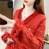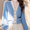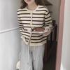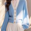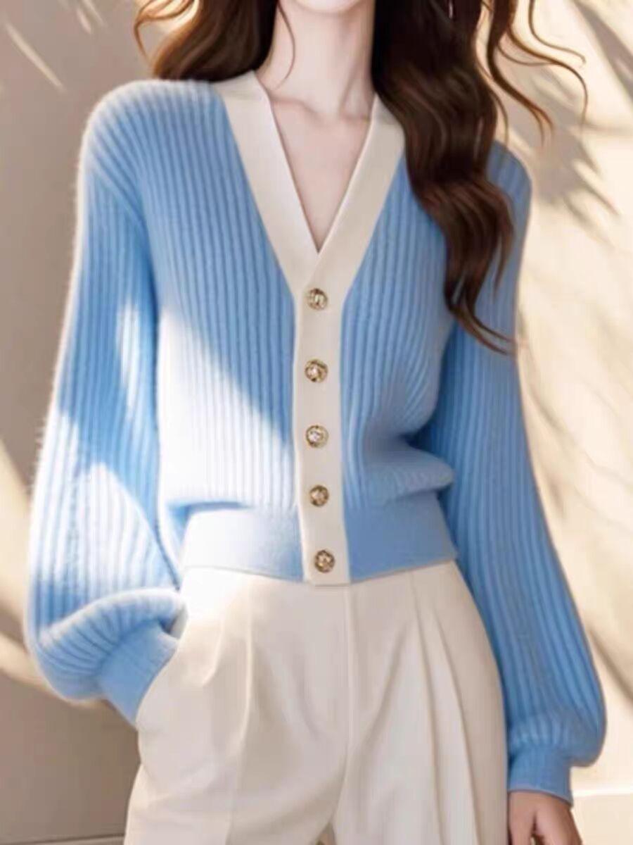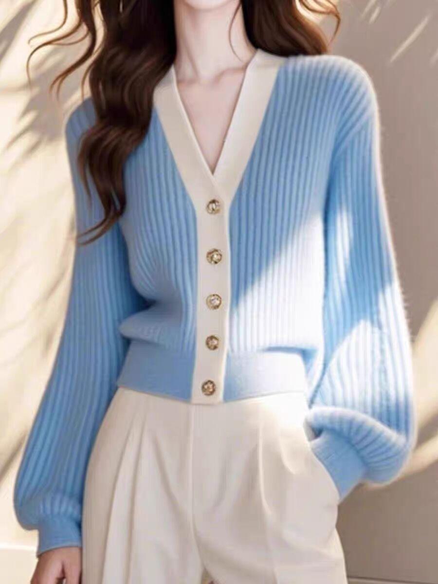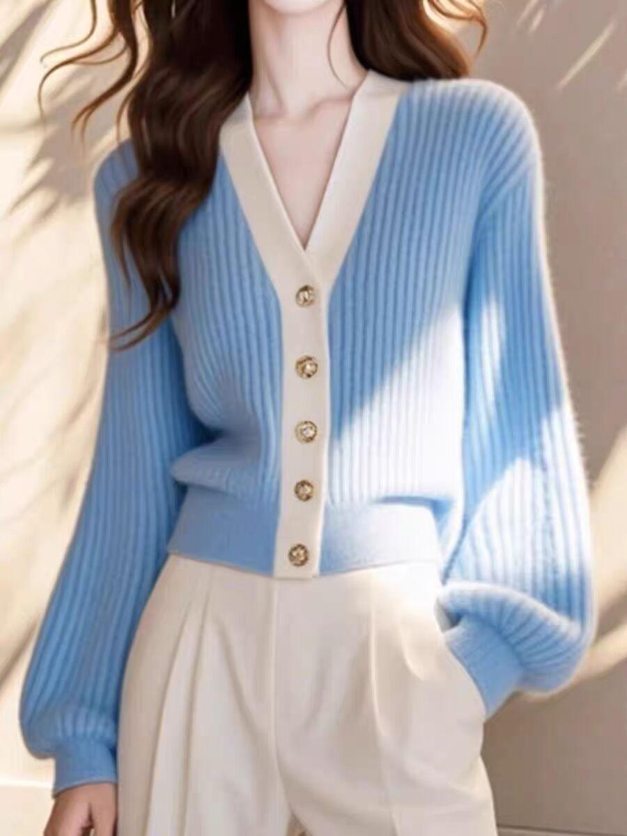 Vestido de primavera 2025 para mujer, cárdigan de punto holgado con cuello en V y contraste de colores de Chanel