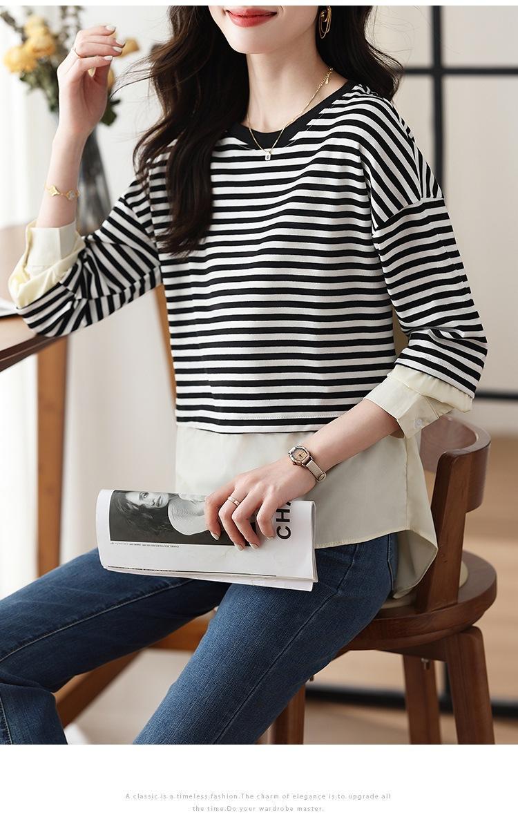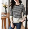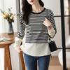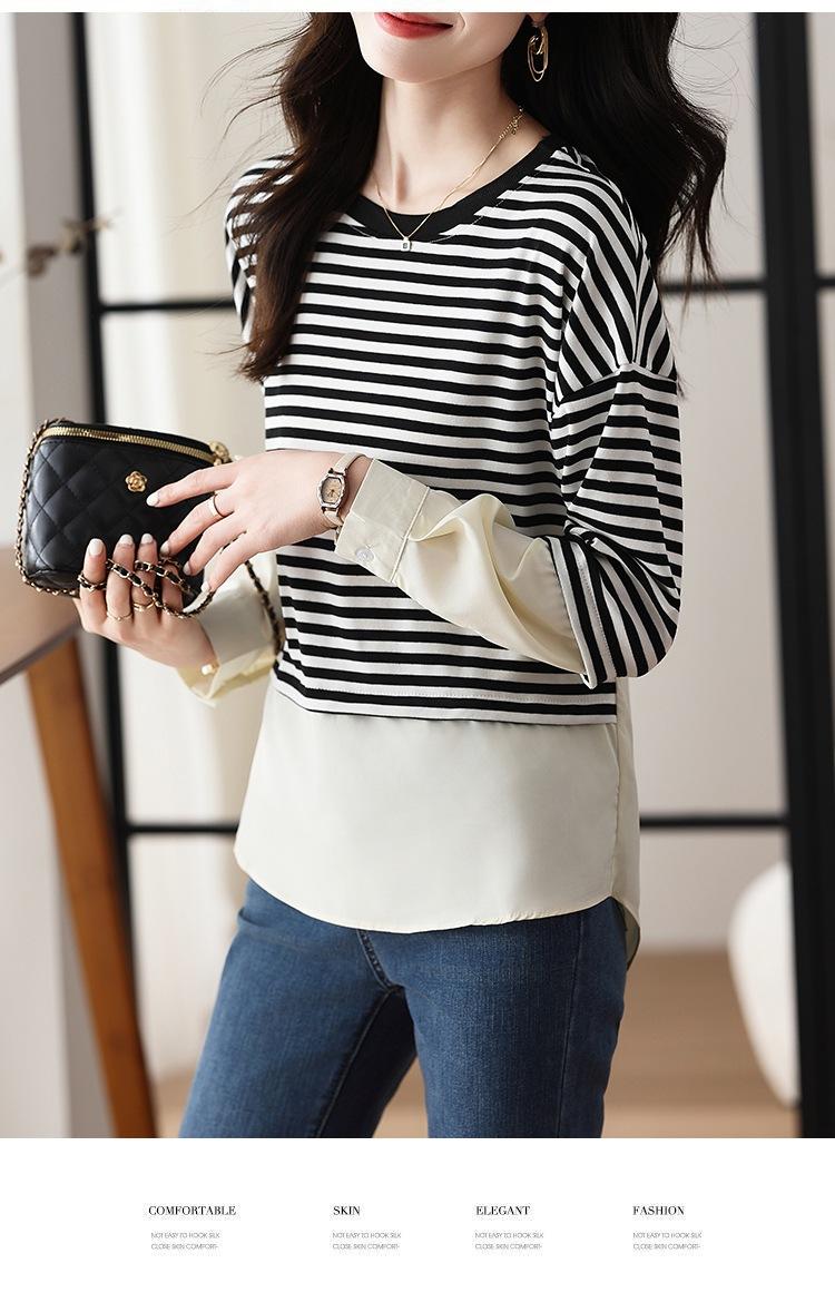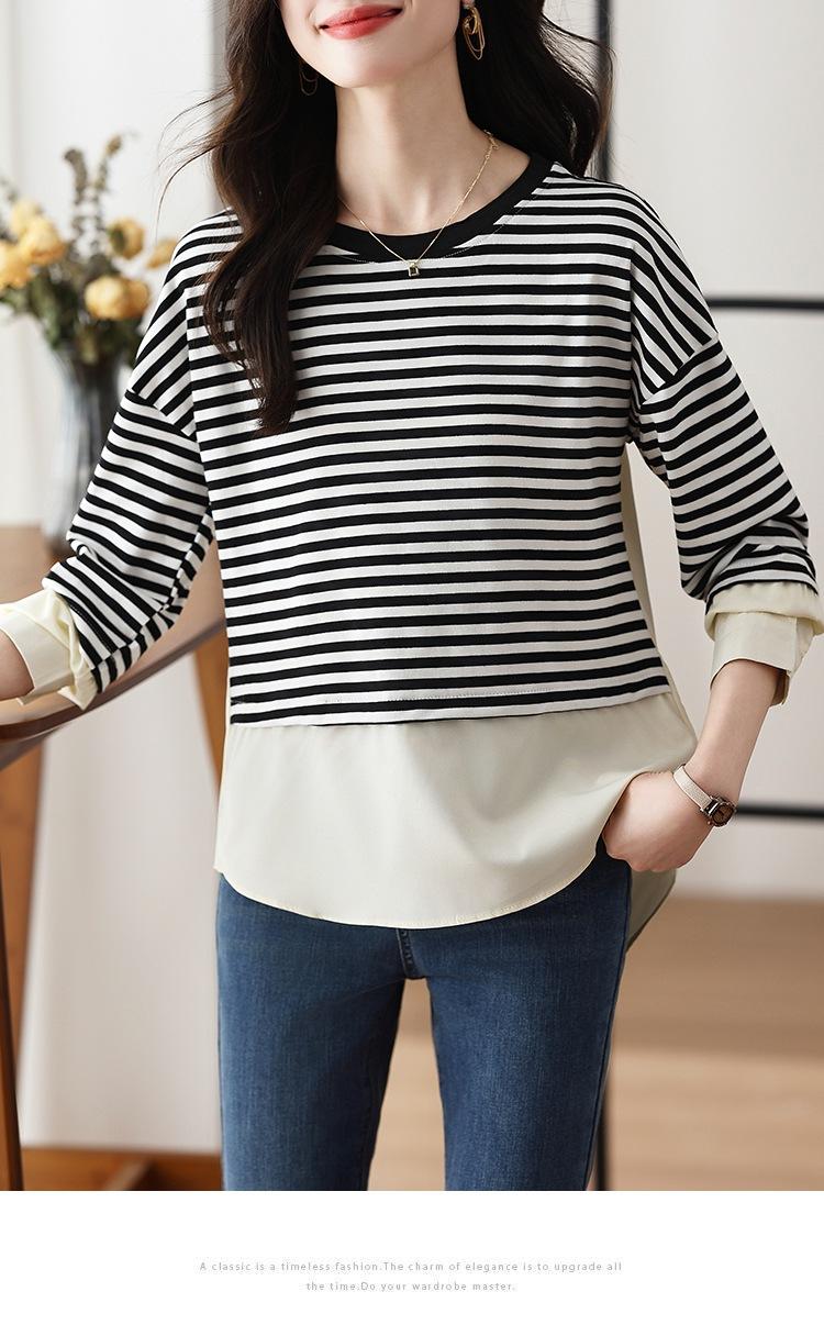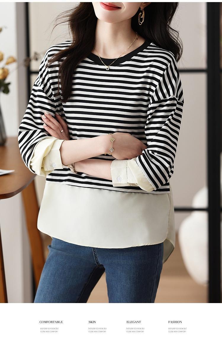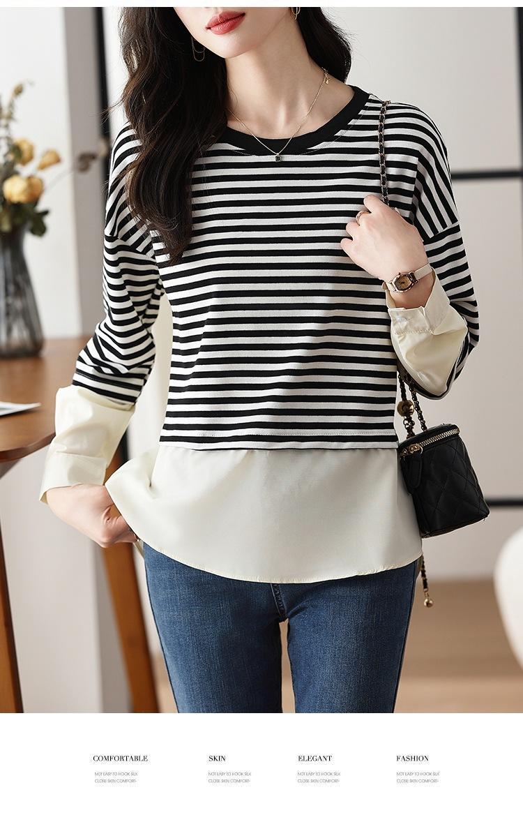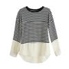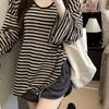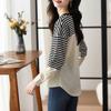 Camiseta informal de manga larga holgada con cuello redondo y costuras de colores contrastantes a rayas para mujer