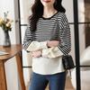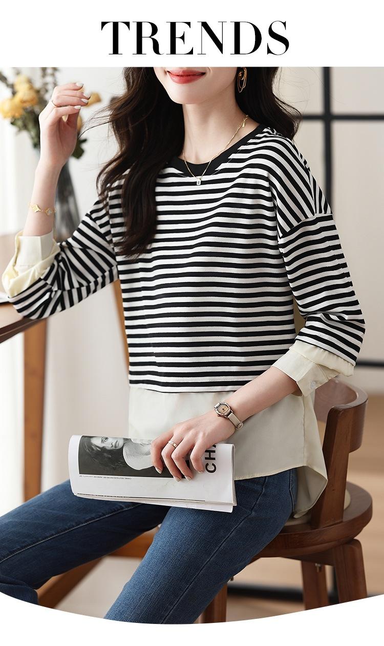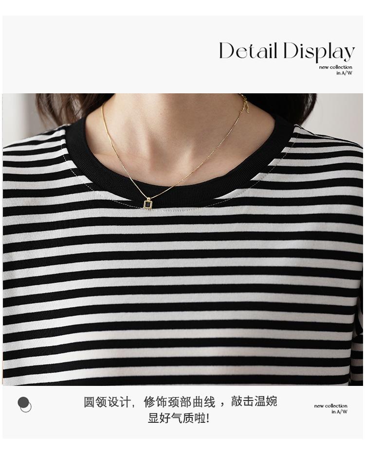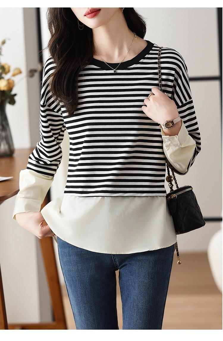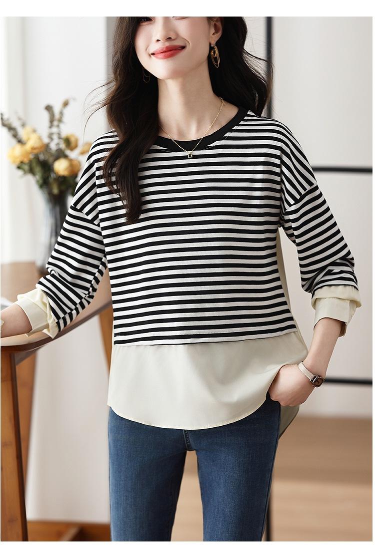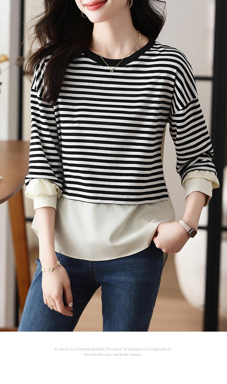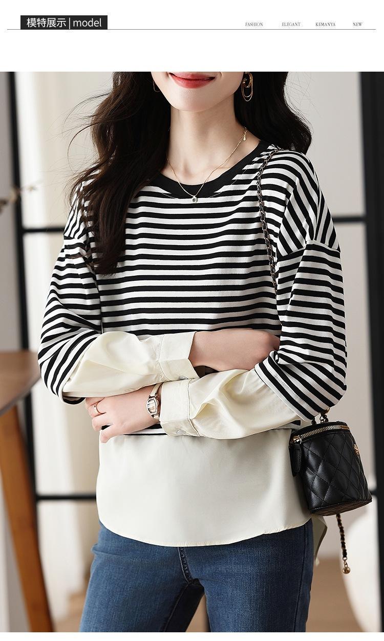 Camiseta informal de manga larga holgada con cuello redondo y costuras de colores contrastantes a rayas para mujer