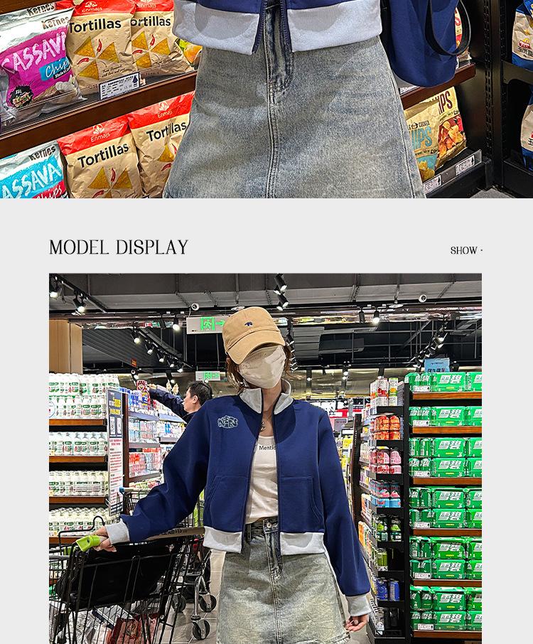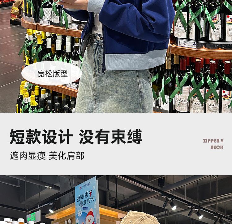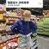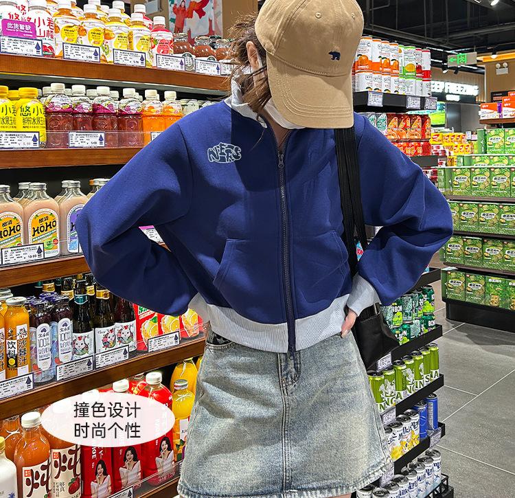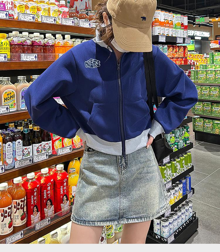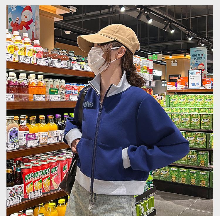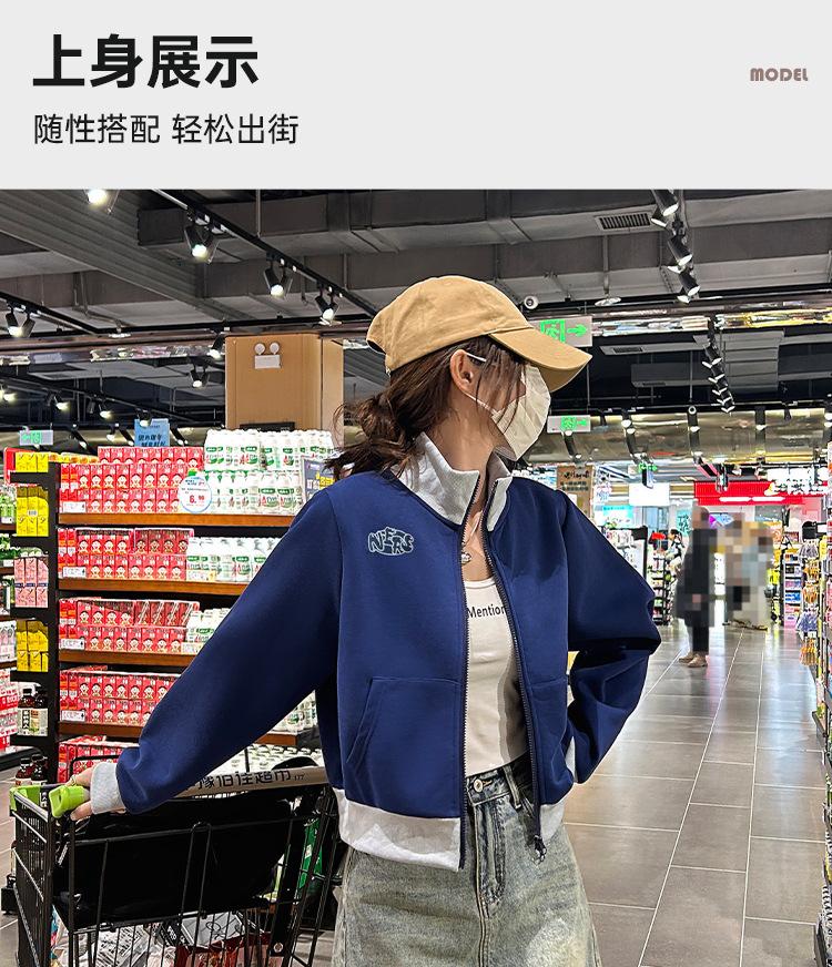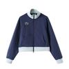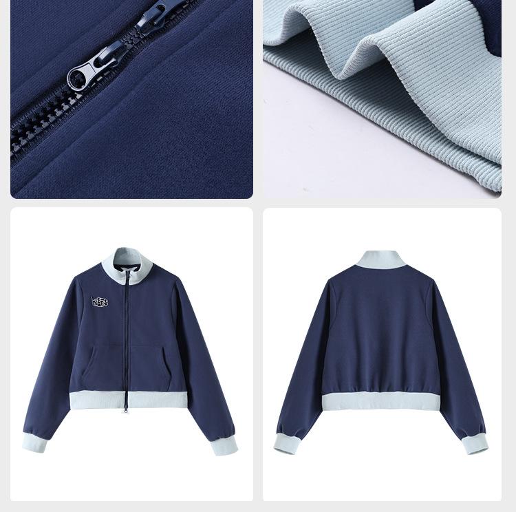Suéter corto azul para mujer, abrigo de primavera y otoño de 2025, nuevo cárdigan con cuello pequeño y cremallera en contraste de color para hombre.