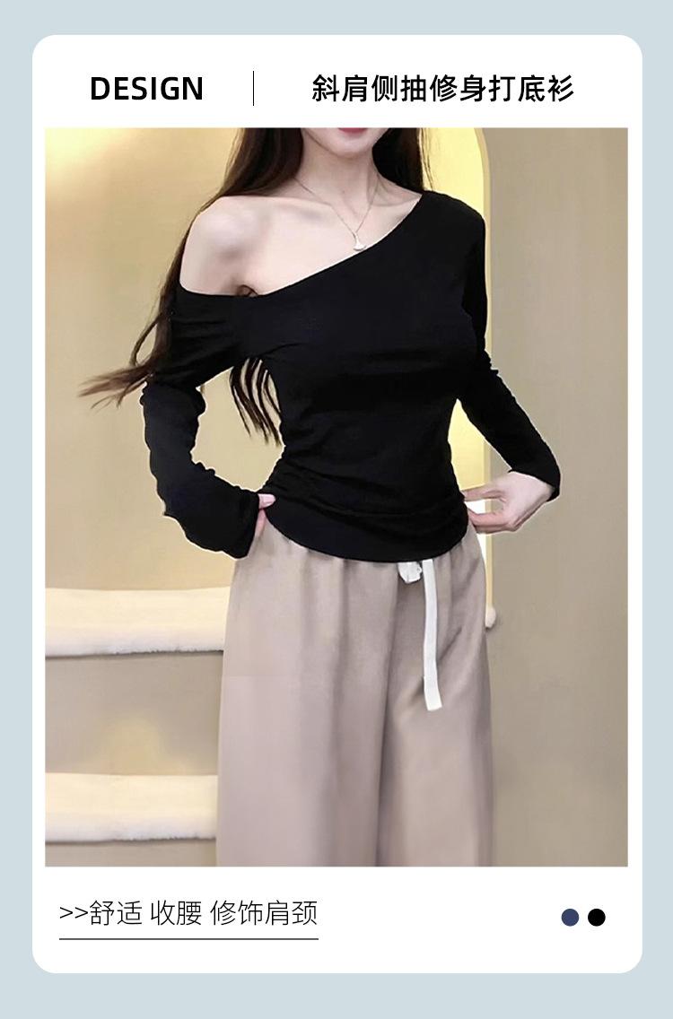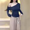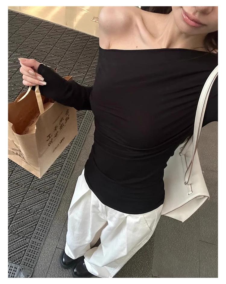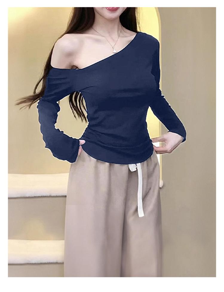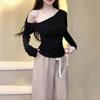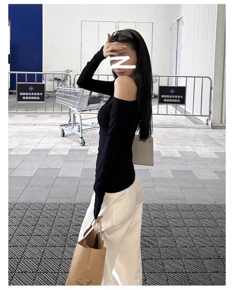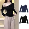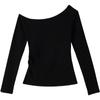 Camiseta de Manga Larga de Primavera Temprana de Corte Slim Ajustado Adelgazante Hombro-Hombro Puro Spice Girl Sentido del Diseño Nicho Hombro Inclinado Combinación Universal Camiseta Base Top
