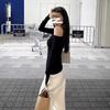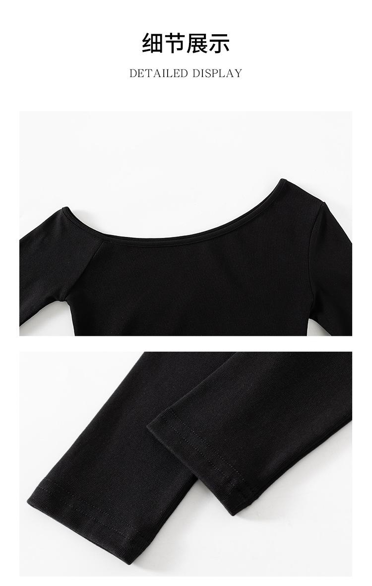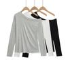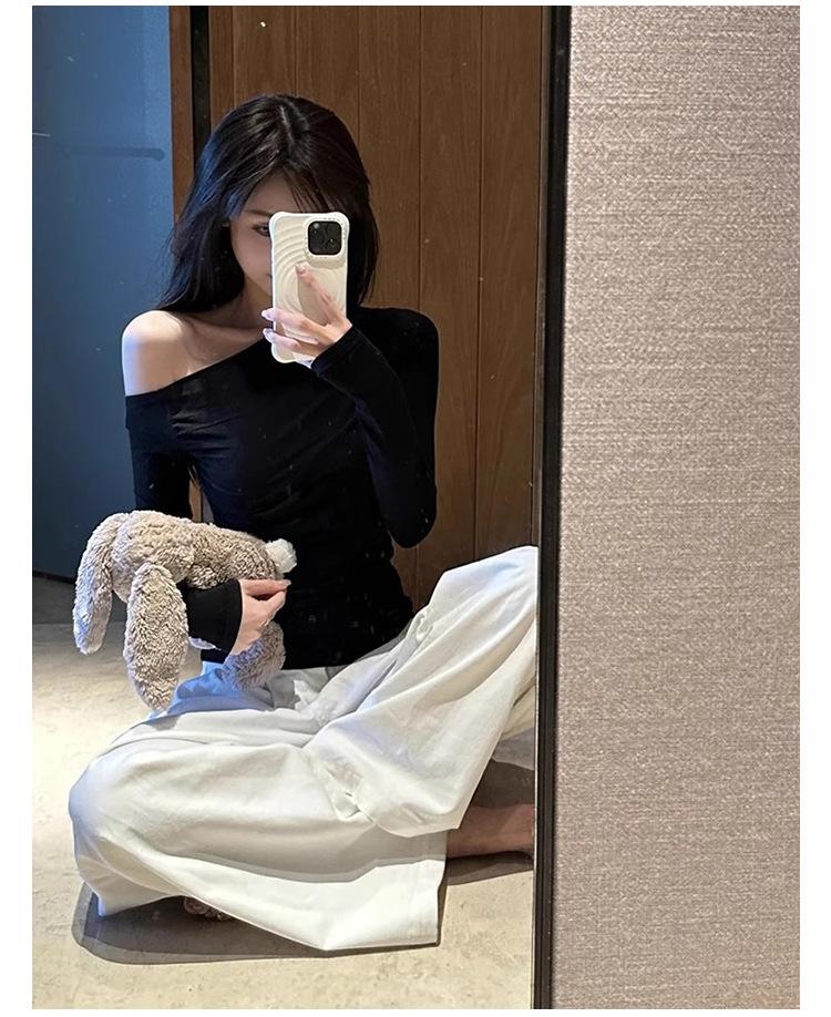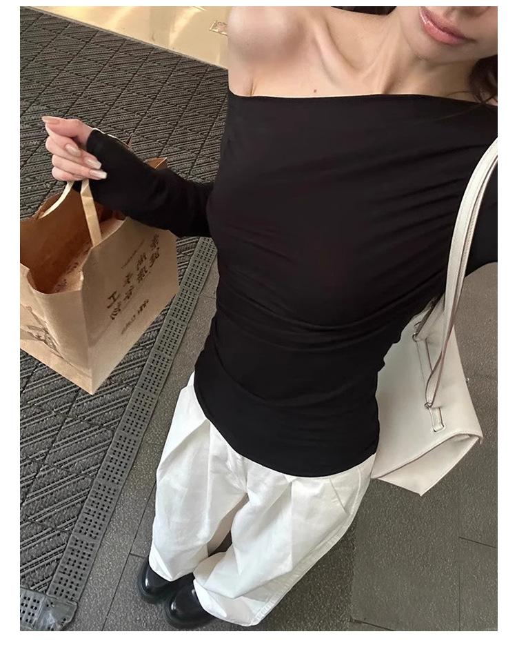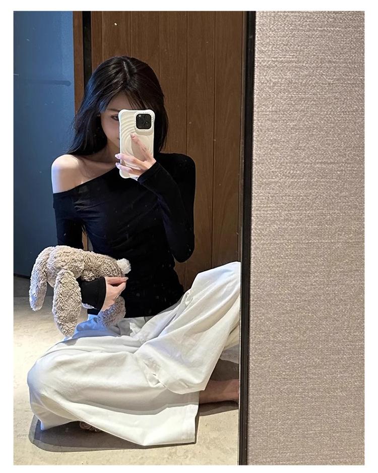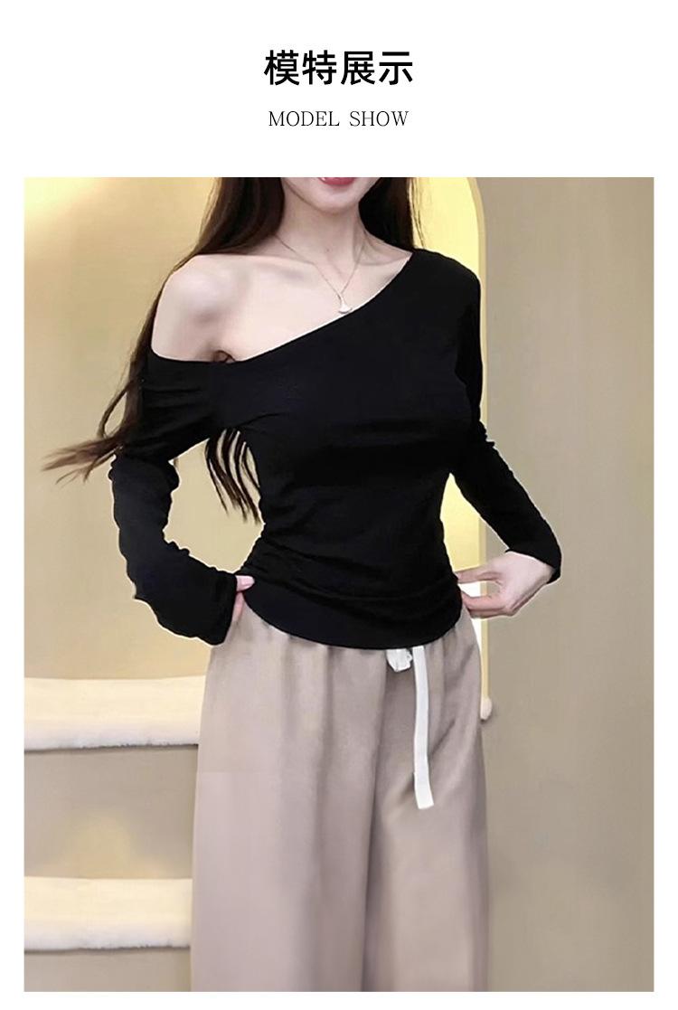 Camiseta de Manga Larga de Primavera Temprana de Corte Slim Ajustado Adelgazante Hombro-Hombro Puro Spice Girl Sentido del Diseño Nicho Hombro Inclinado Combinación Universal Camiseta Base Top