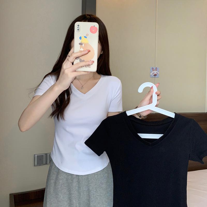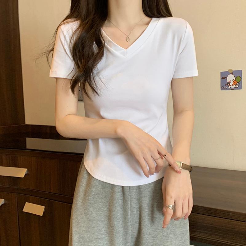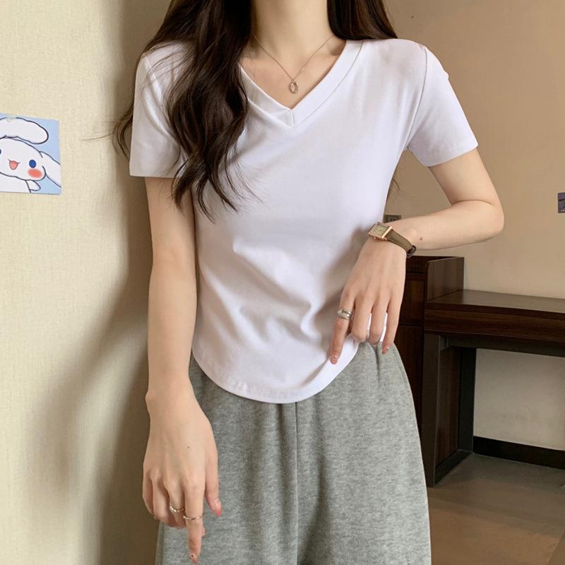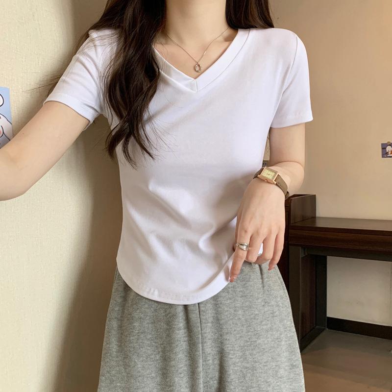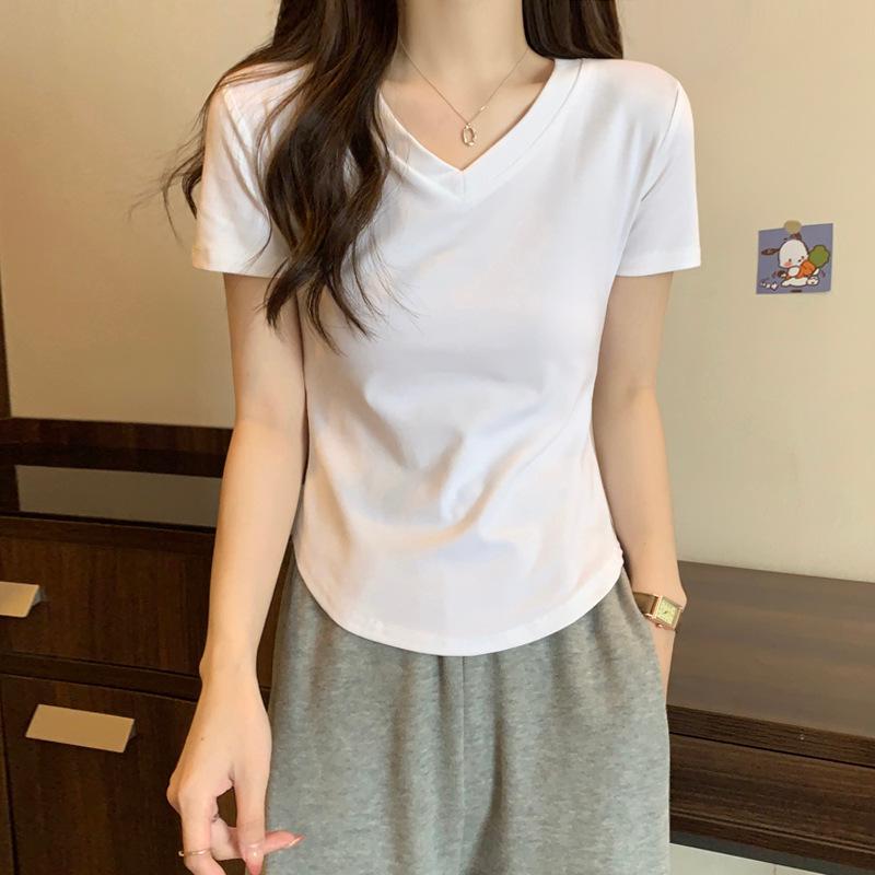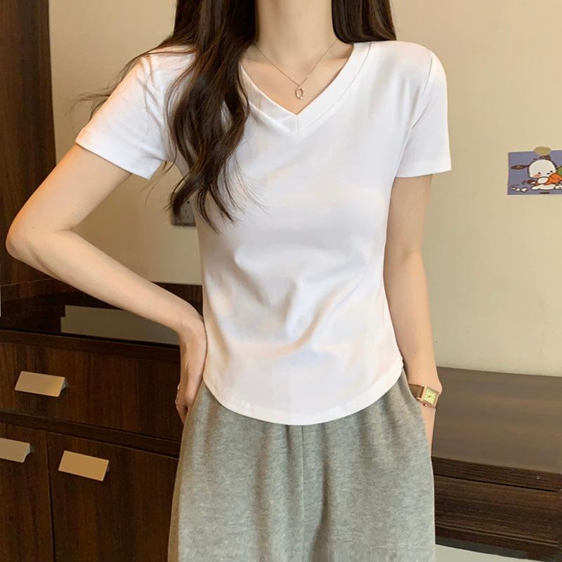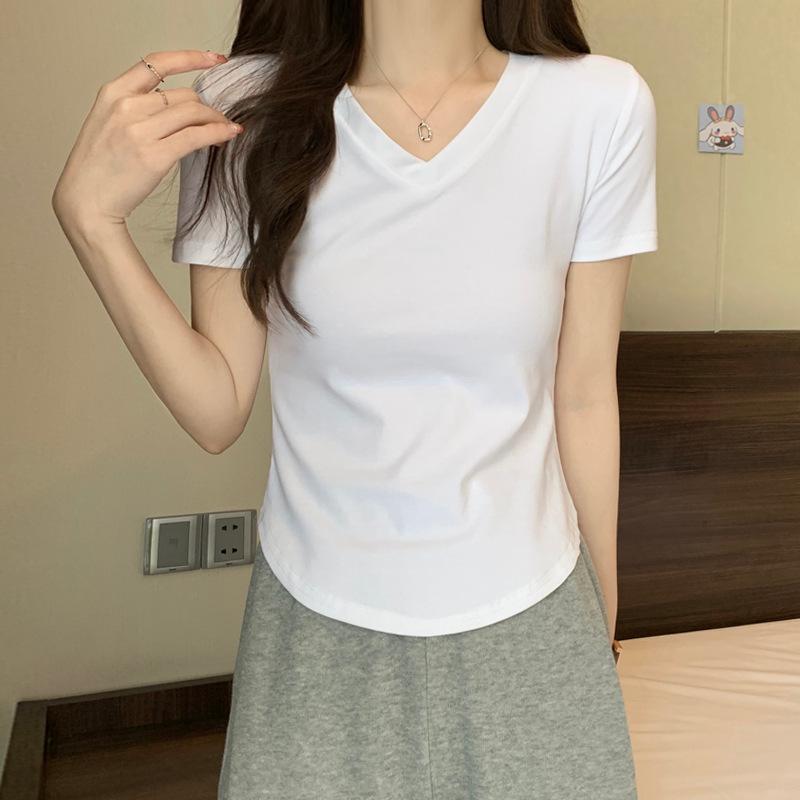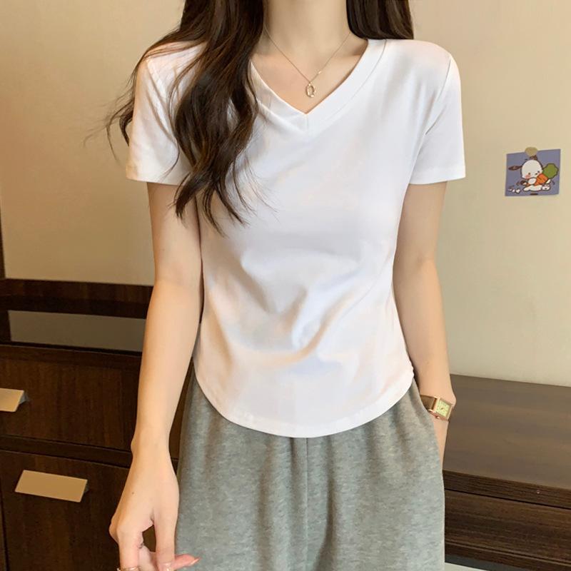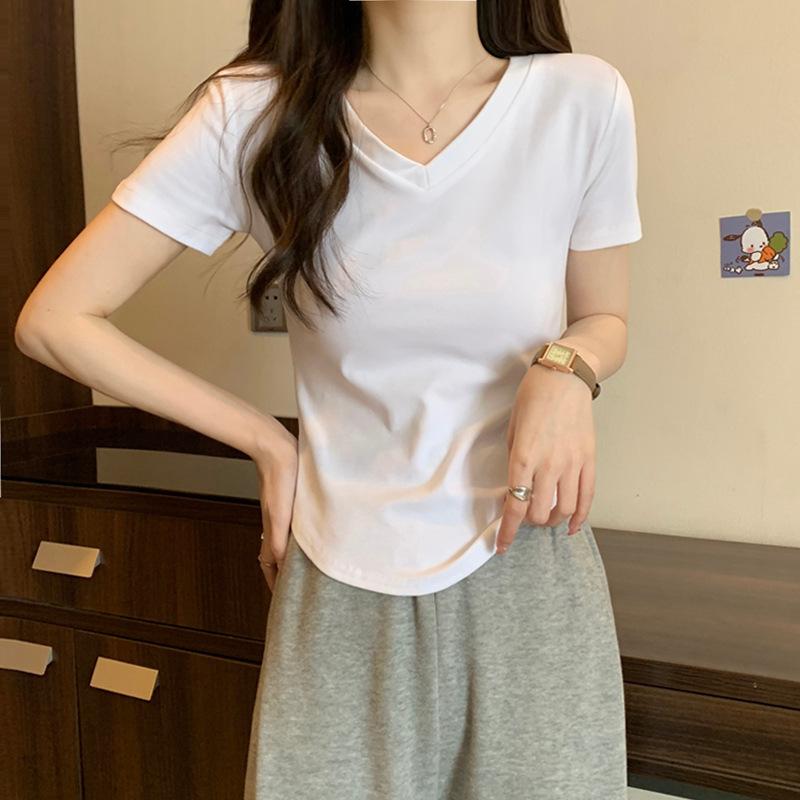 Playera Blanca de Algodón Puro con Cuello en V para Mujer de Manga Corta 2024 Nuevo Verano Básica Top de Manga Corta con Hombro Derecho Descubierto para Personas Pequeñas